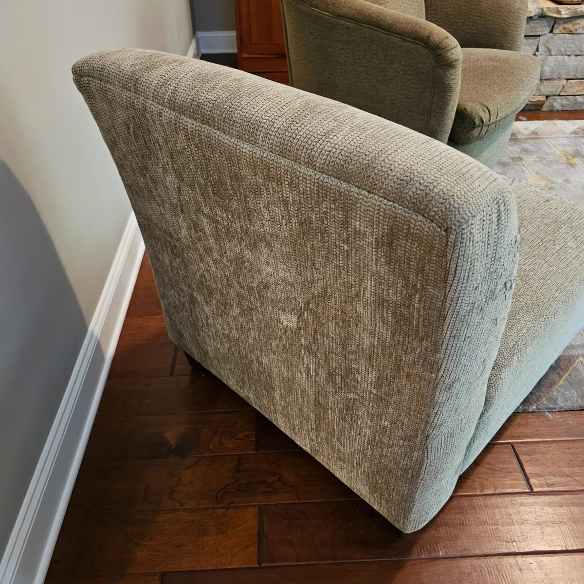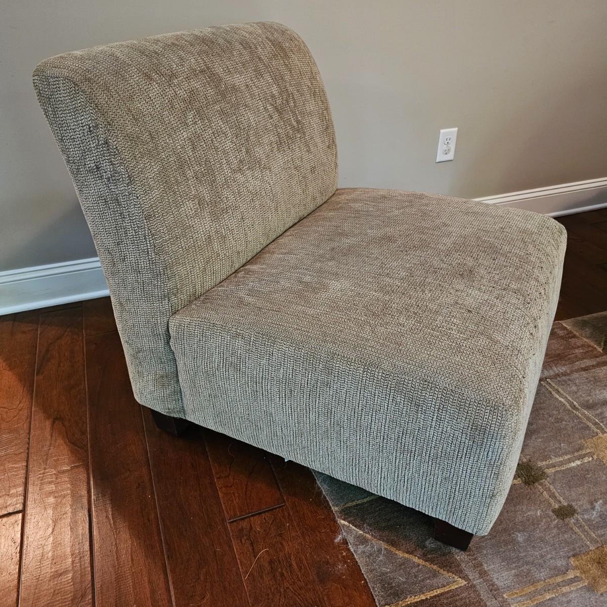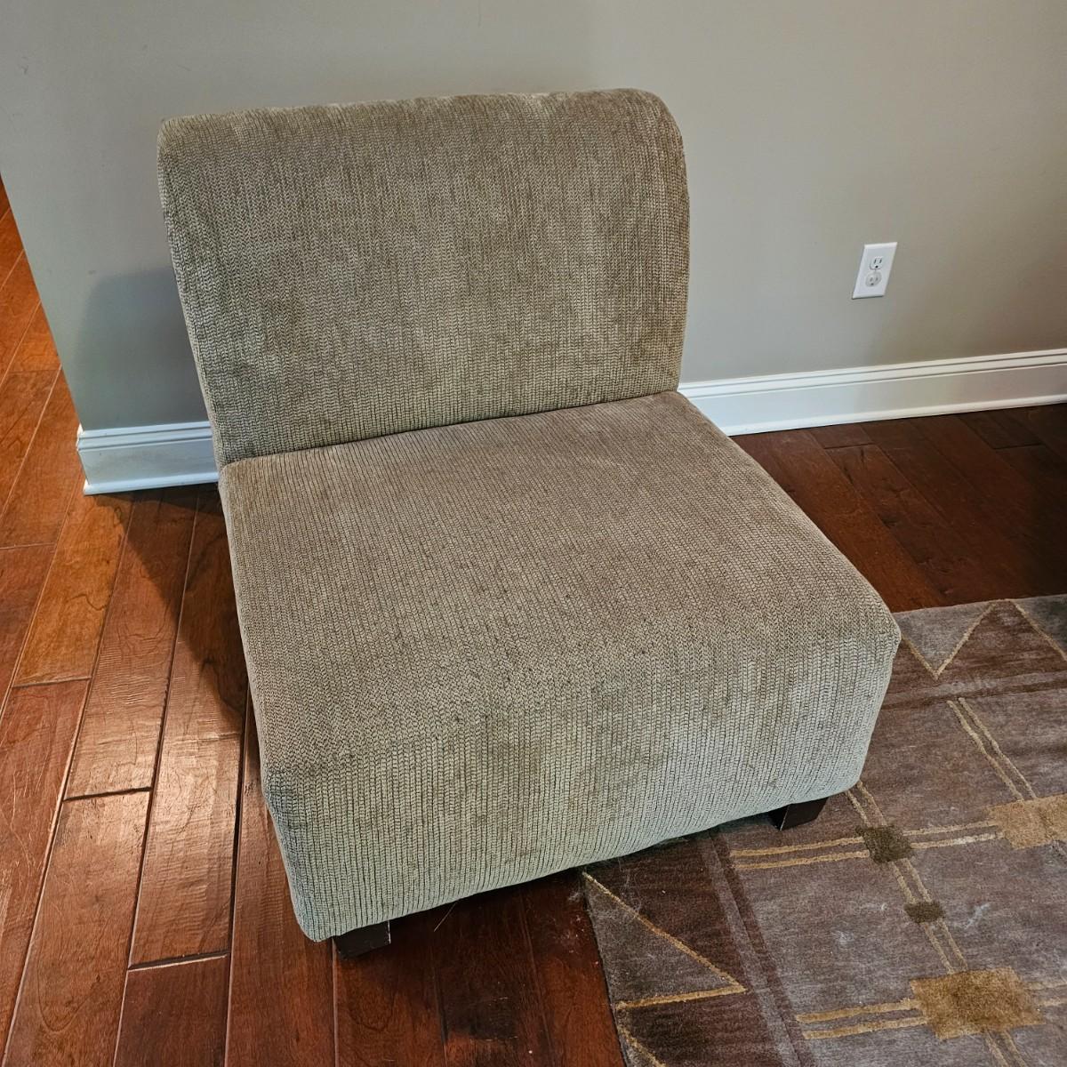 Upholstered grey armless chair, can be connected in sectional style. Chair measures 31" x 34" x 32"H, has seat height of 17". Please note small pulls in fabric seat front. See photos for details. Local pickup only.