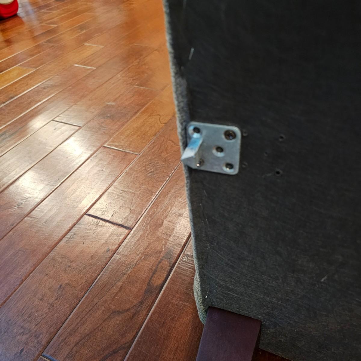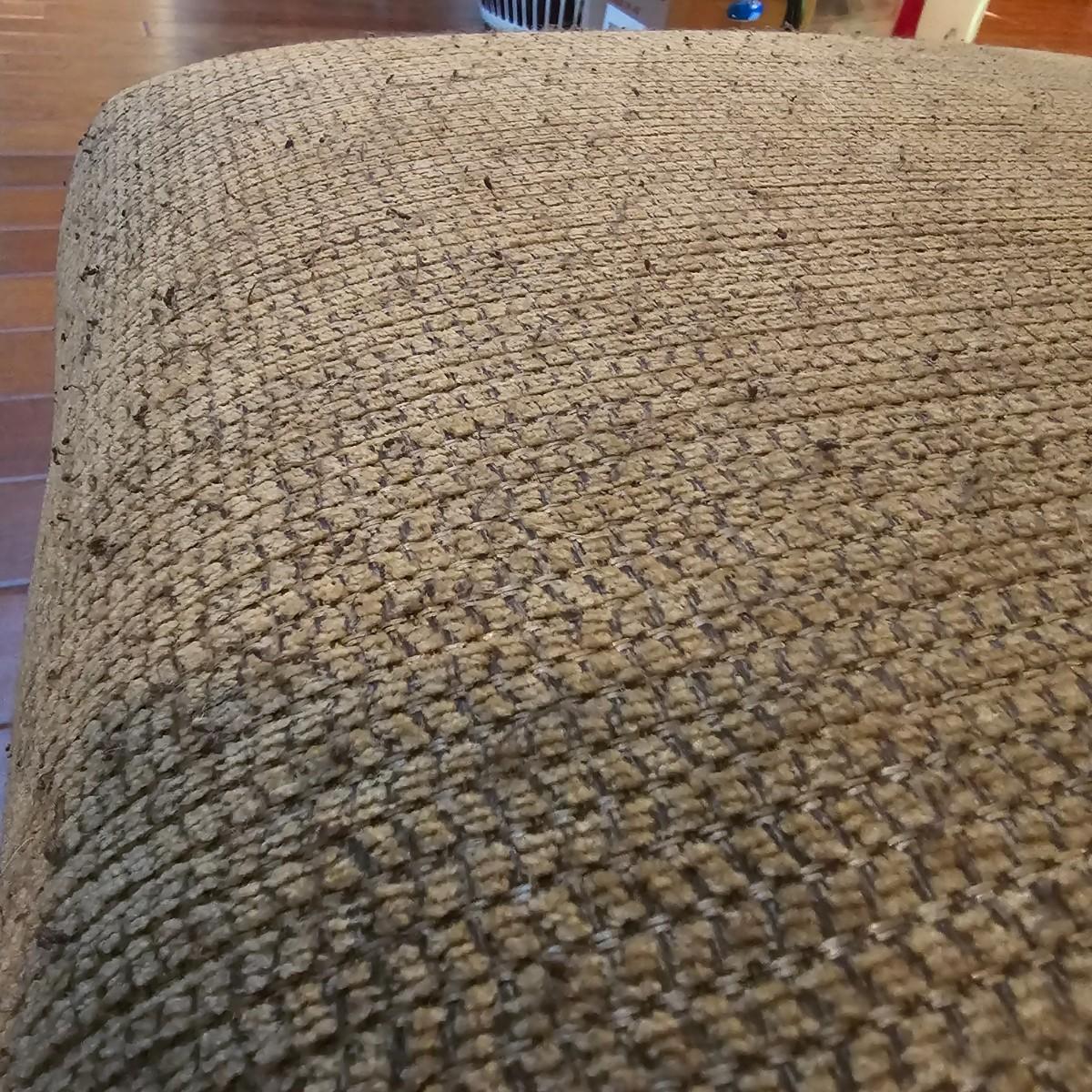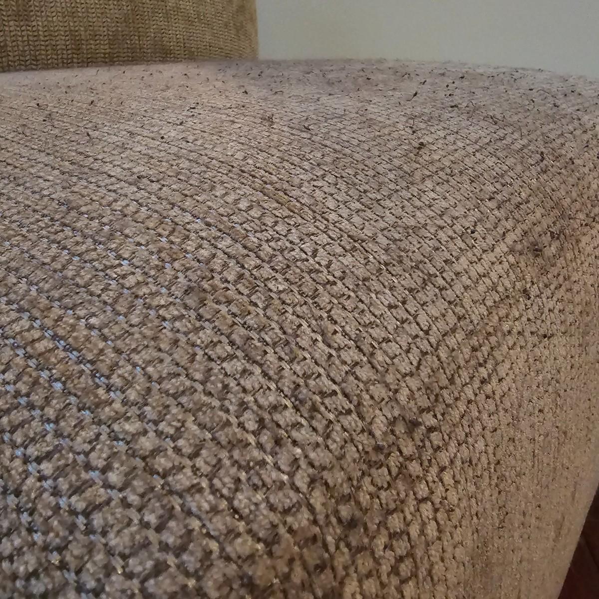 Upholstered grey armless chair, can be connected in sectional style. Chair measures 31" x 34" x 32"H, has seat height of 17". Please note small pulls in fabric seat front. See photos for details. Local pickup only.