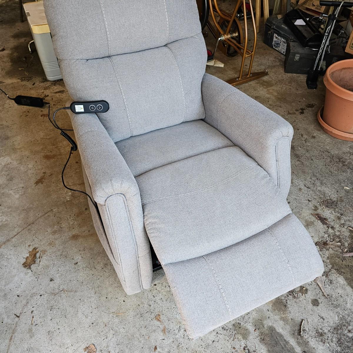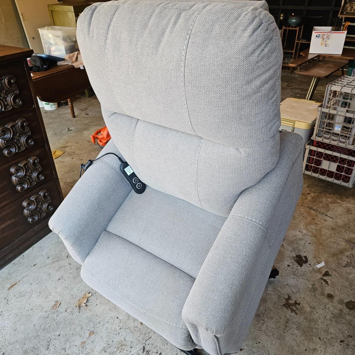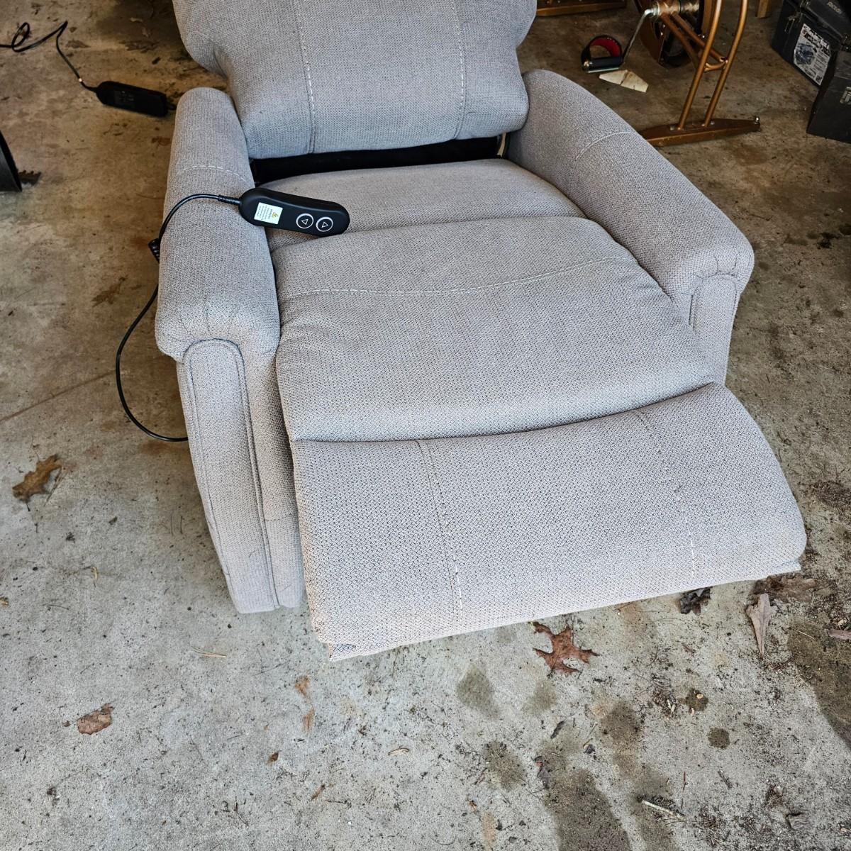 Dove grey fabric on this Ashley Furniture power lift reclining chair. Has side pocket for controls and power box. Simple two button up/down operation. Chair raises to full standing height and reclines almost horizontal. Chair at standard position measures 30" x 33" x 40" H. Smooth, quiet motion of operation. Chair powered on when plugged in. See photos for details. Local pickup only. Winning bidder must bring assistance to help move and load this item due to its weight and/or size.
