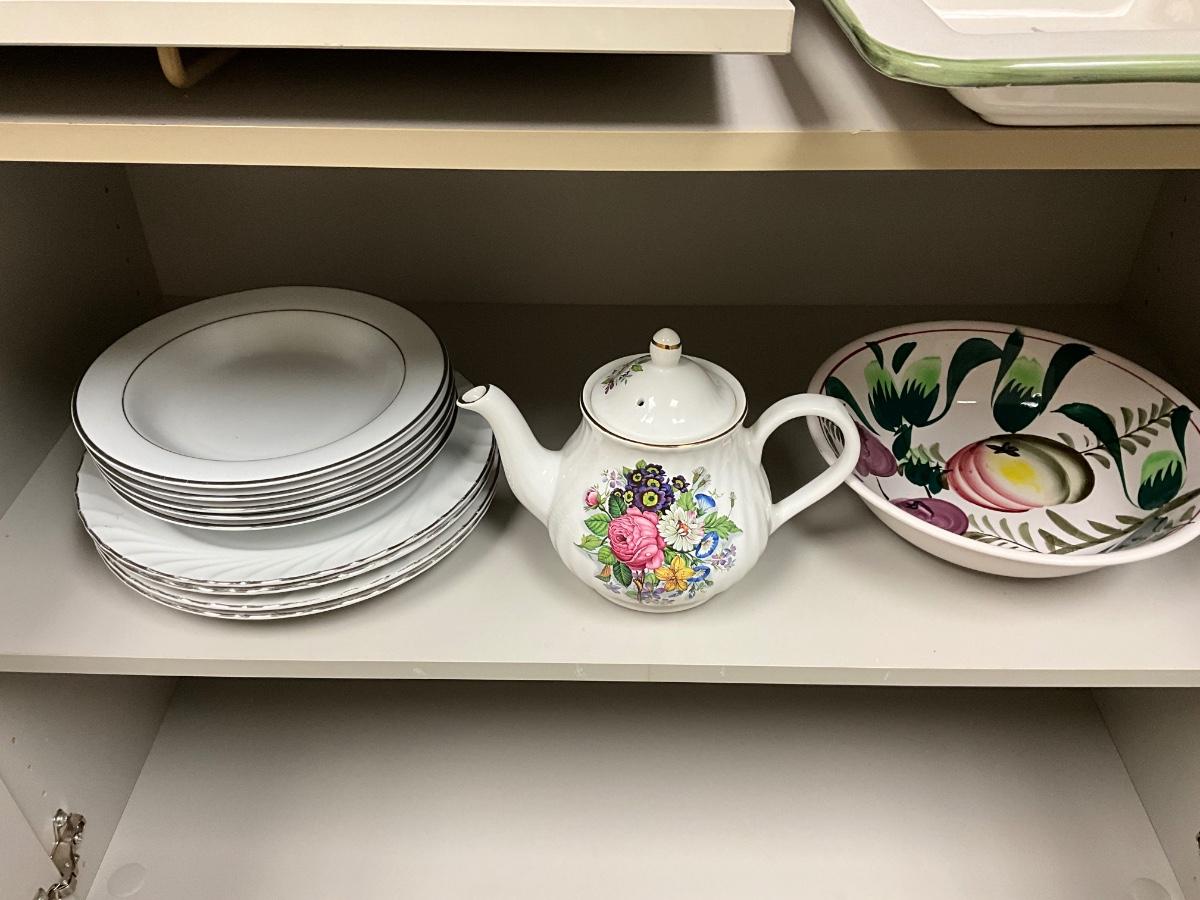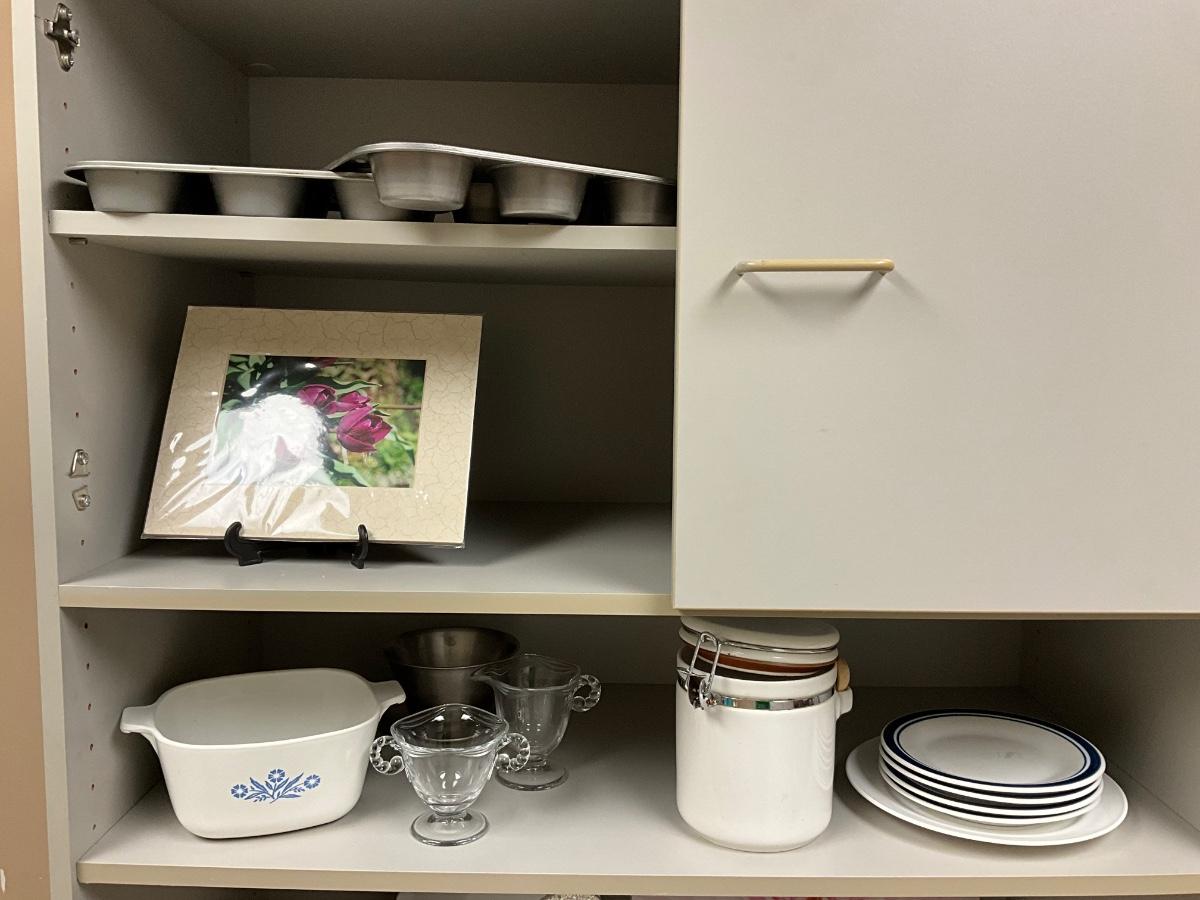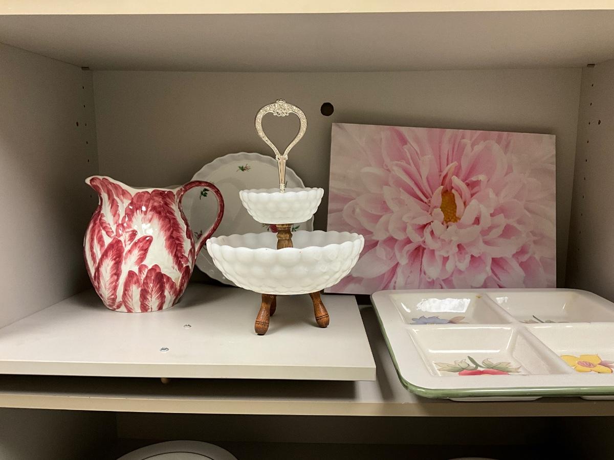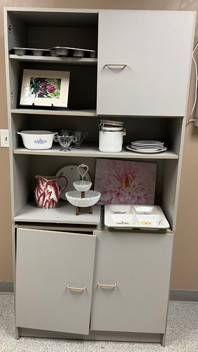 Grey Cabinet, door needs to be reinstalled (74’’ x 36’’). White with silver trim plate set, glass pitcher, 2 flower pictures, milk glass display, other kitchen dishes.