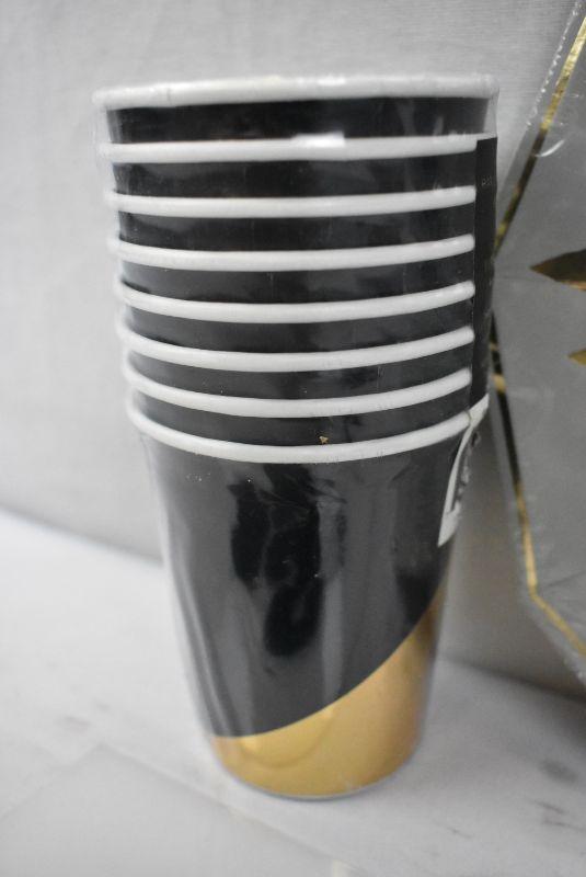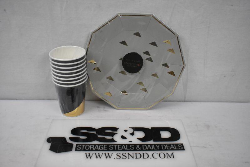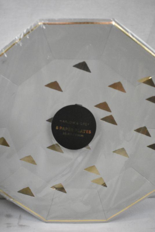 Harlow Wander Grey & Gold Foil Triangles Large Paper Plates, Decagon, 975", 8 Ct, AND Harlow Grey Noir Black & Gold Foil Colorblock Paper Cups, 9 oz, 8 Count - New