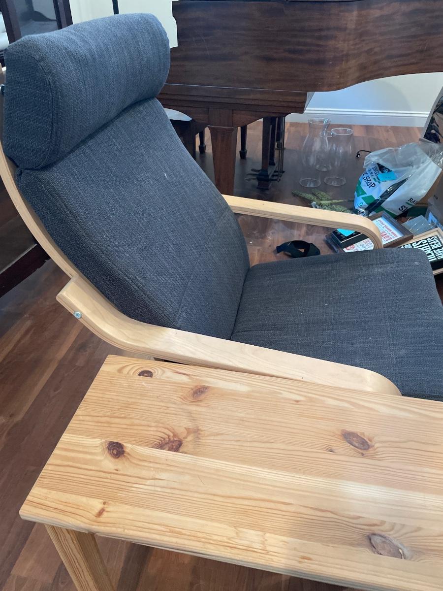 Grey padded chair with light wood frame and table
