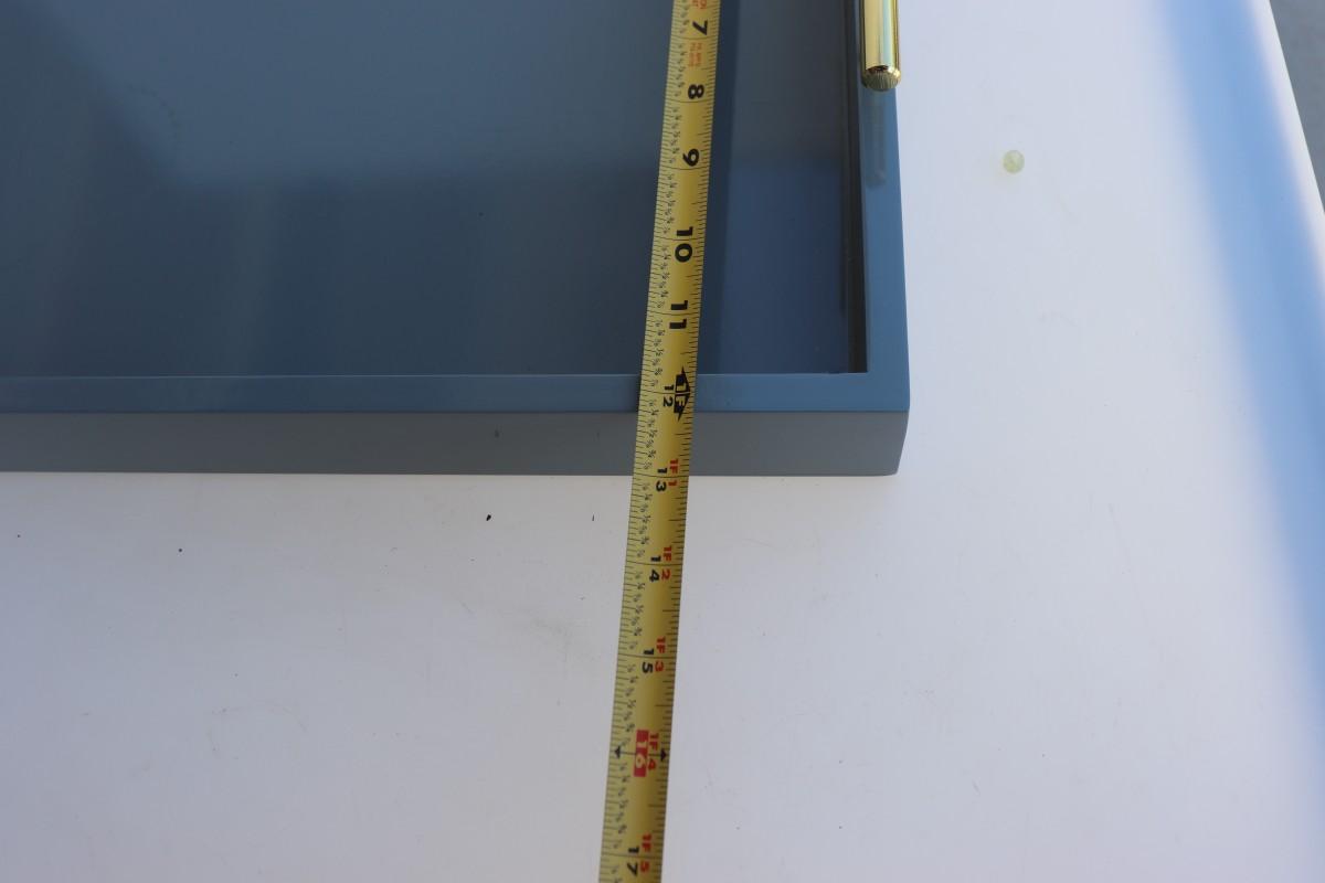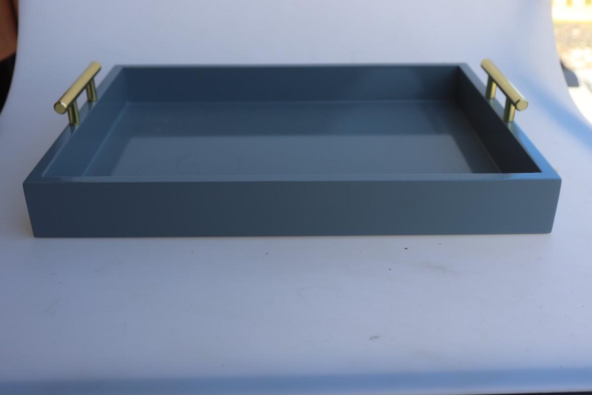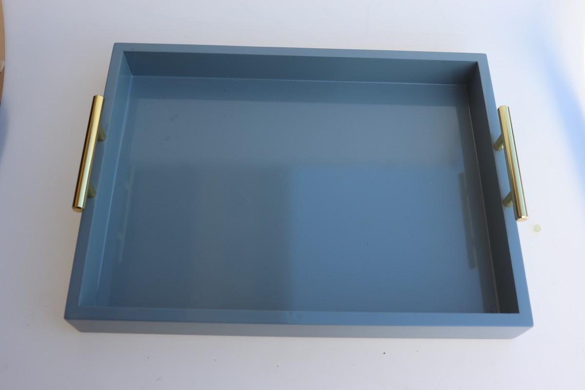 A stylish grey tray featuring elegant gold handles, perfect for serving drinks, displaying decor, or organizing items on a coffee table or countertop.