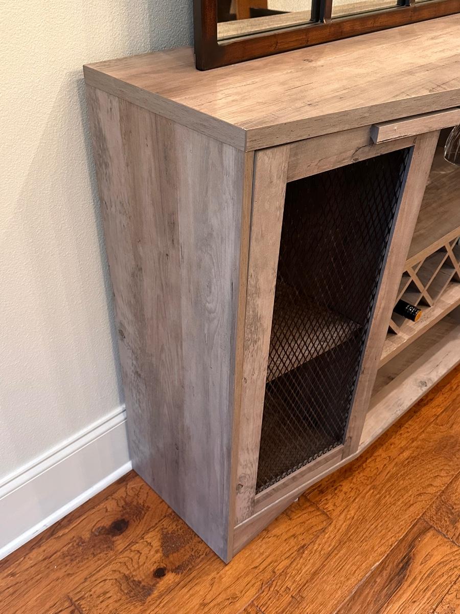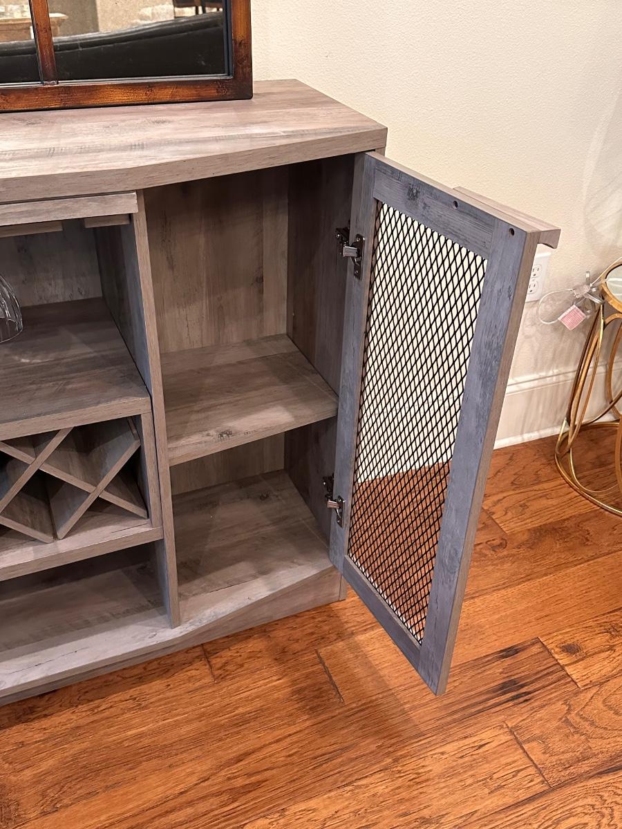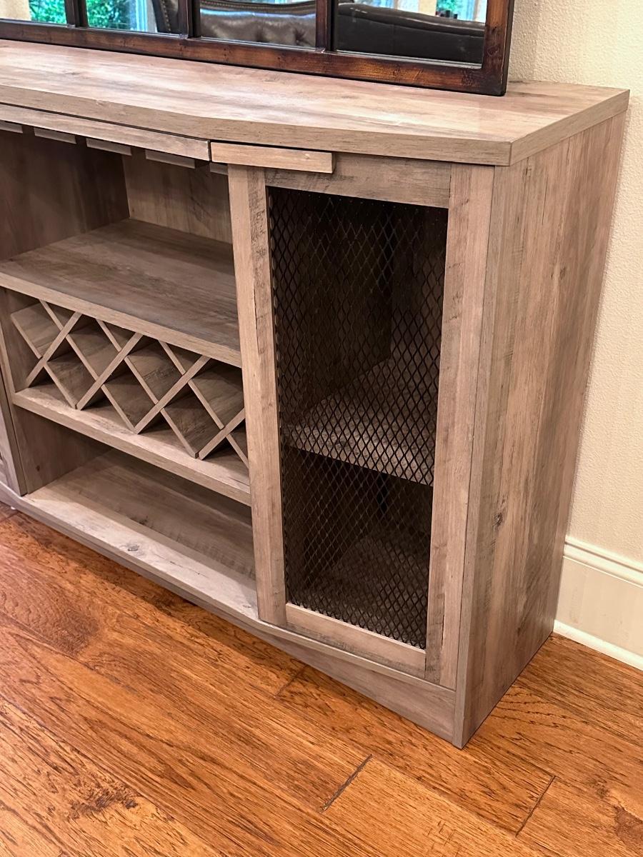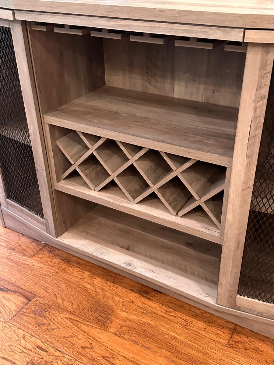 Metal Mesh Door fronts ~ laminated ~ wine and glasses NOT included ~ 35.5” H x 51.25” W x 16” D ~ Shelves inside cabinet are adjustable