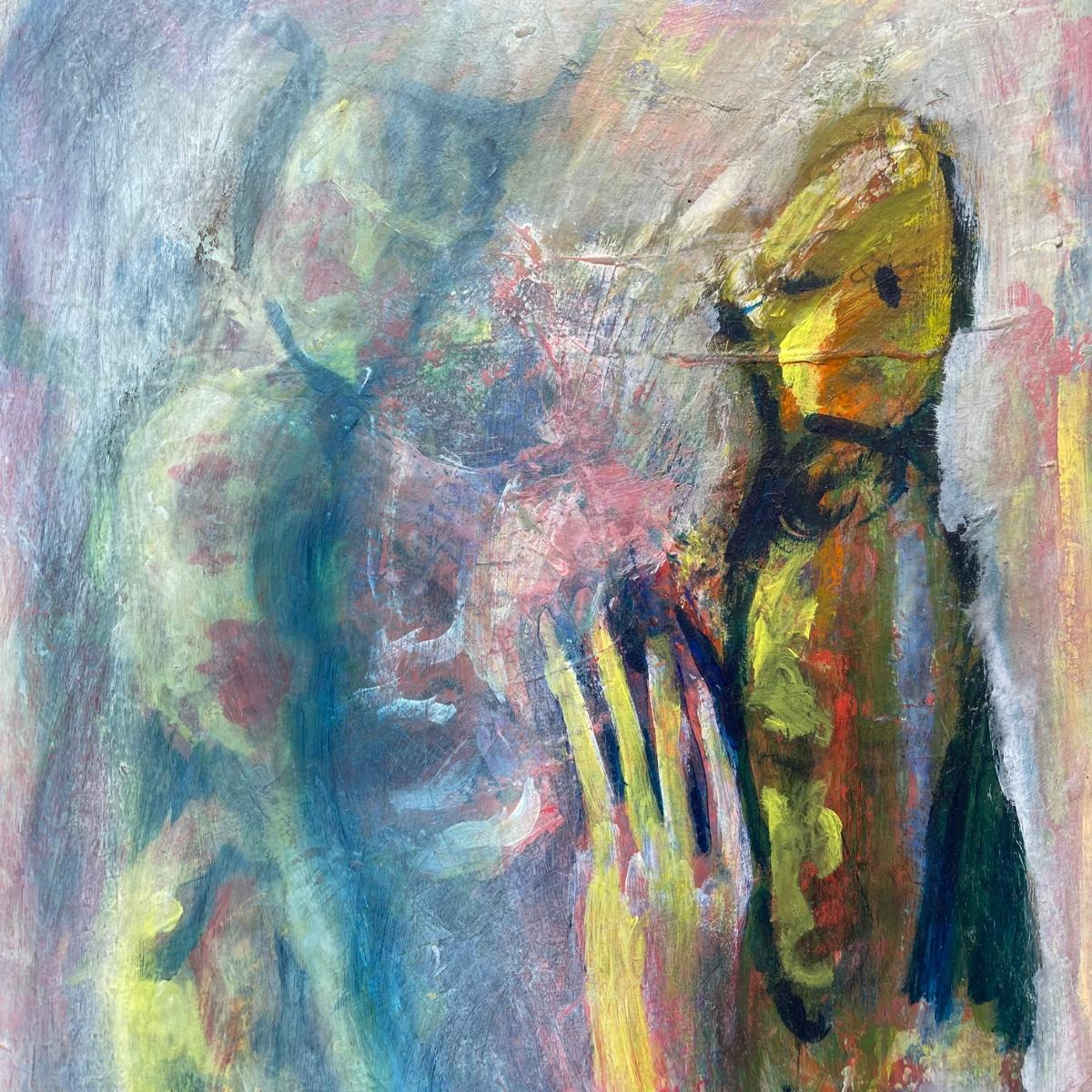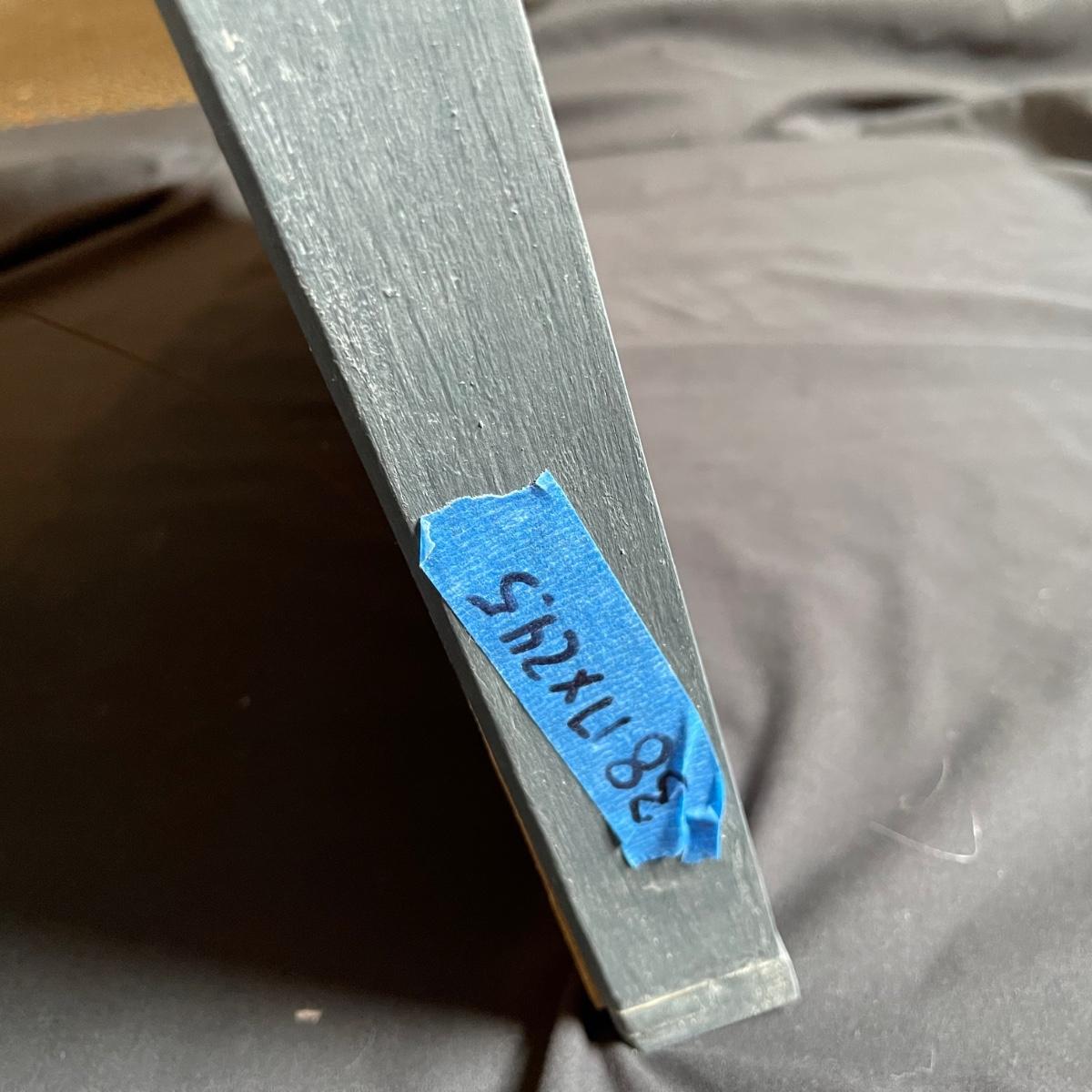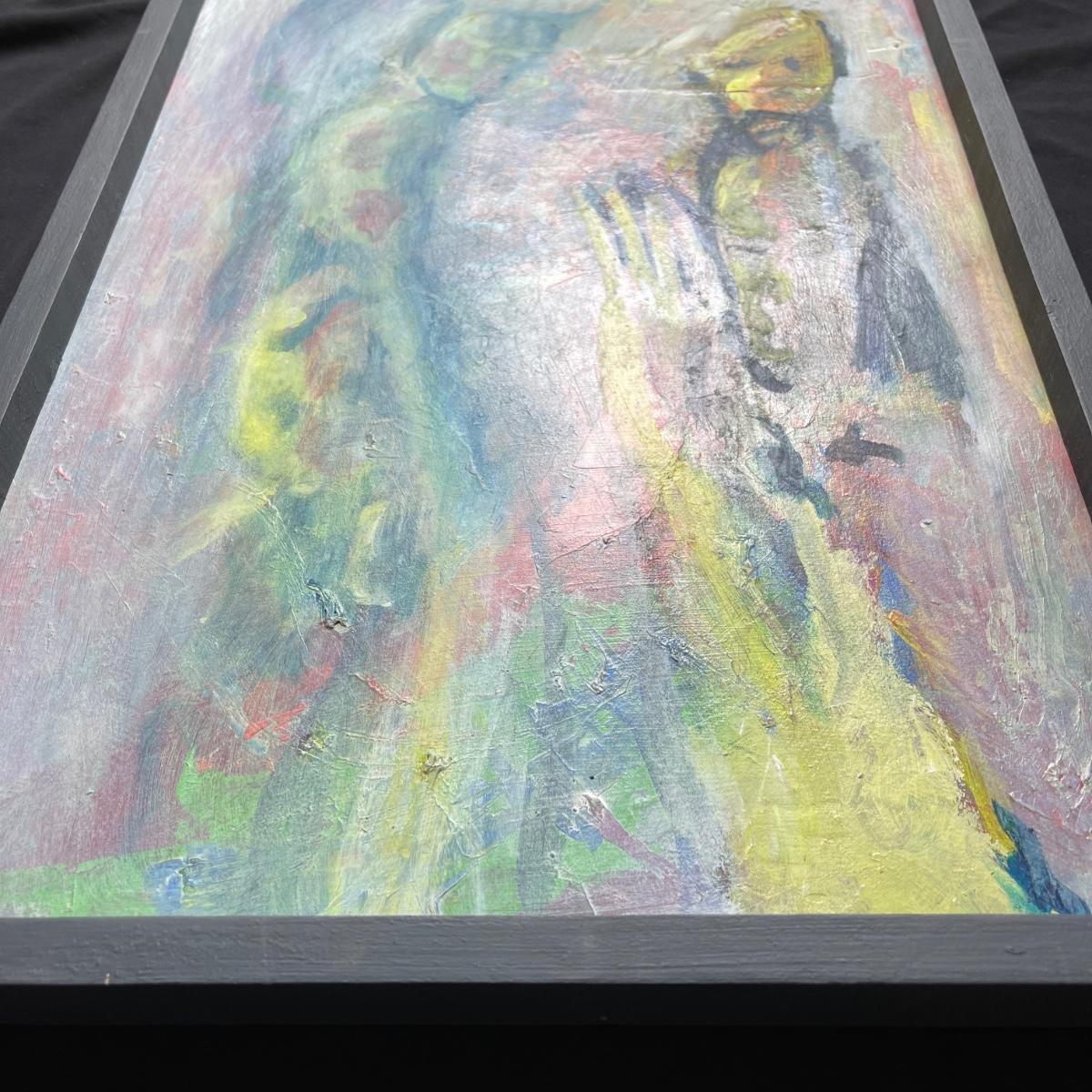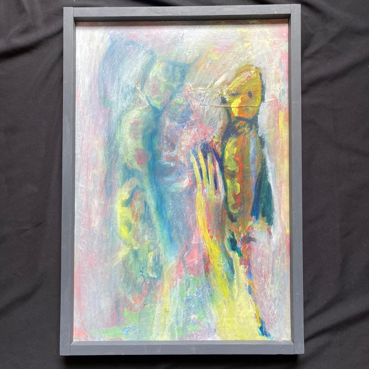 Abstract painting with a grey painted frame by Asheville Artist, Reginald “Ripp” Smith”. It measures 17” x 24.5” and it is numbered 38. The painting is on a wood panel.
