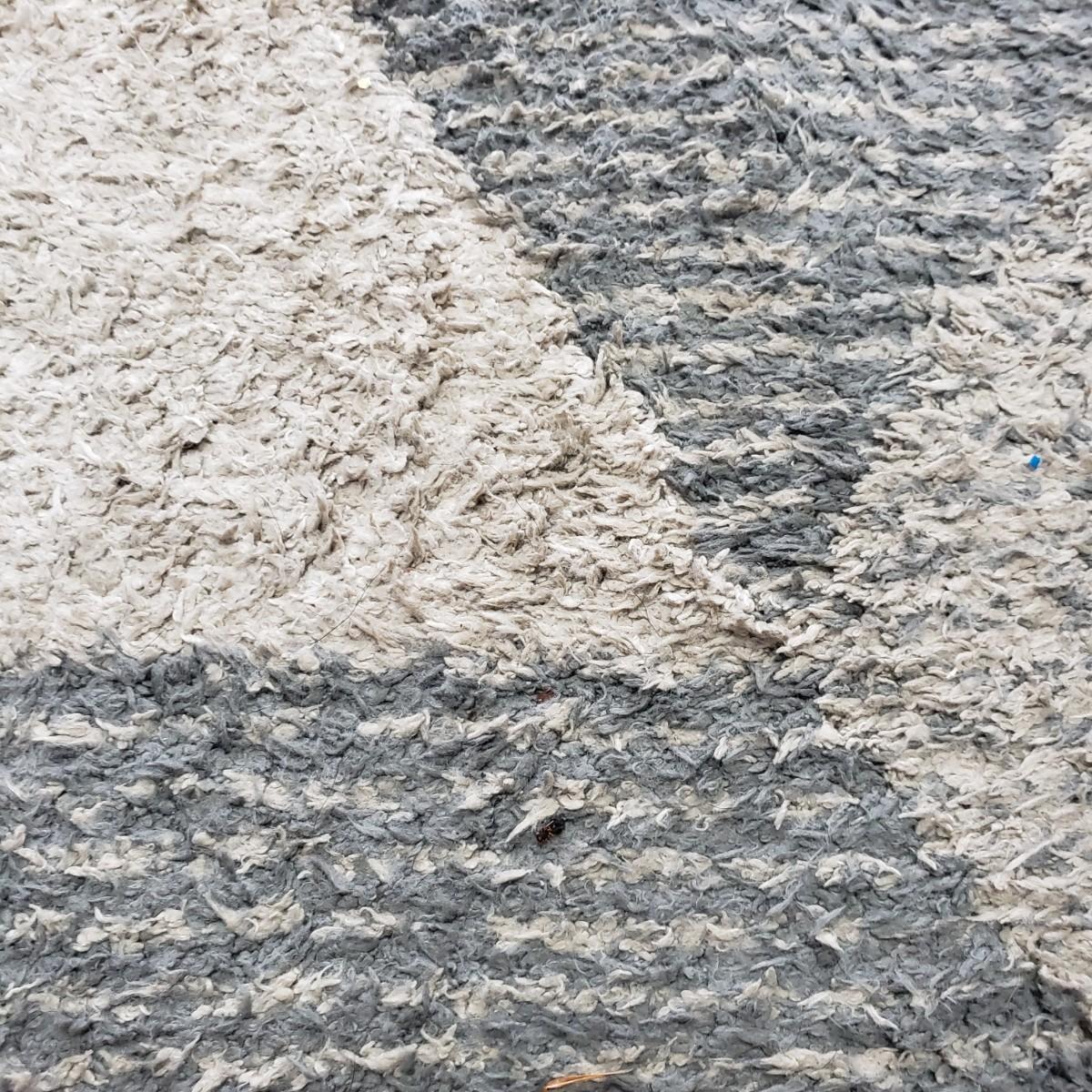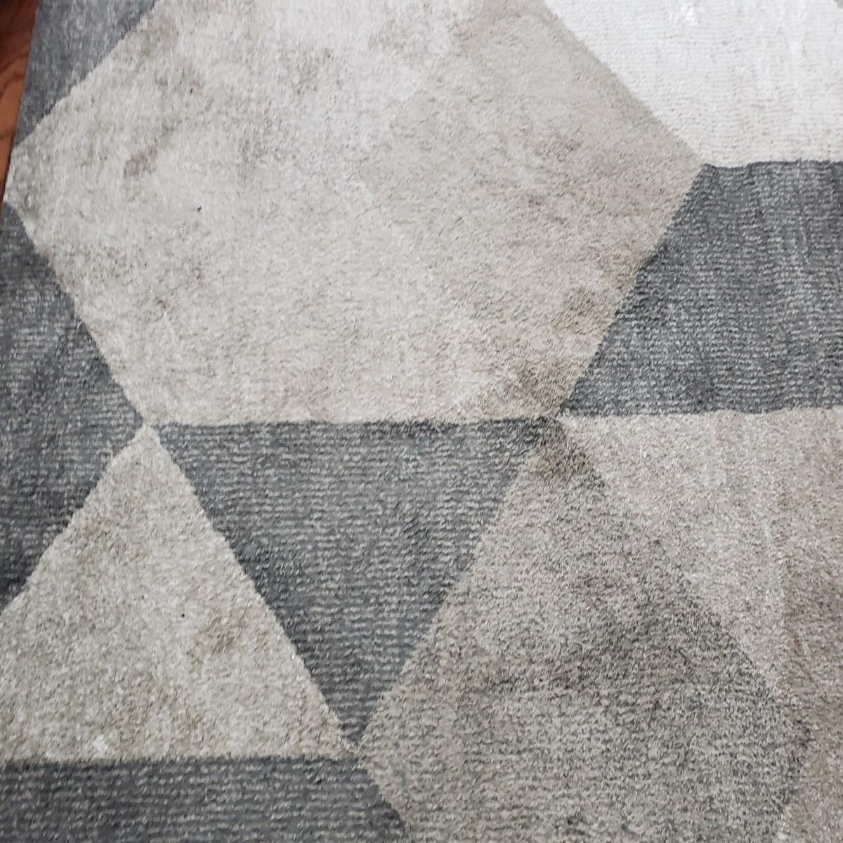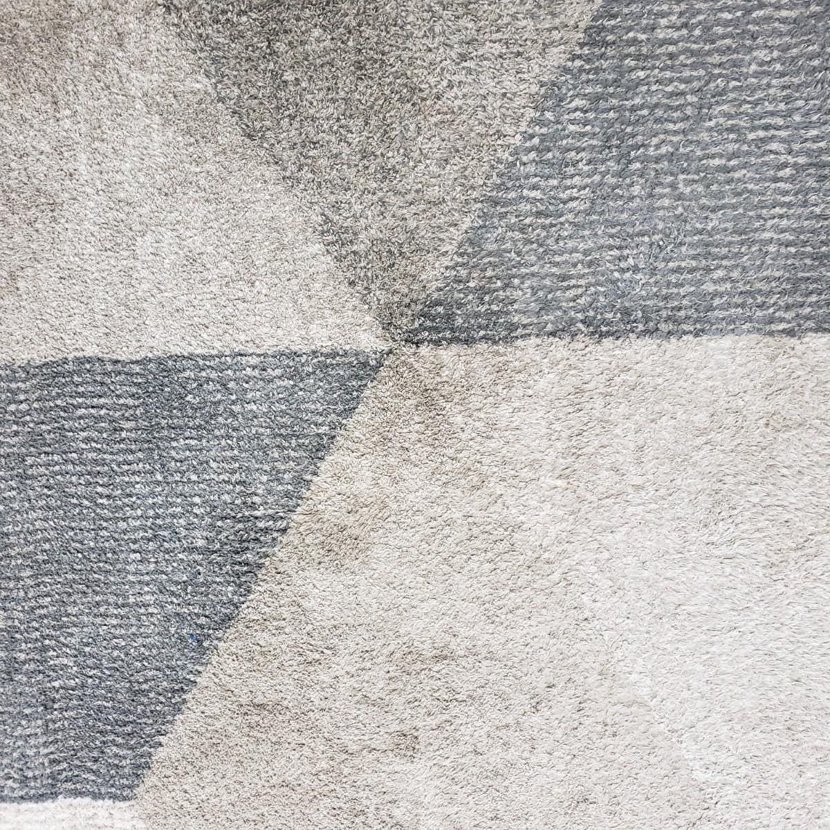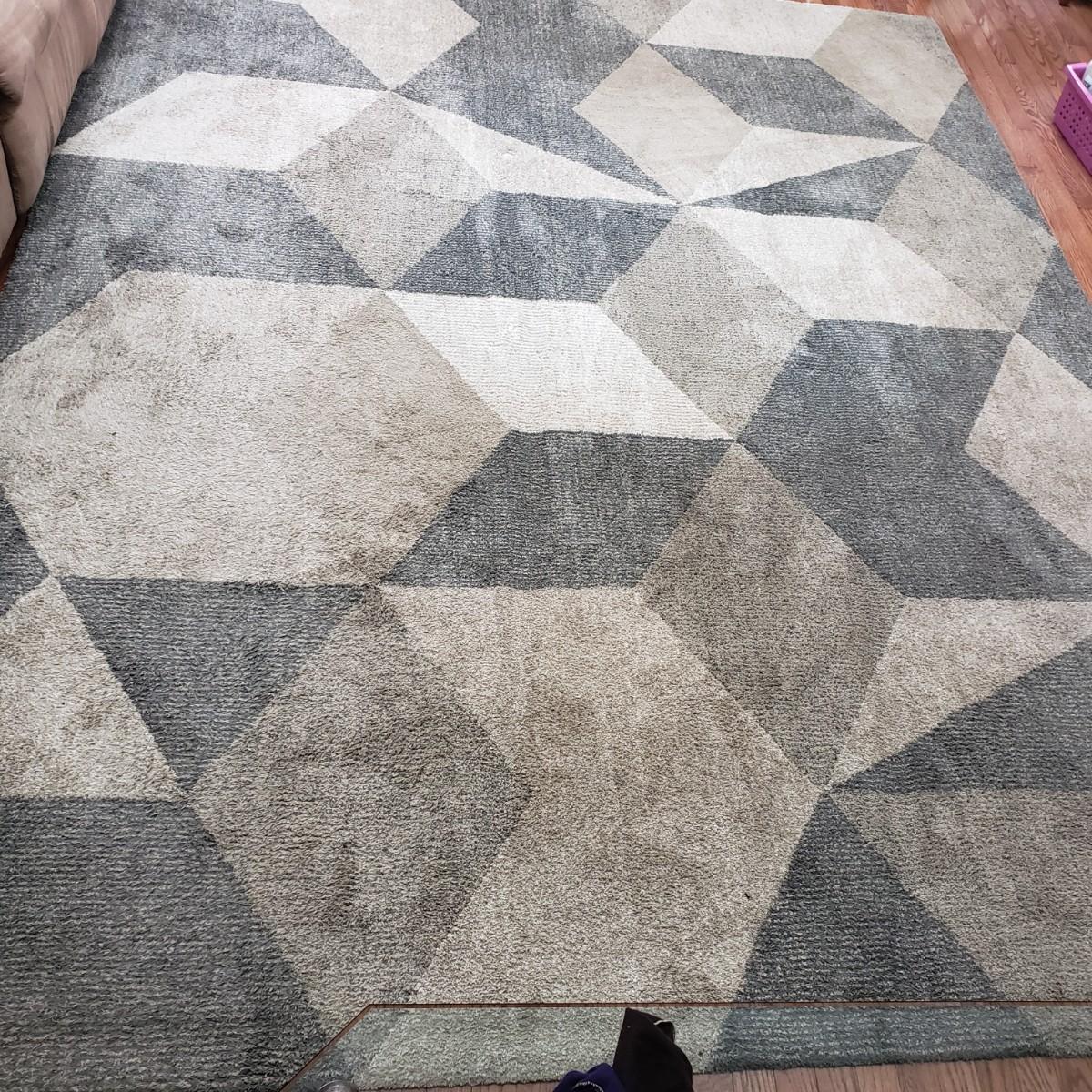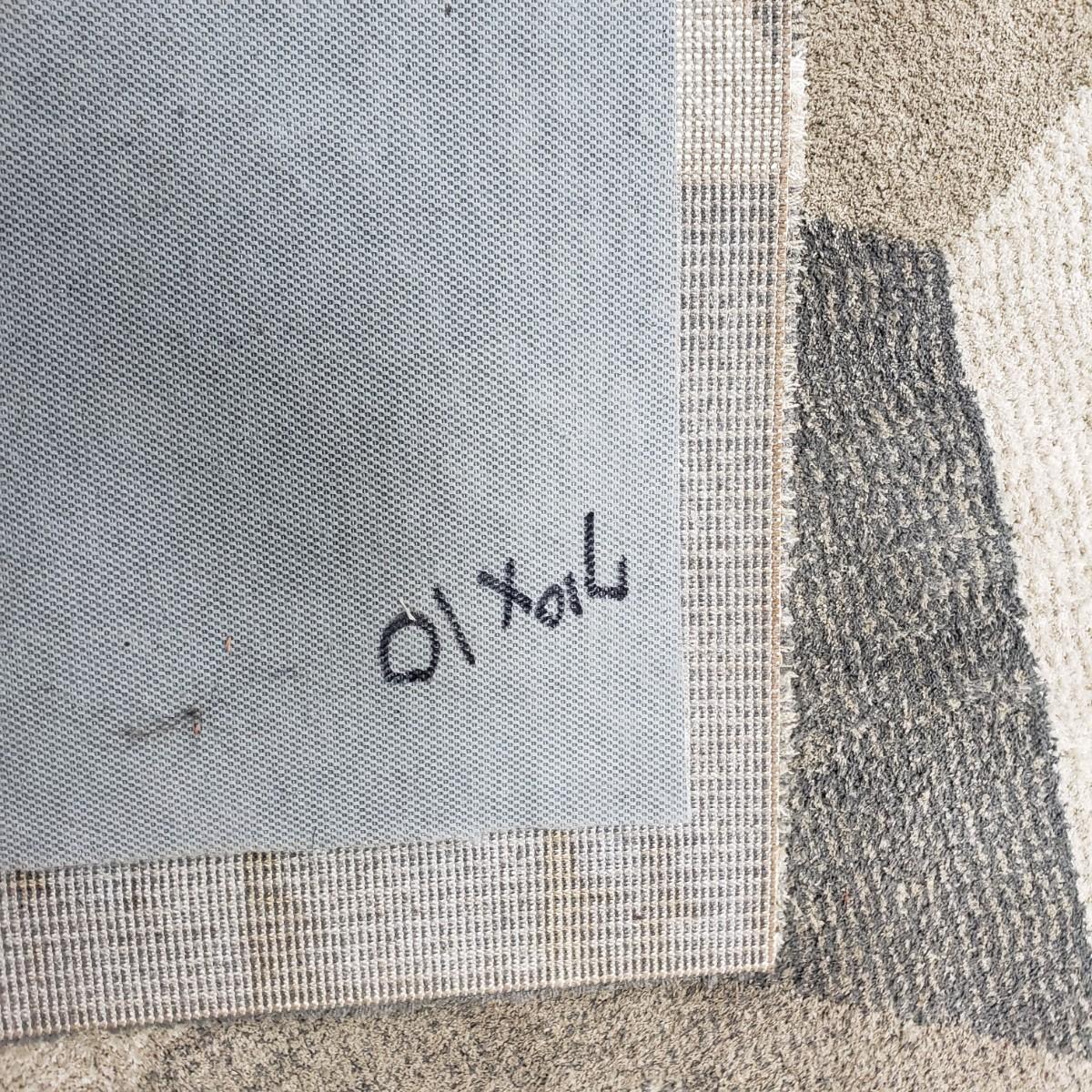 This is a geometrical area rug in grey and tans. The rug measures 10' x 7'10". Rug comes with a padding with a rubber bottom. From a dog friendly house.