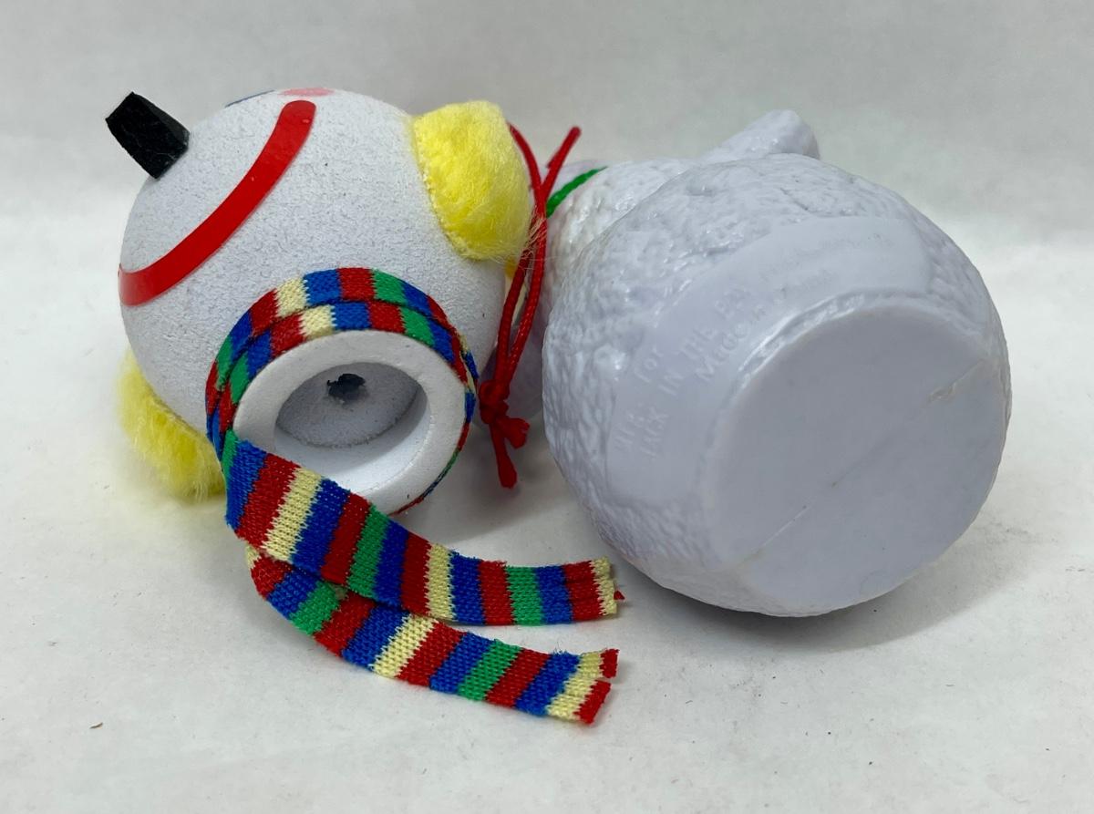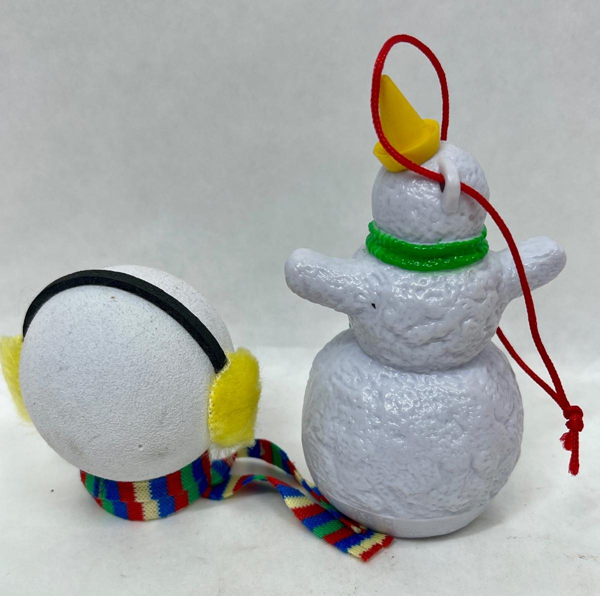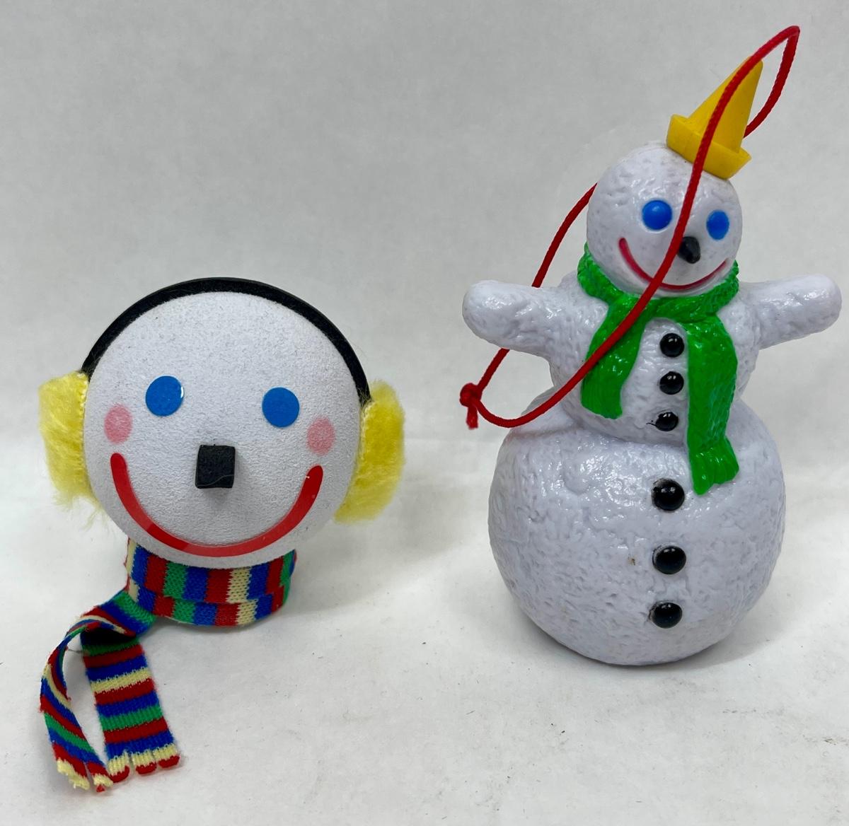 Winter Jack Antenna Ball with ear muffs and colorful scarf, and snowman Jack Christmas Ornament. Both in good condition.