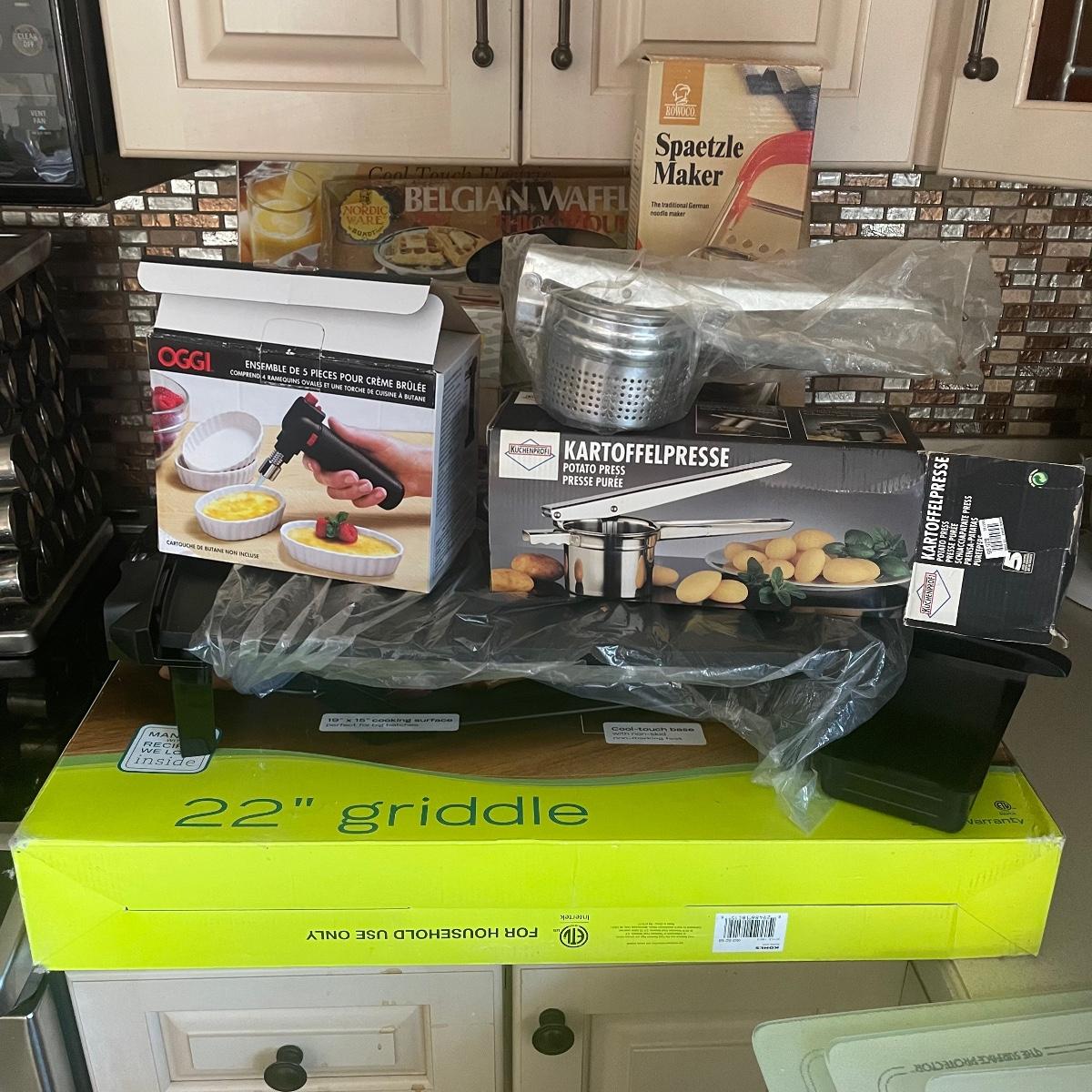 Not one but three griddles, two are new in box and untested, the third powered on. Also included is a waffle maker, Spaetzle maker, crème brûlée kit and much more, see images.