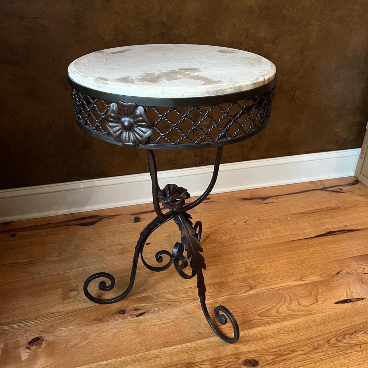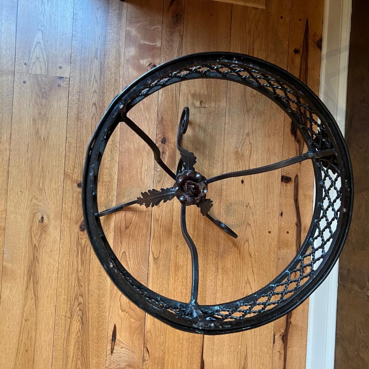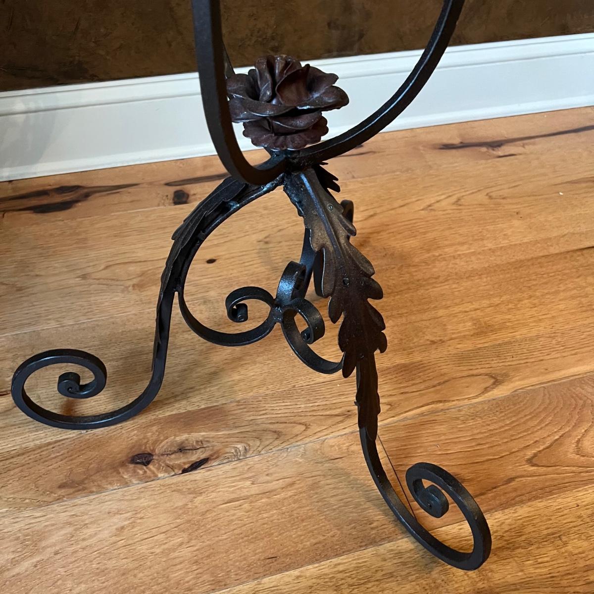Griffin Creek round table with metal base. Table measures 19”D x 29.5”H. The metal is a lattice pattern accented with leaves and a sculpted rose in the center.