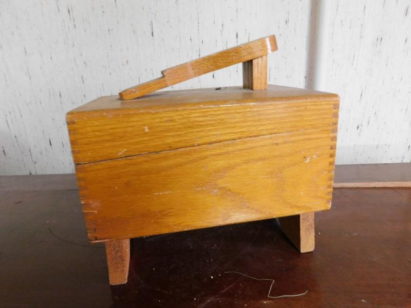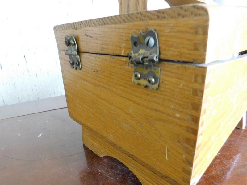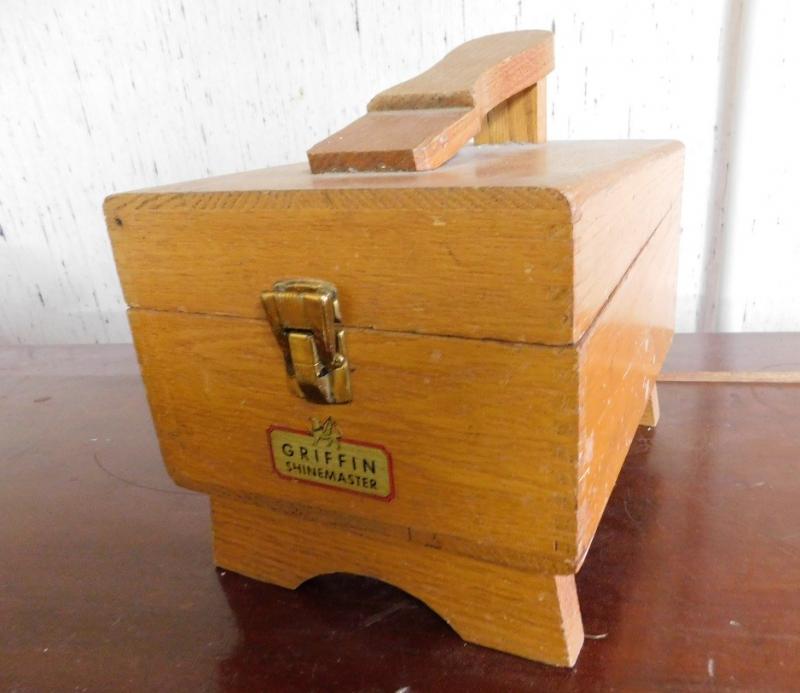 Griffin Shinemaster Oak Shoe Shine Box. Back hinge needs repair. Inside full of waxes and cleaners for shining shoes.