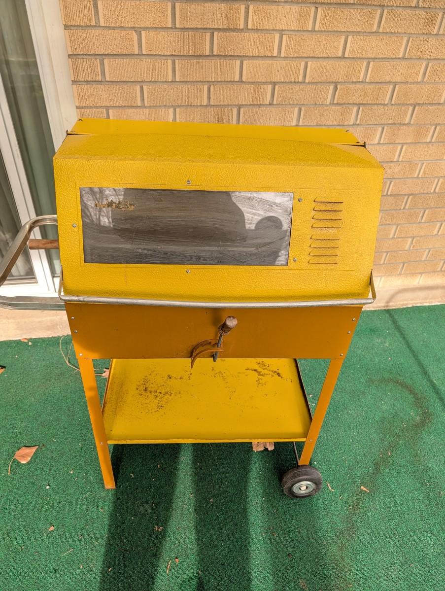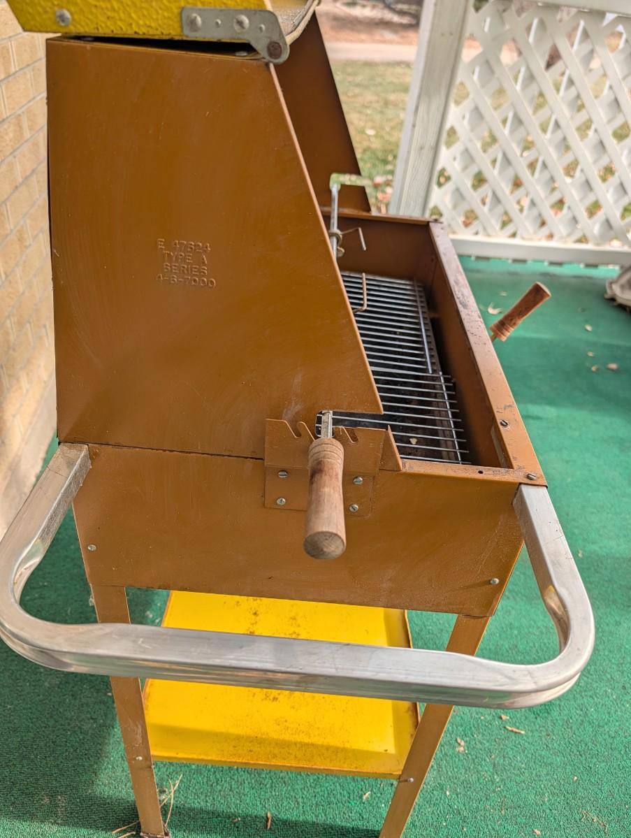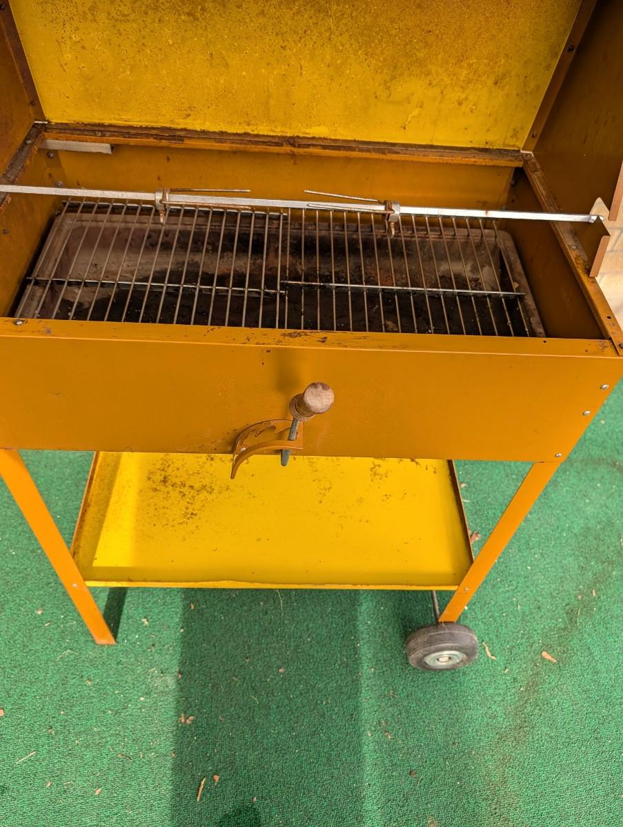 Vintage charcoal grill with rotisserie.