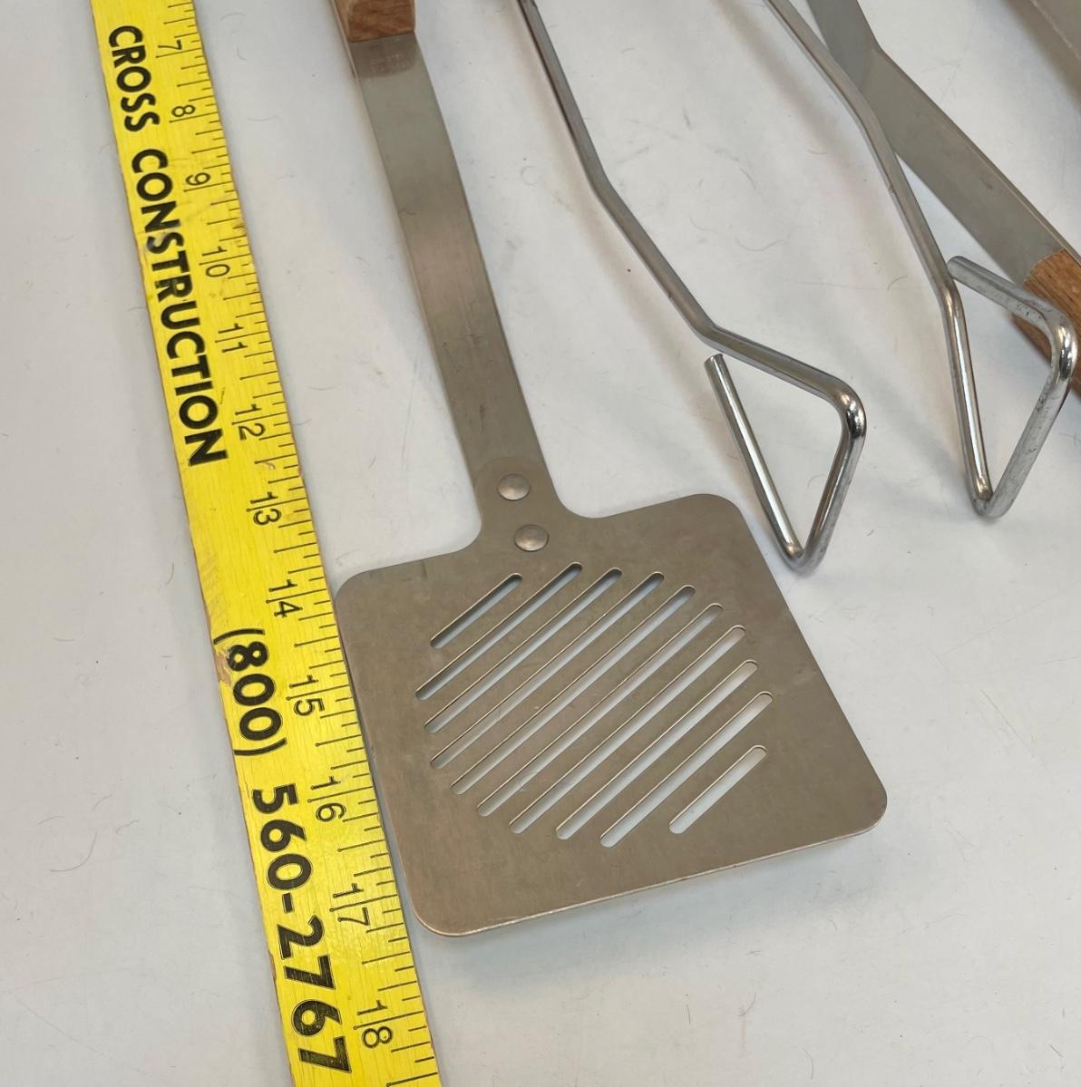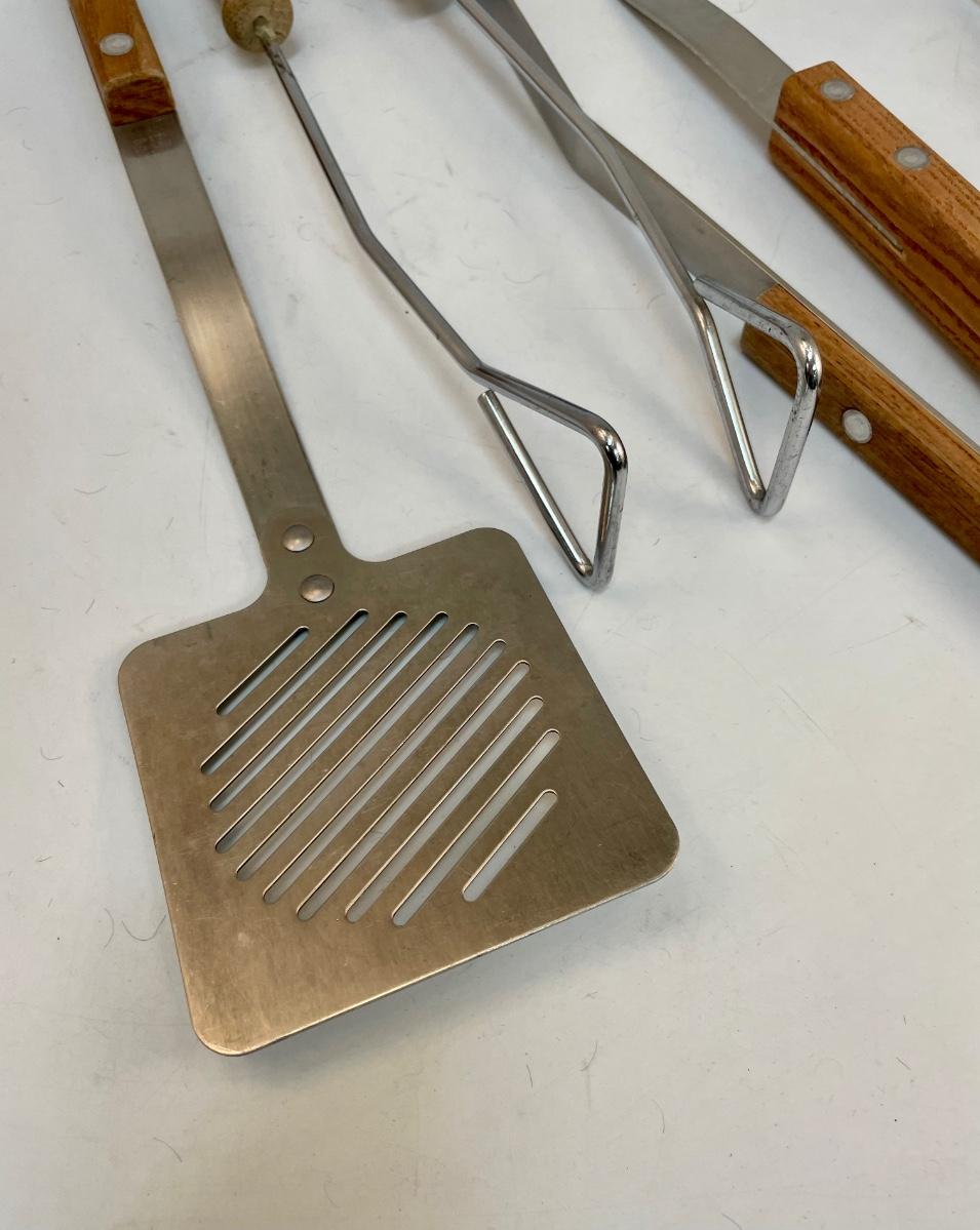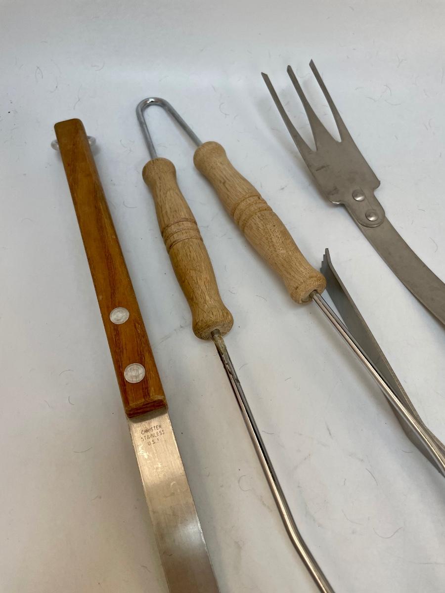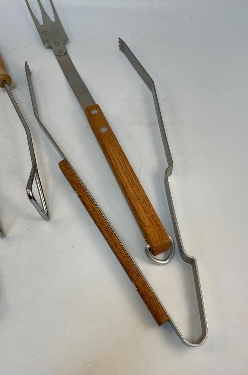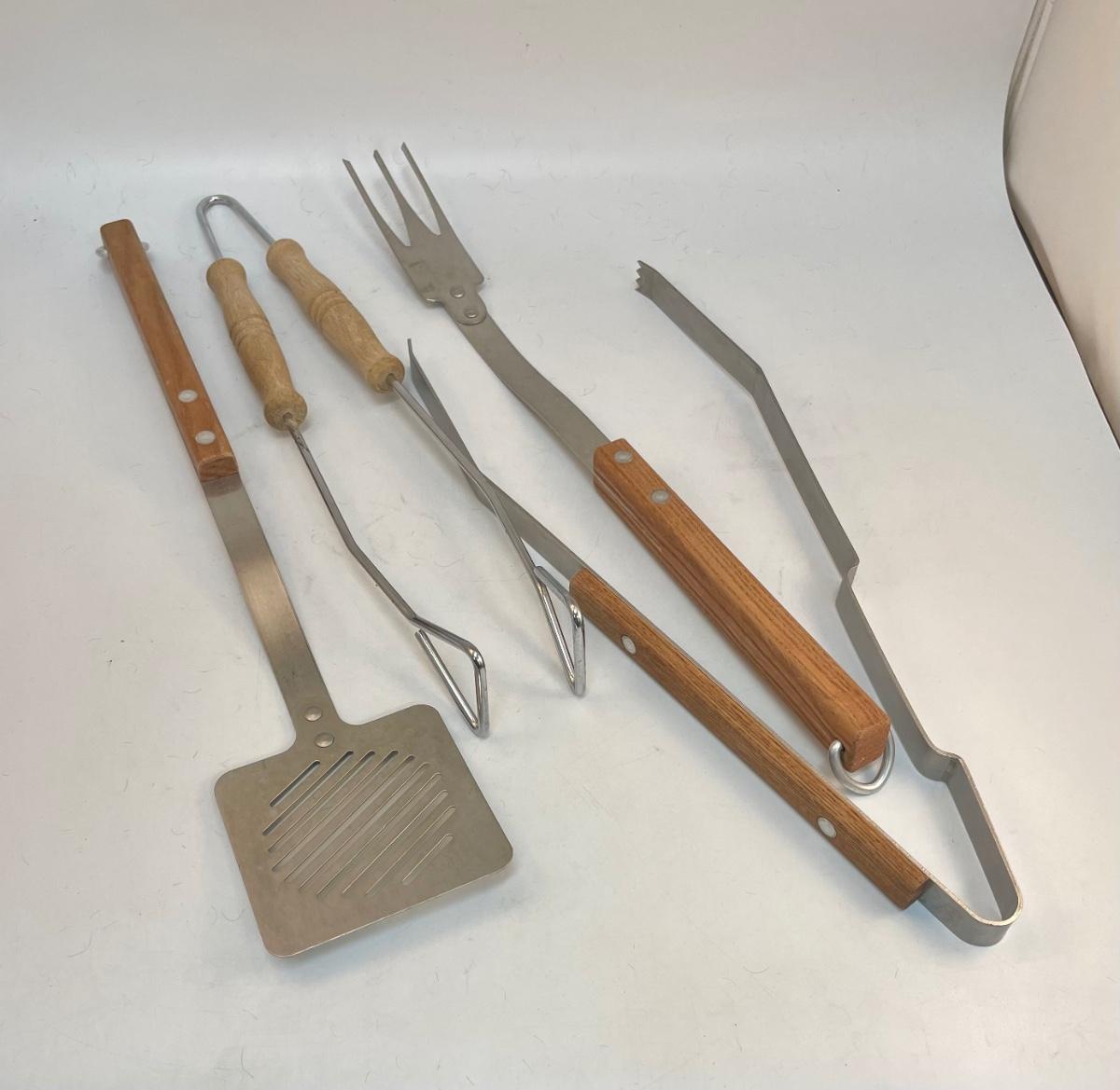 Set of 4 wood-handled grilling tools: spatula, fork, and 2 types of tongs. New condition, never used.