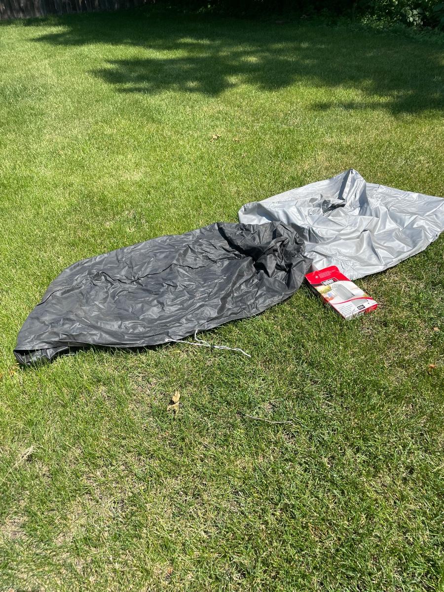 Grill cover lot 3 different sizes. Black one is 59”x18”. It has a small hole in it