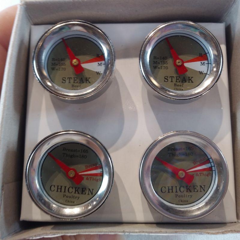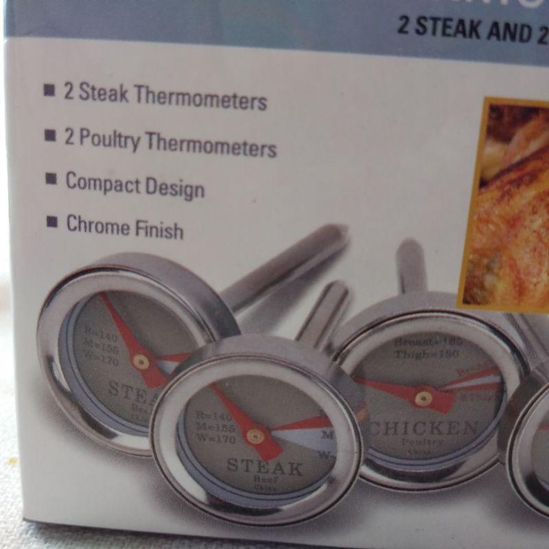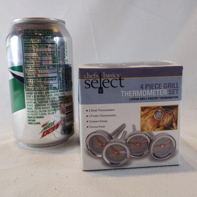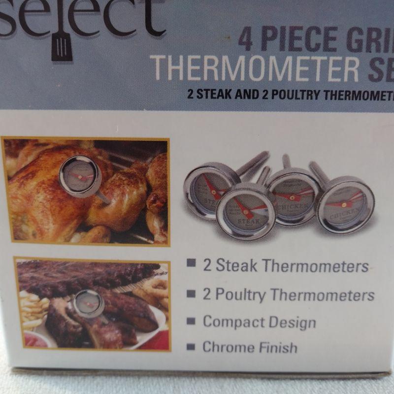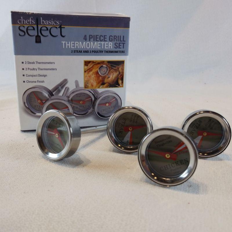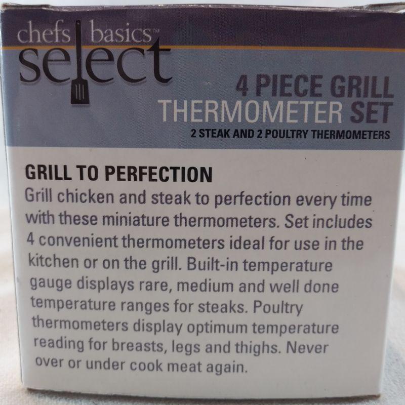 New in the box, this is a unique set of 4 Grill Thermometers. Two of the temps are for chicken and two are for steak - to make that perfectly cooked meal. Manufactured by Chef's Basics Select. This would be a great tool to enhance your summer grilling or as a gift for your favorite patio chef.
