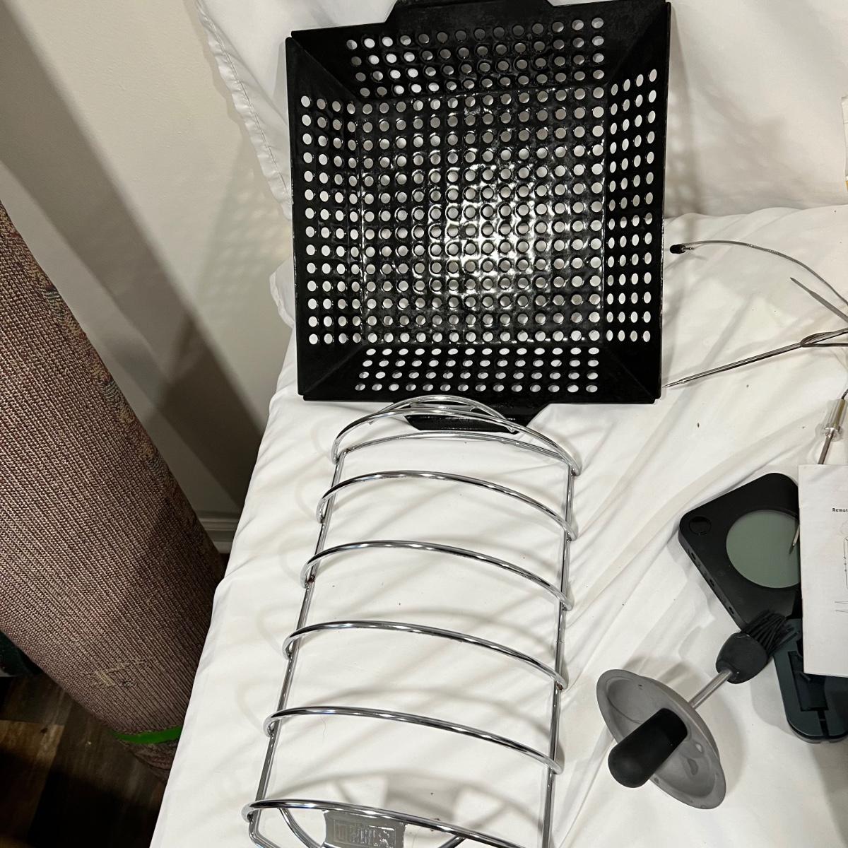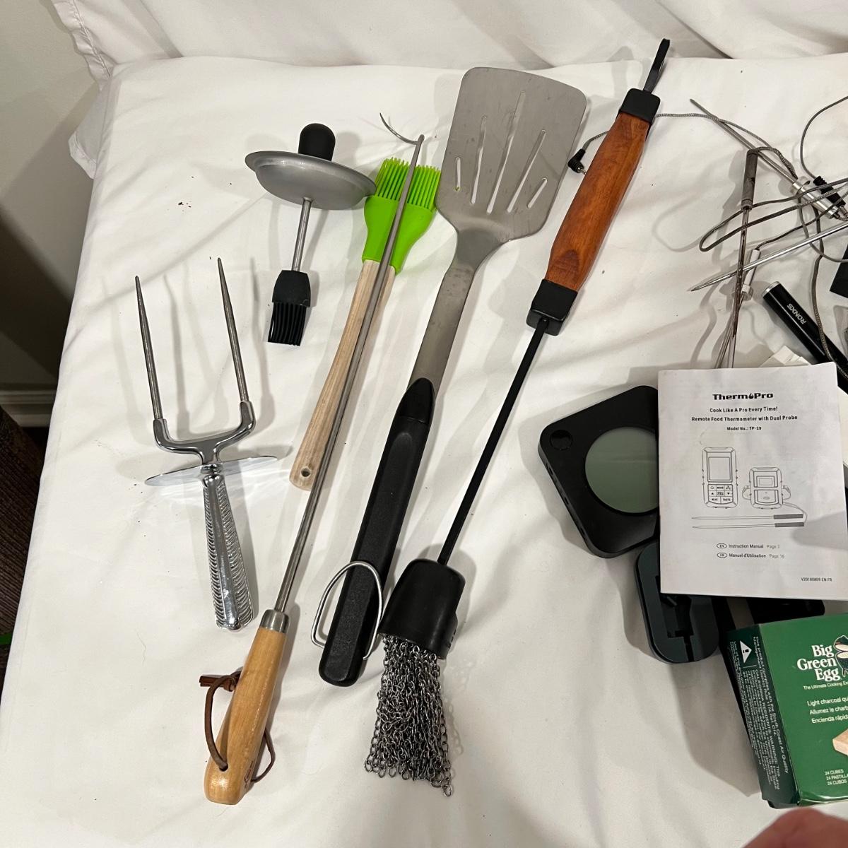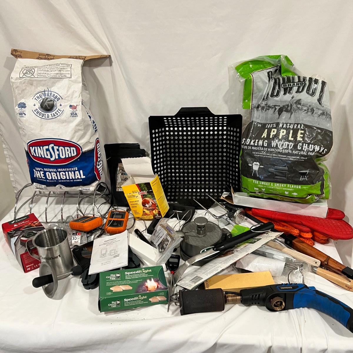 Huge lot of grilling tools and accessories. The charcoal bag is unopened but the bags of wood chips have all been opened and are mostly half full. Most of the many meat thermometers are battery operated and were not tested. The Sondiko propane torch was also not tested. See photos for full inventory.