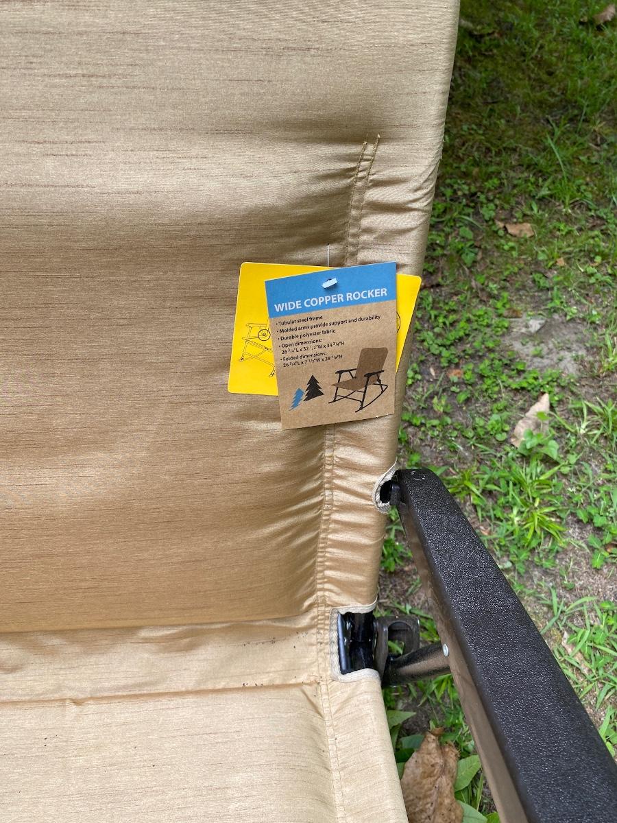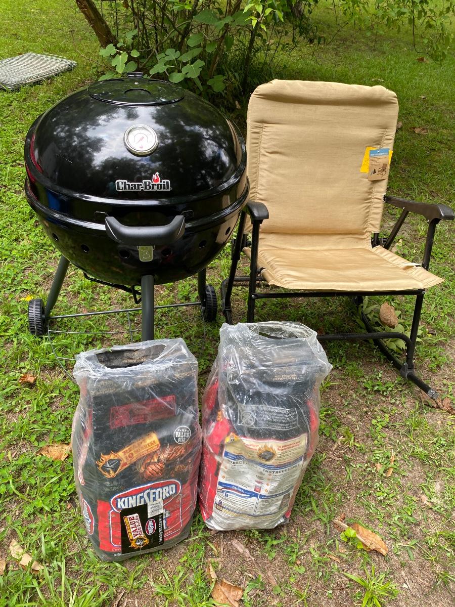 Grilling And Chilling Lot Includes Wide Copper Folding Rocker, Charbroil Kettle Grill (Unused) and 4 Bags of Kingsford Charcoal