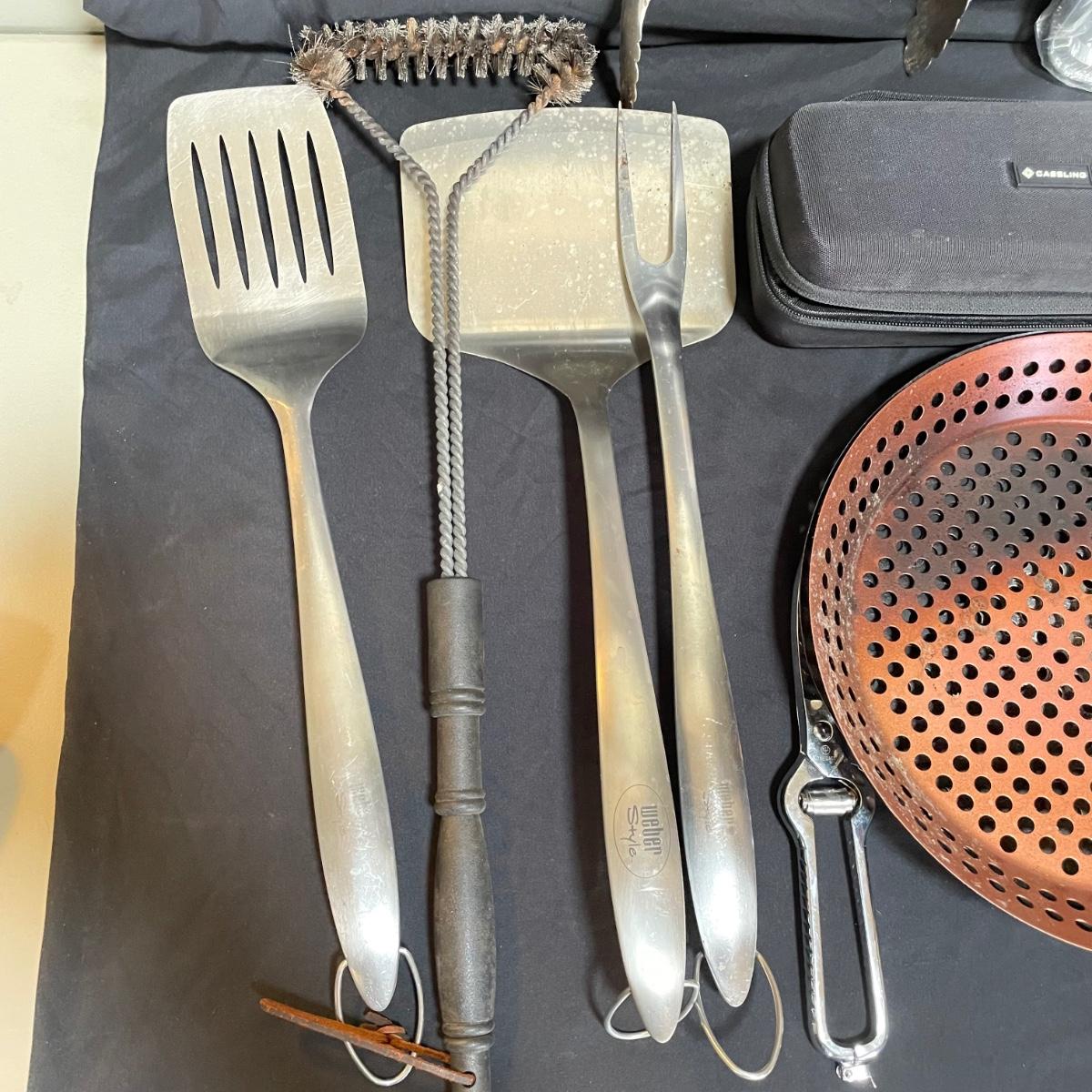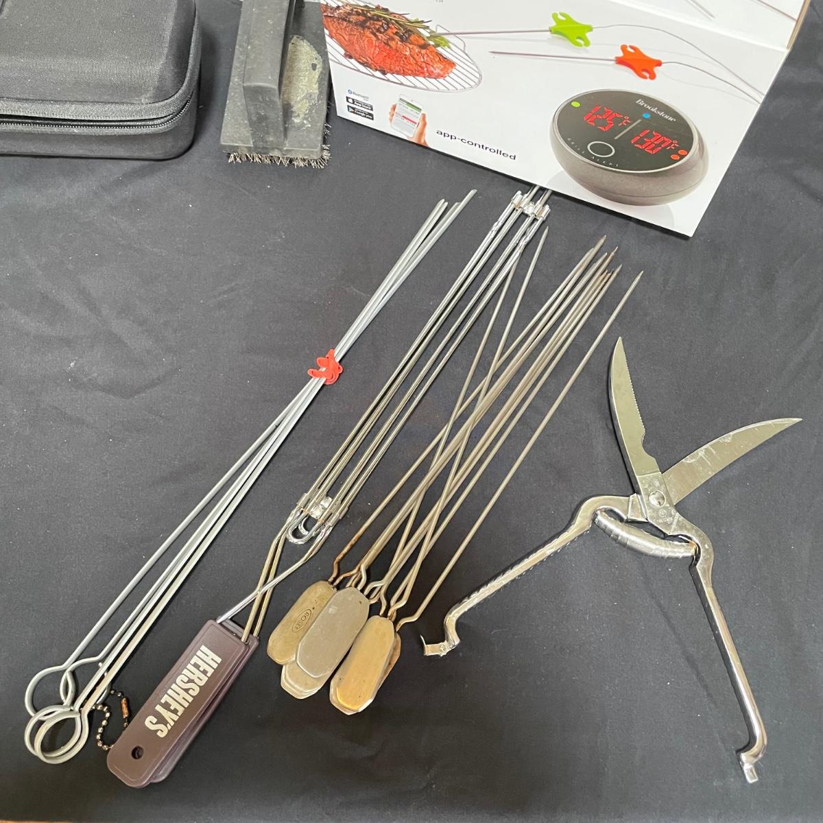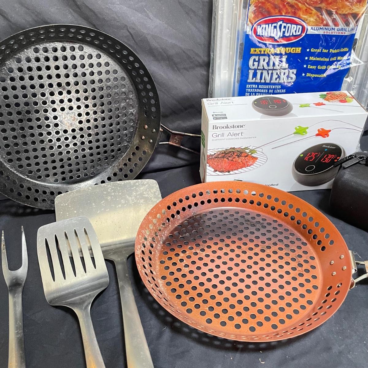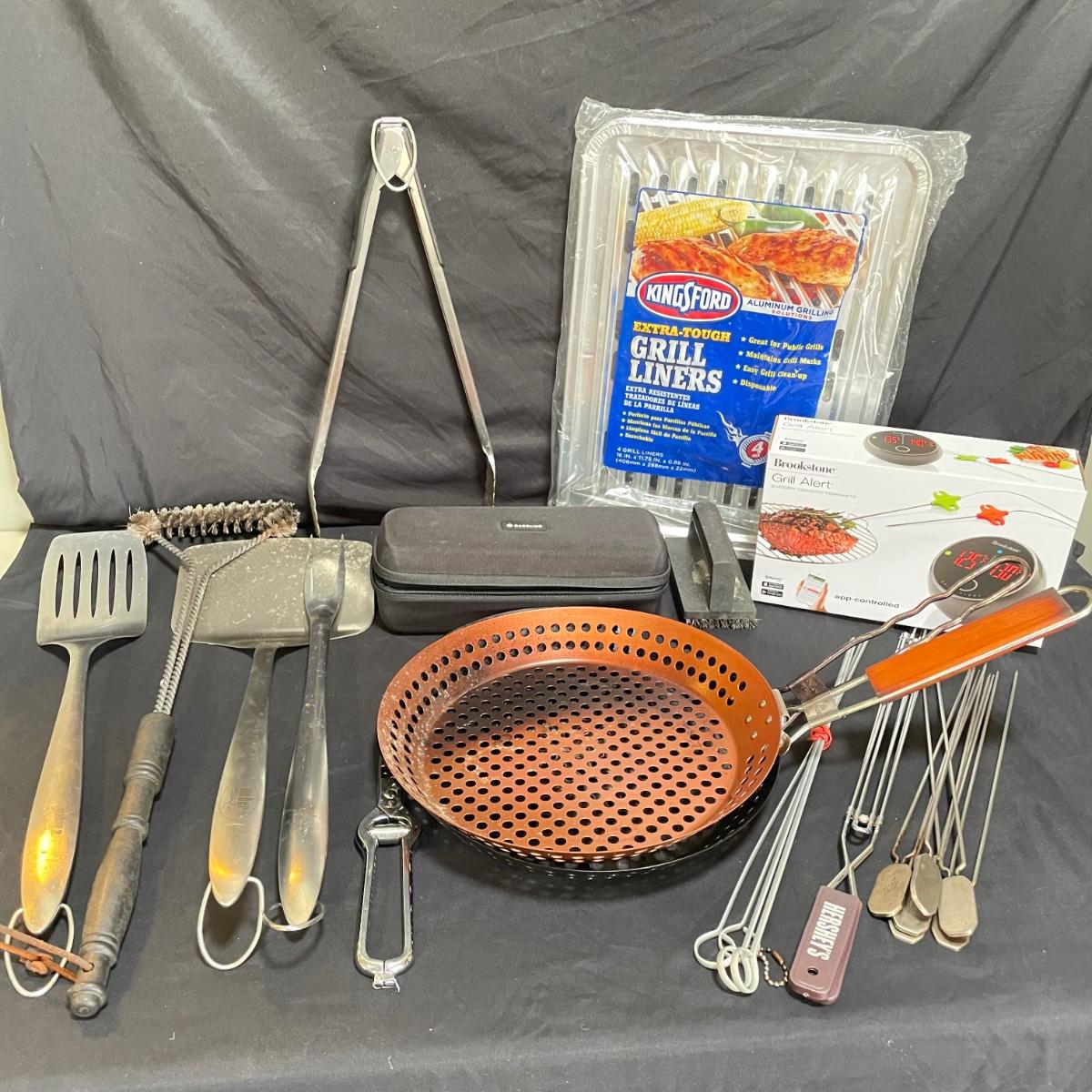 A nice lot of all things grilling. Three Weber Style utensils plus grill grate cleaning brushes, multiple skewers, veggie baskets, tongs, an unopened package of Kingsford grill liners, a Brookstone Grill Alert and ThermoPro thermometer. Both the Brookstone and ThermoPro are battery operated and they were not tested. Local pick up only.