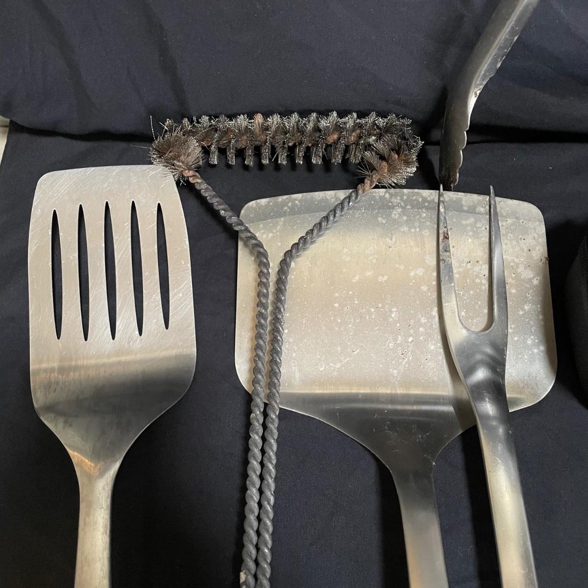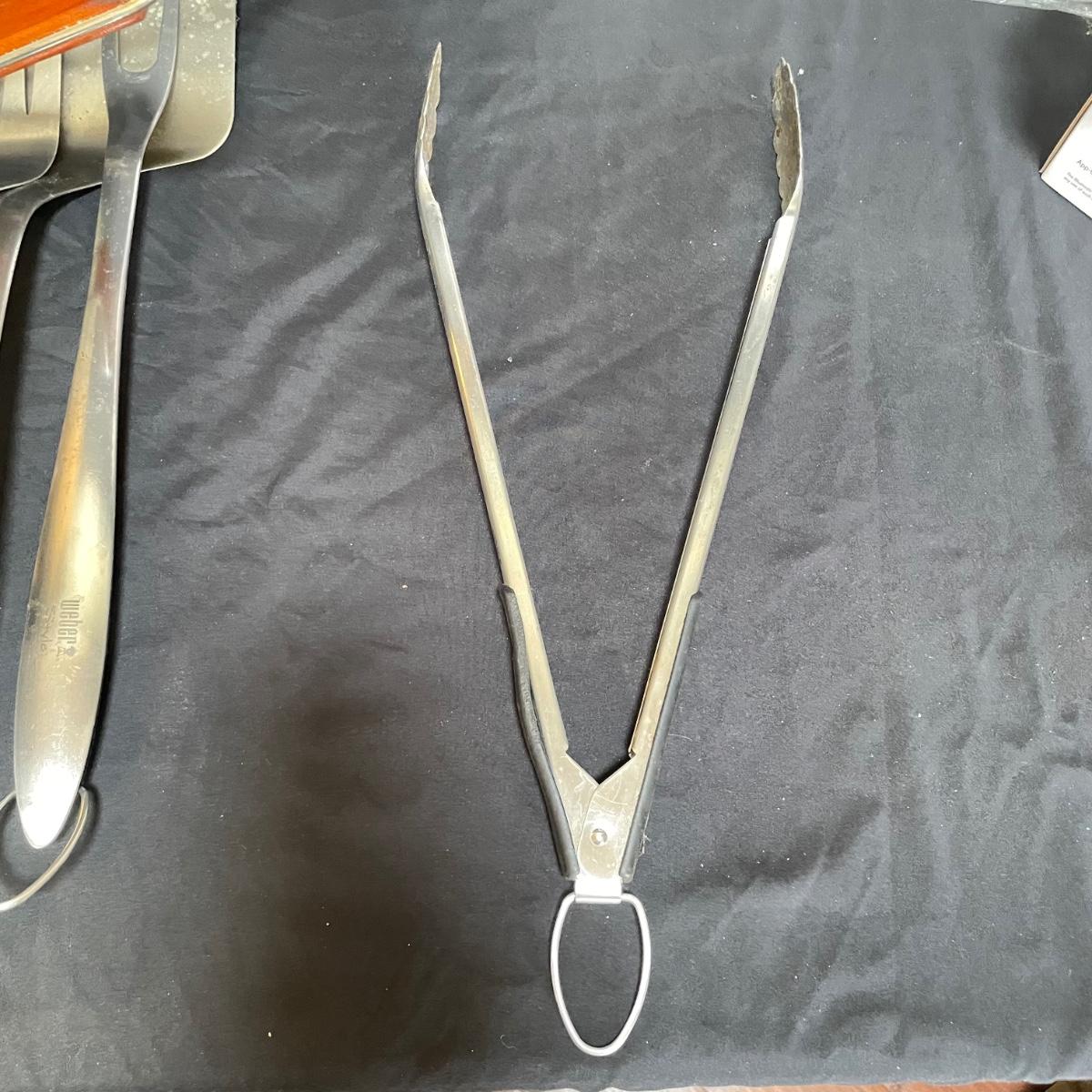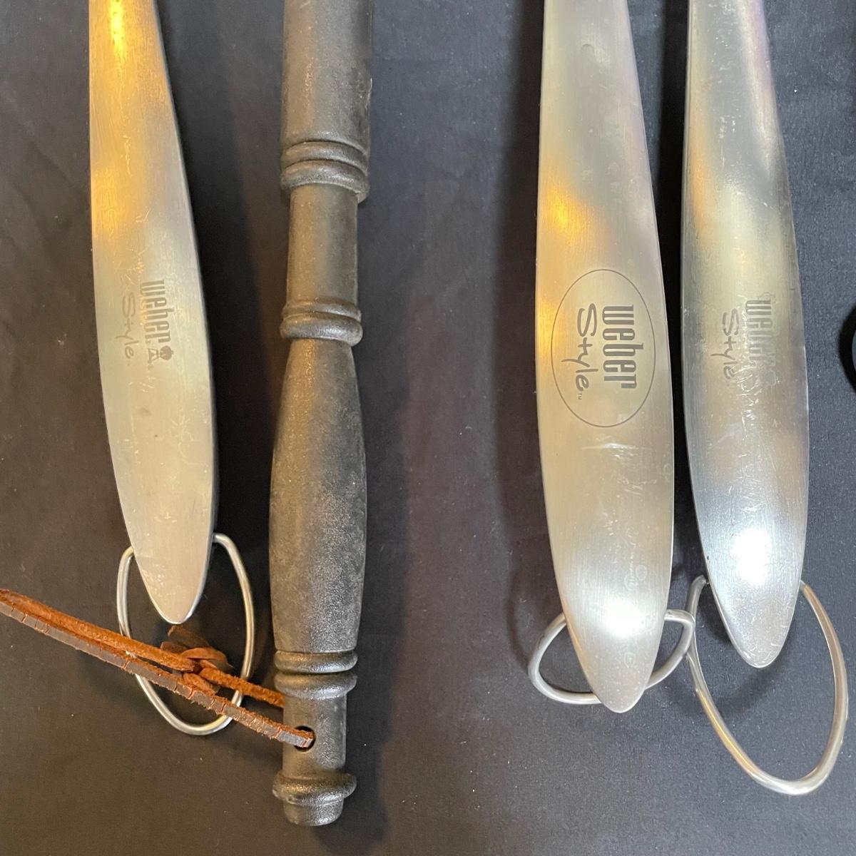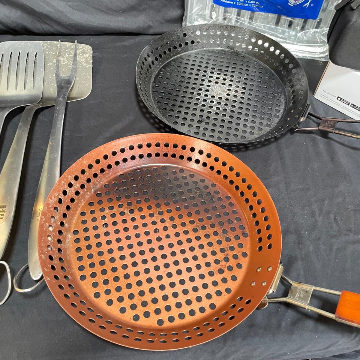 A nice lot of all things grilling. Three Weber Style utensils plus grill grate cleaning brushes, multiple skewers, veggie baskets, tongs, an unopened package of Kingsford grill liners, a Brookstone Grill Alert and ThermoPro thermometer. Both the Brookstone and ThermoPro are battery operated and they were not tested. Local pick up only.