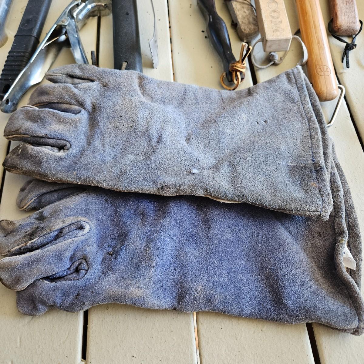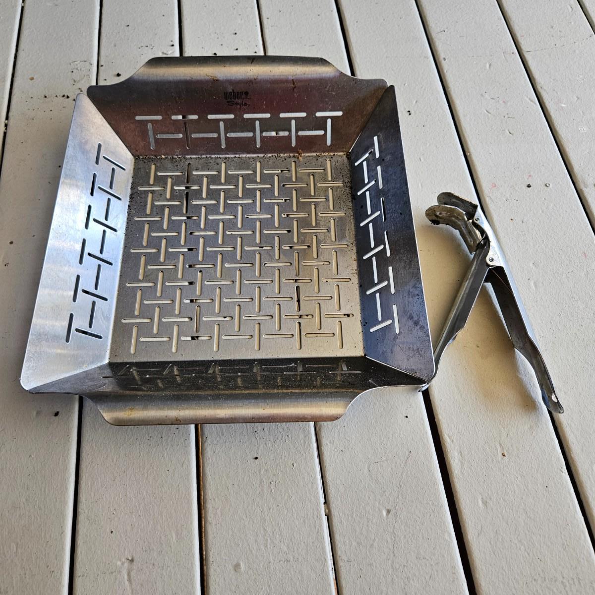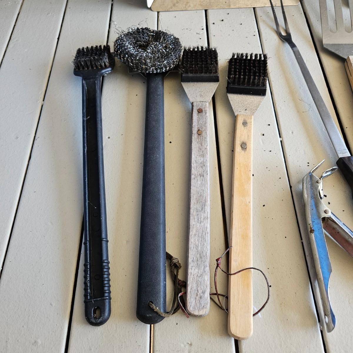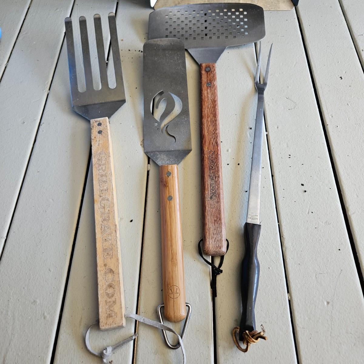 An assortment of grilling utensils that includes spatulas, tongs, leather gloves, wire brushes and more. The vegetable basket measures approximately 14" x 11.5" x 2.5"H. Lighter content/quantity of fluid cannot be confirmed. Local pickup only