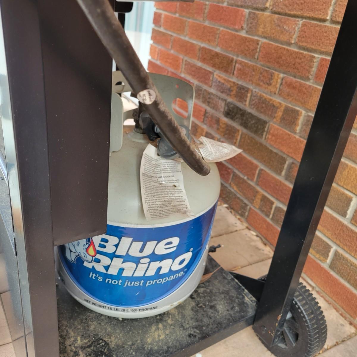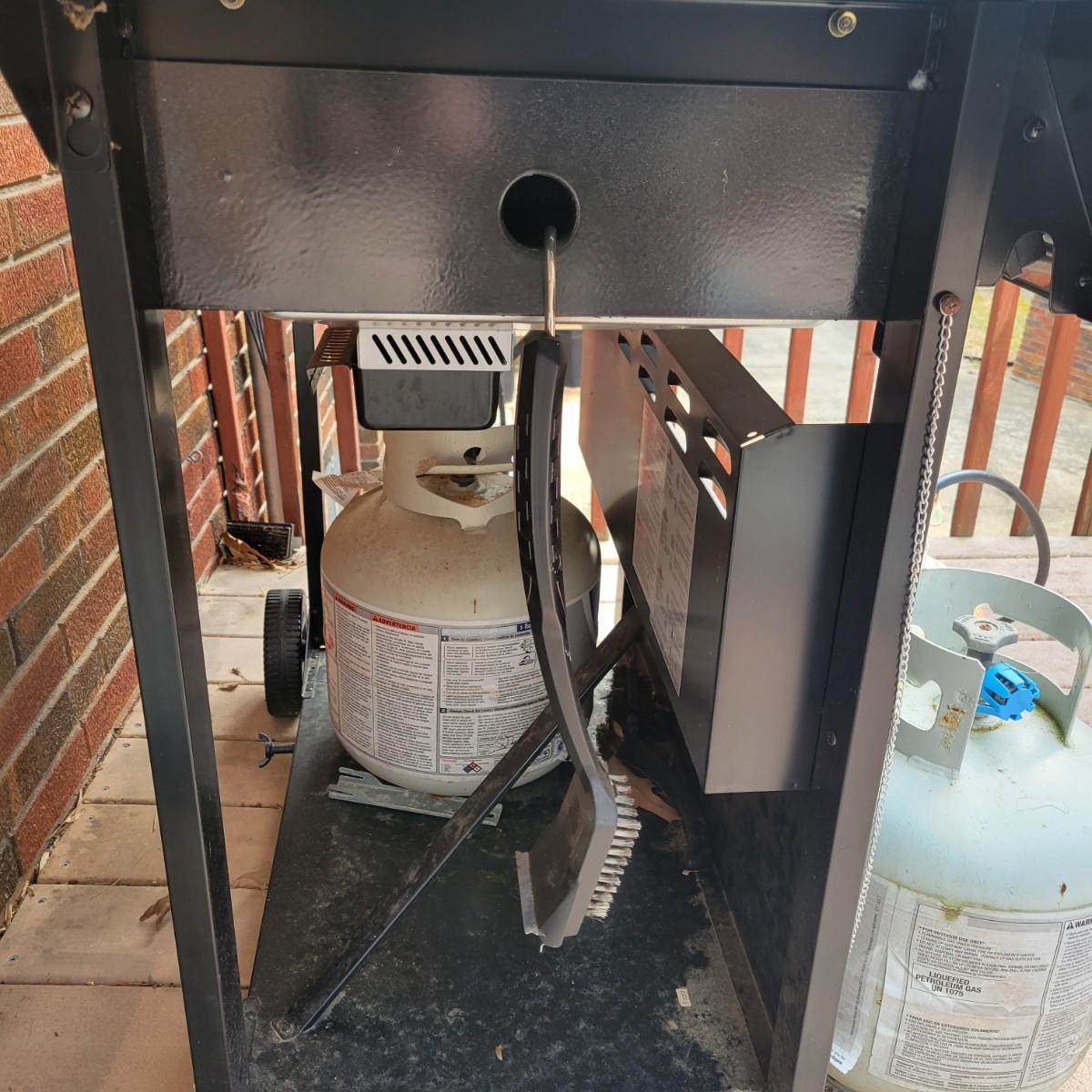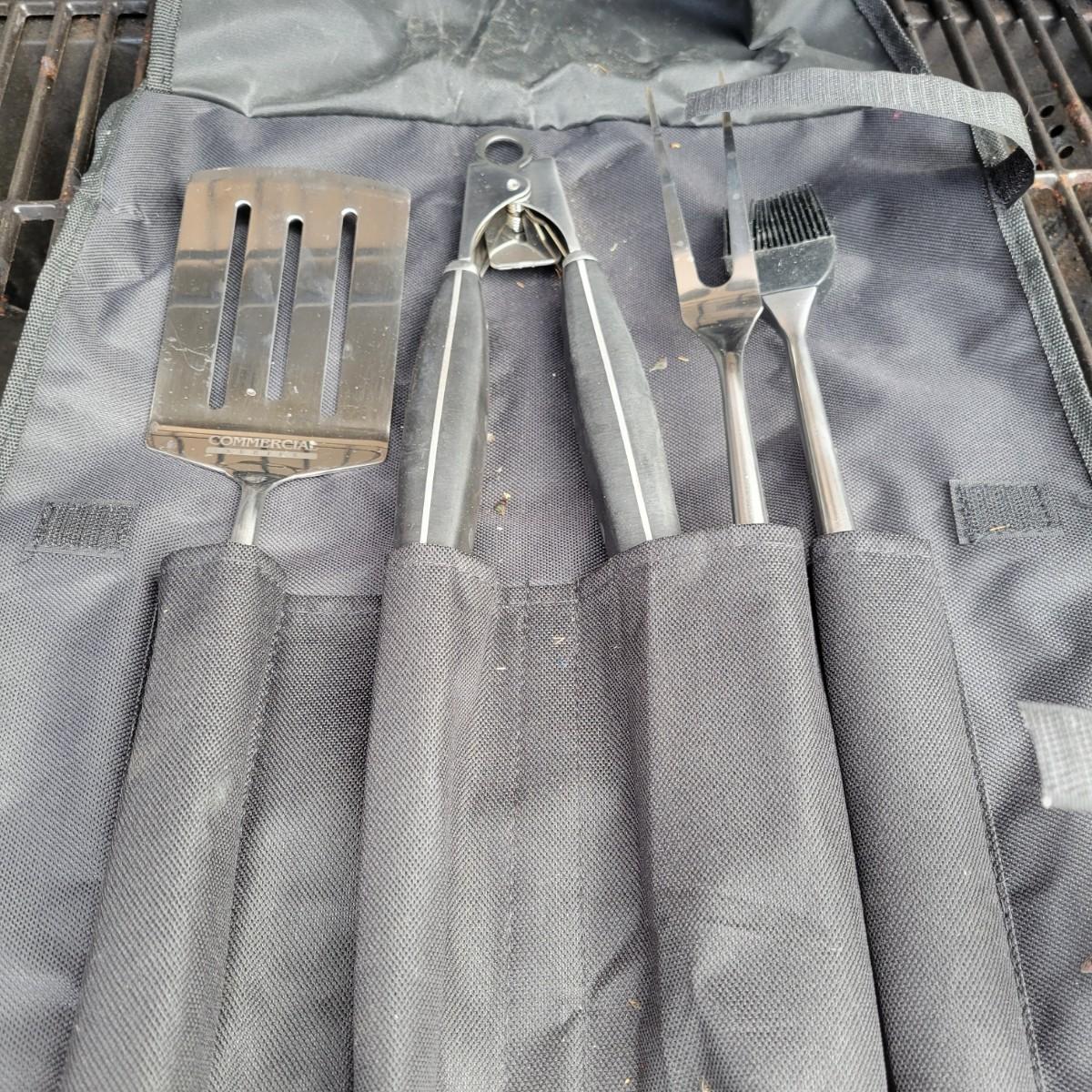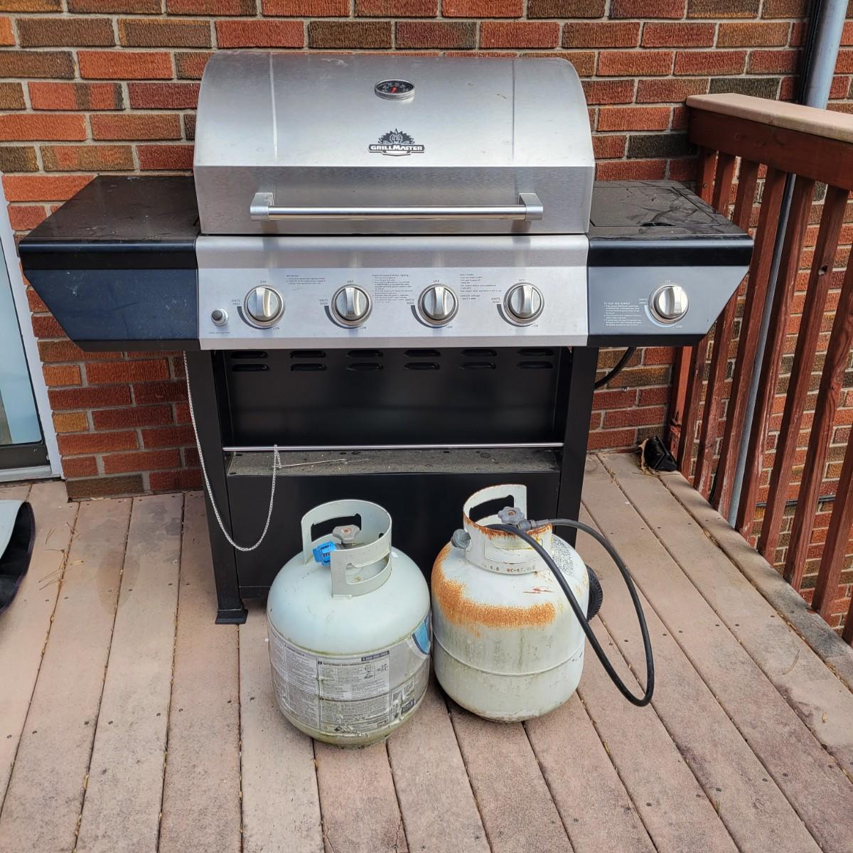 This is a GrillMaster four burner propane grill with a side burner. Grill fired up when tested. Lot also includes a set of grilling tools, a cover and three propane cylinders. Measures approximately 25" x 22" x 46". Local pickup only. Winning bidder must bring assistance to help move and load this item due to its weight and/or size.
