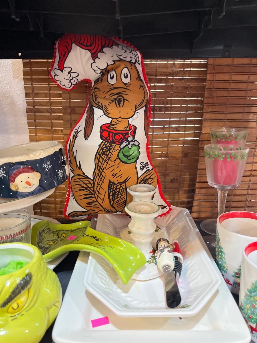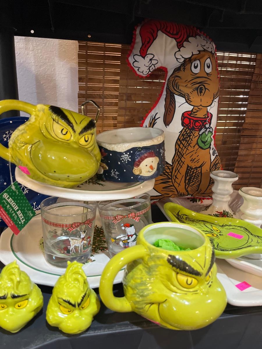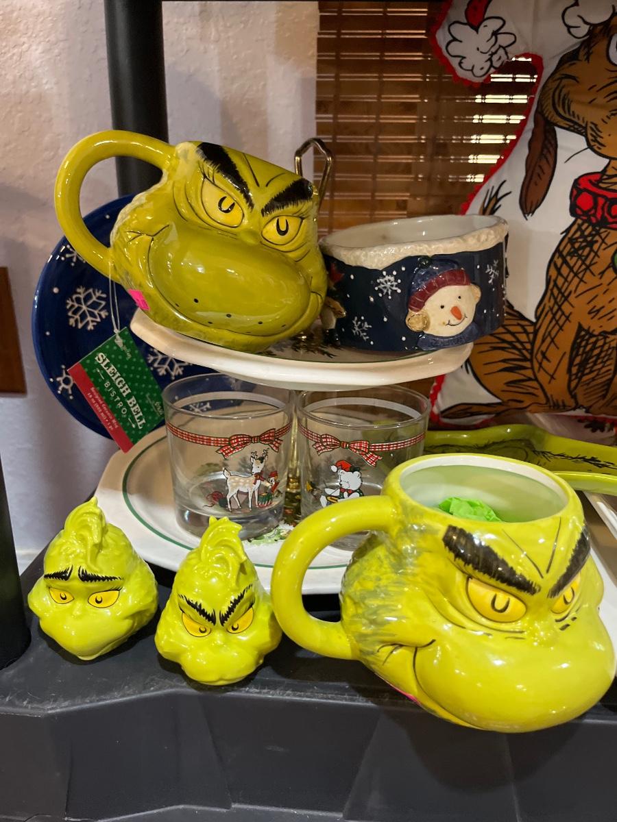 Grinch Cups, s&p and spoon rest. Platters and more.
