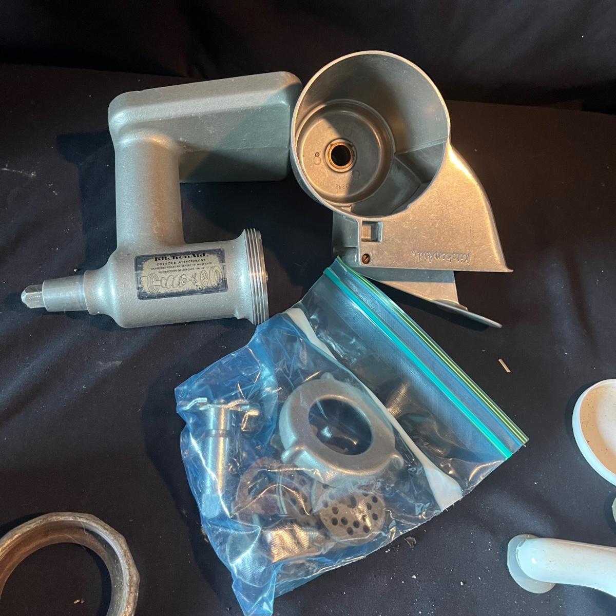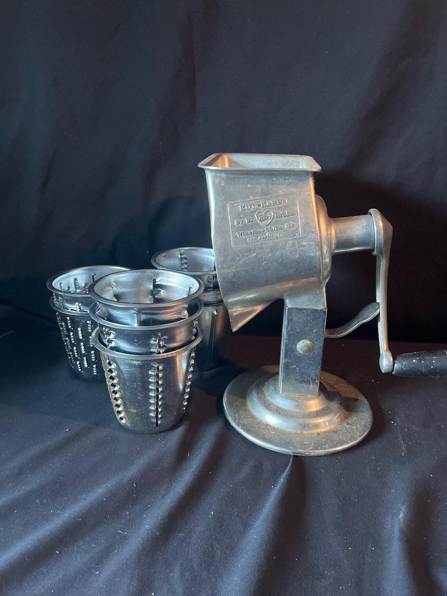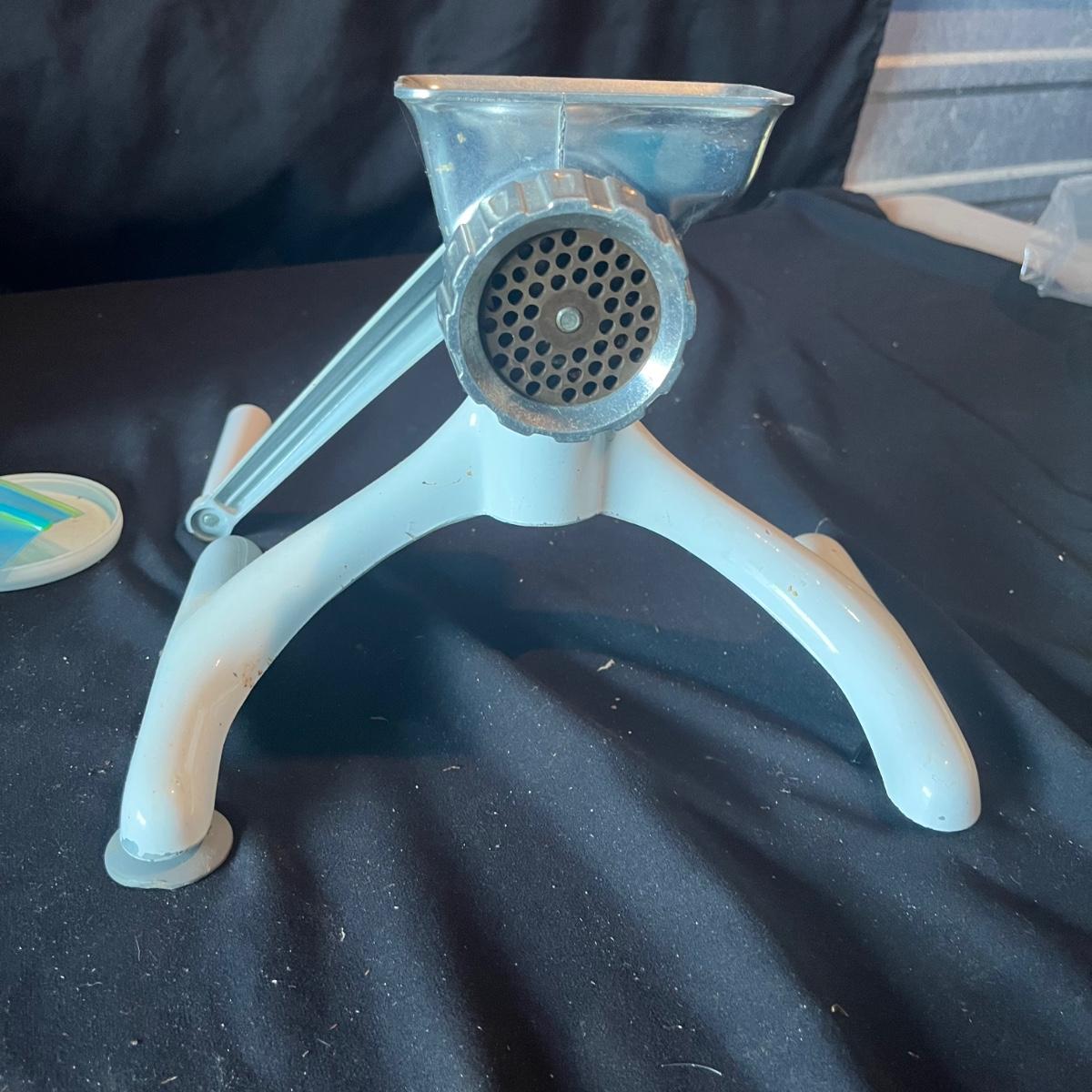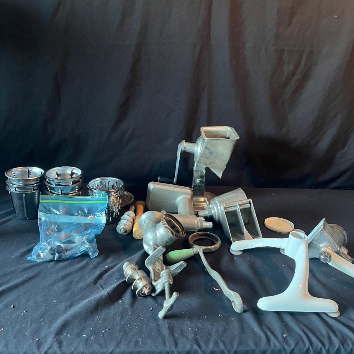 Lot includes a Kut Kleen Peeler, Best Made Grinder, unmarked grinder and two Kitchen Aid attachments. Kut Kleen measures 6” x 8” x 11”.