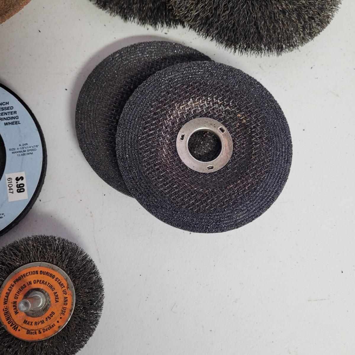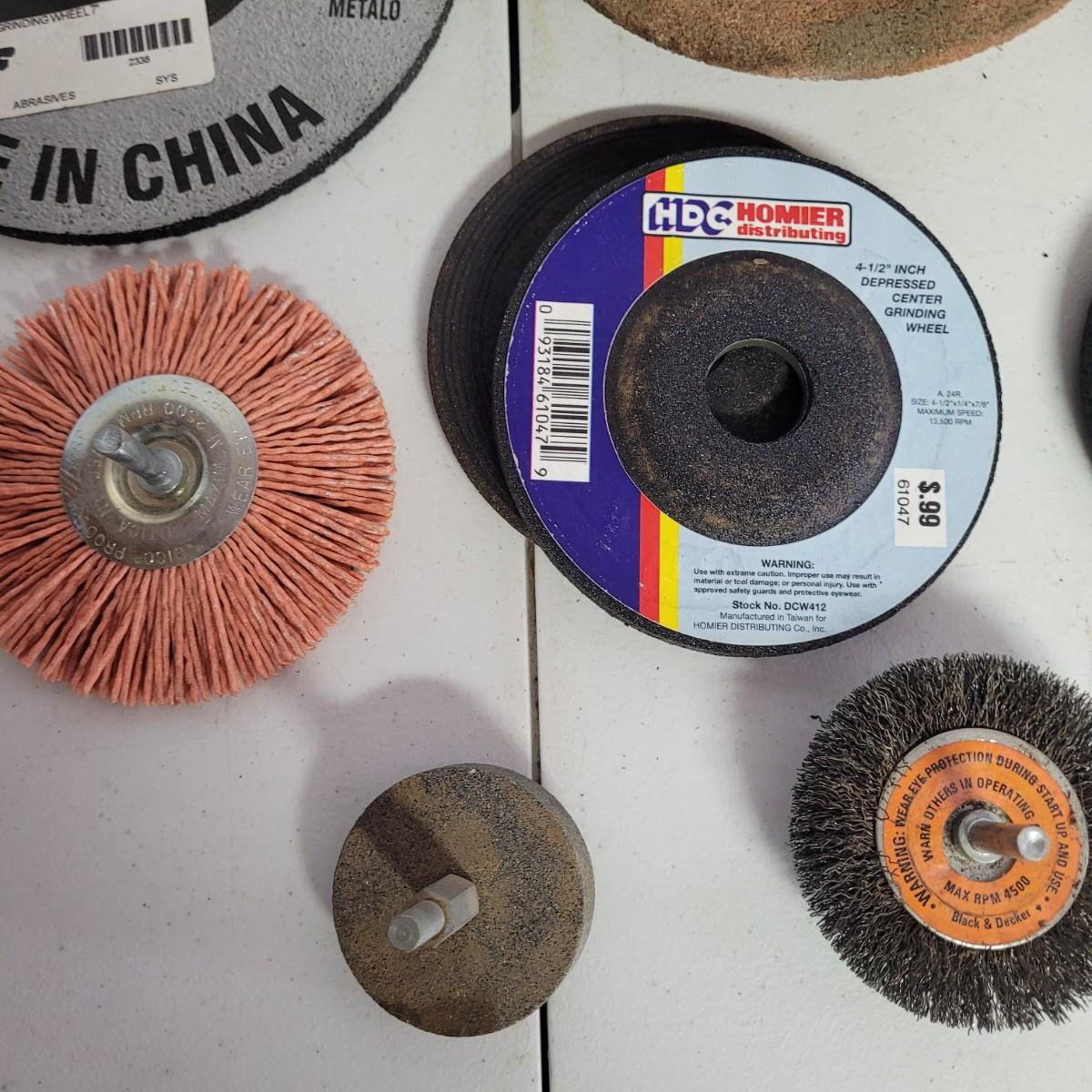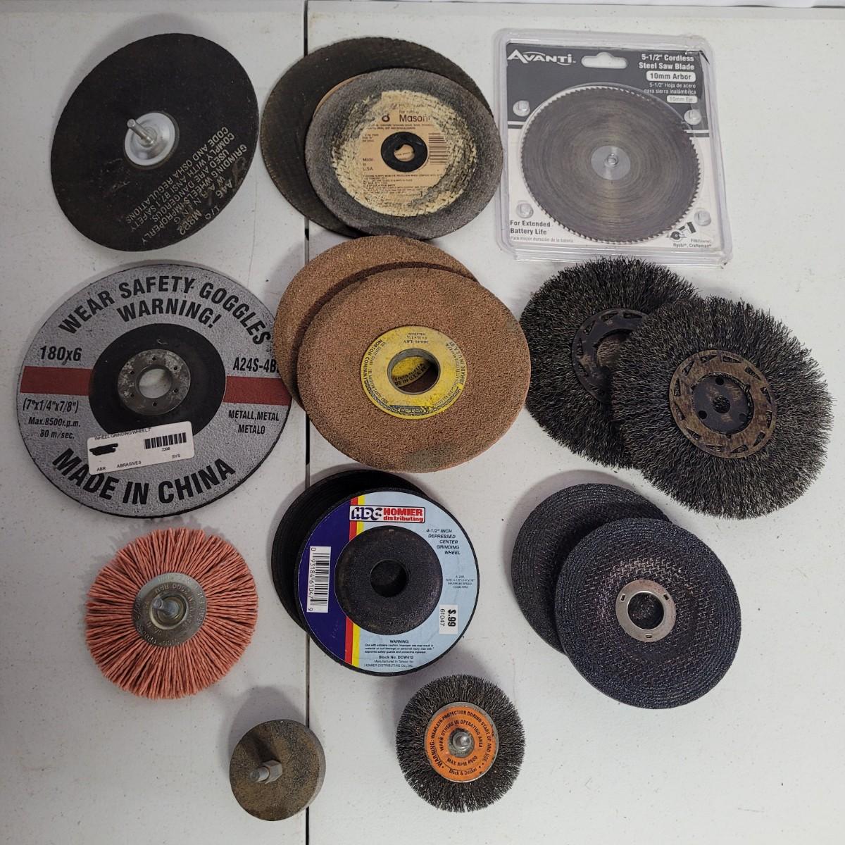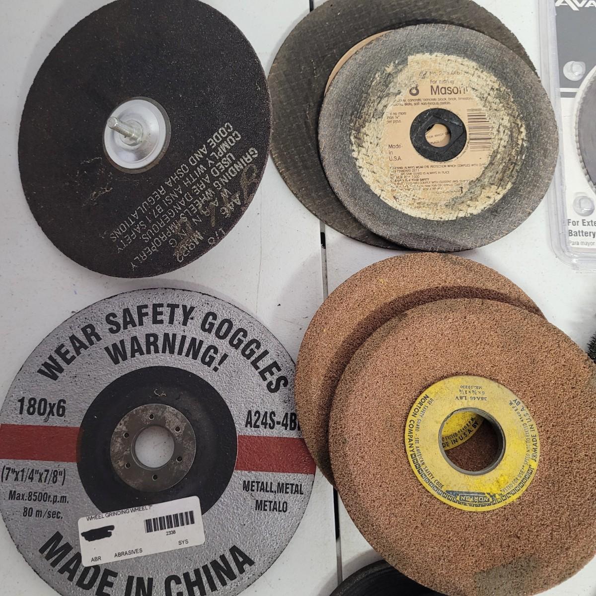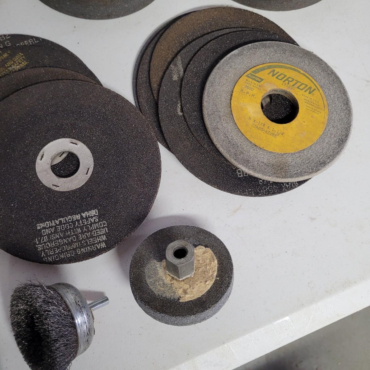 This lot includes a large variety of grinding wheel attachments. There are many different types of wheels or disks in varying conditions. Some are brand new, and some have been used lightly to moderately. The largest wheel measures 8" across and the smallest measures 2" across. See photos for more detail on individual items.