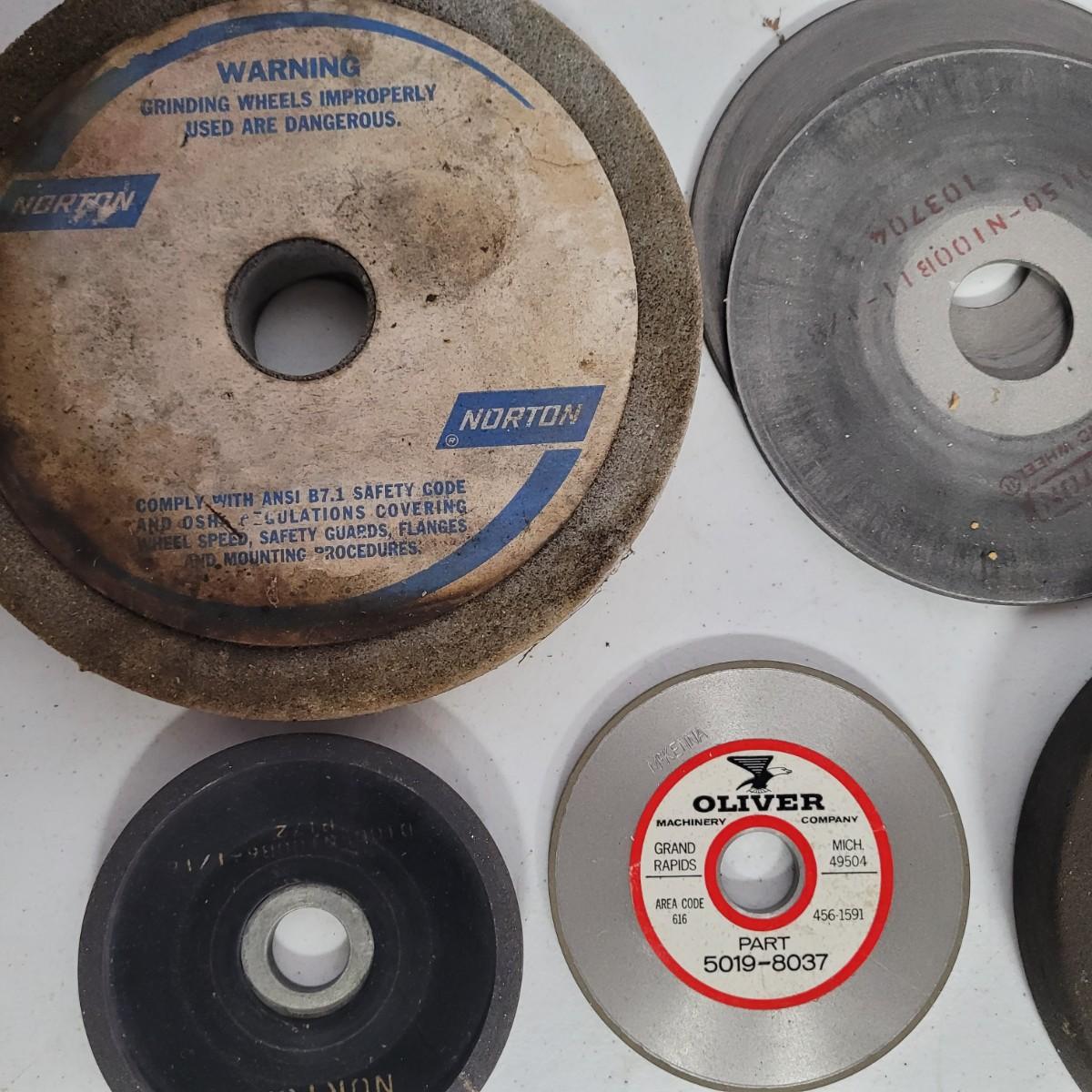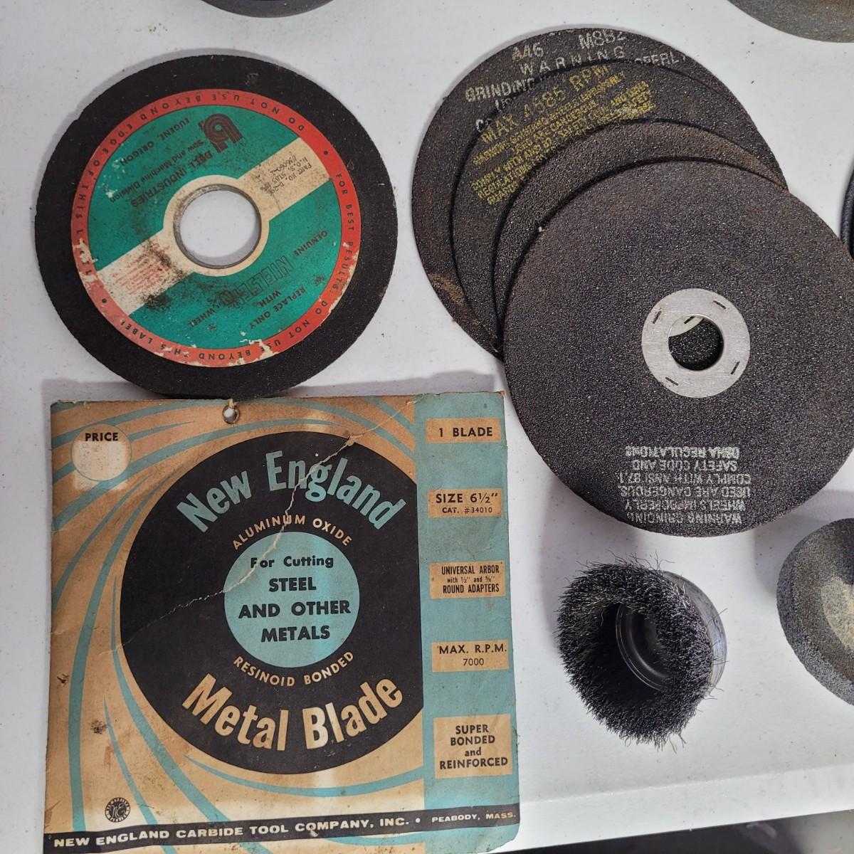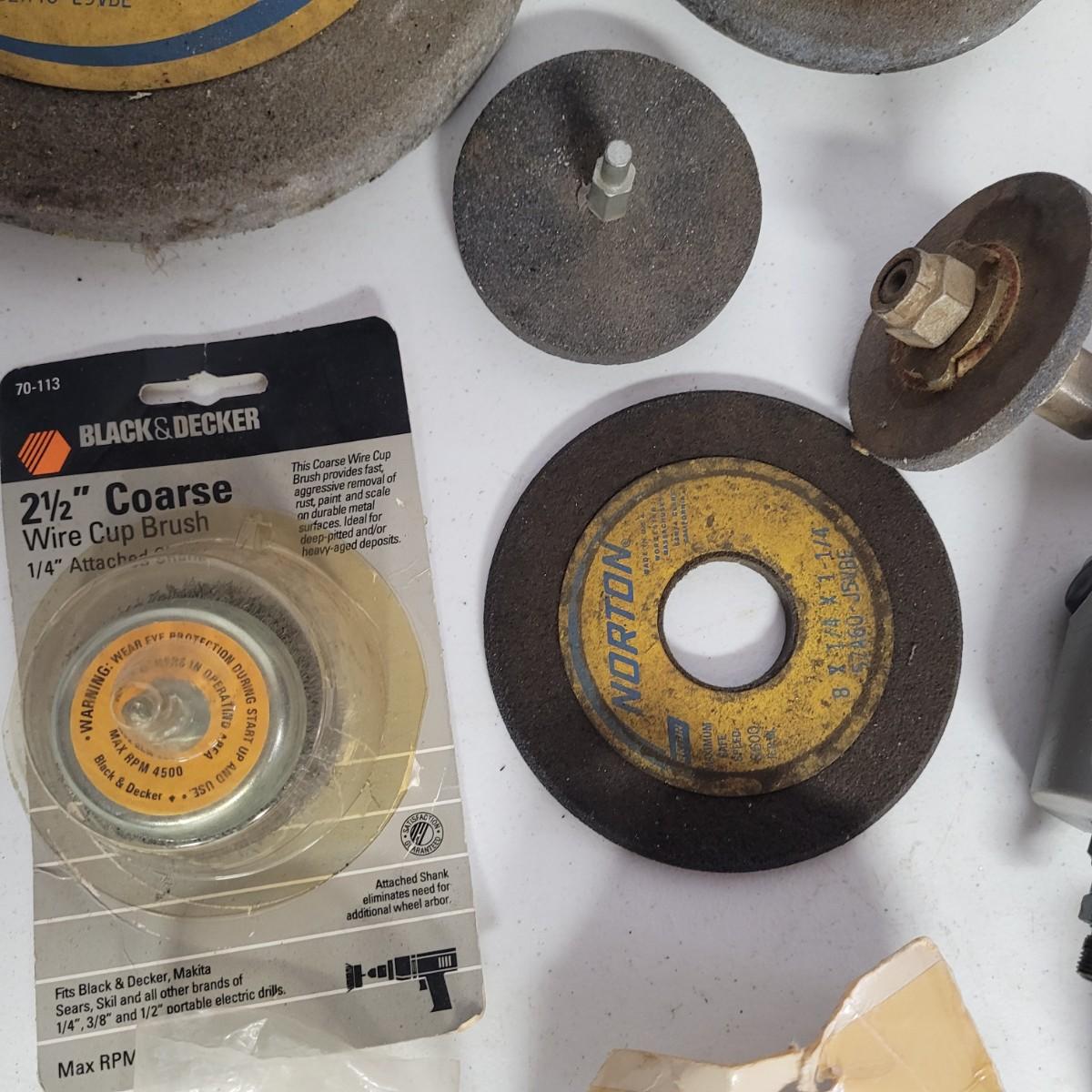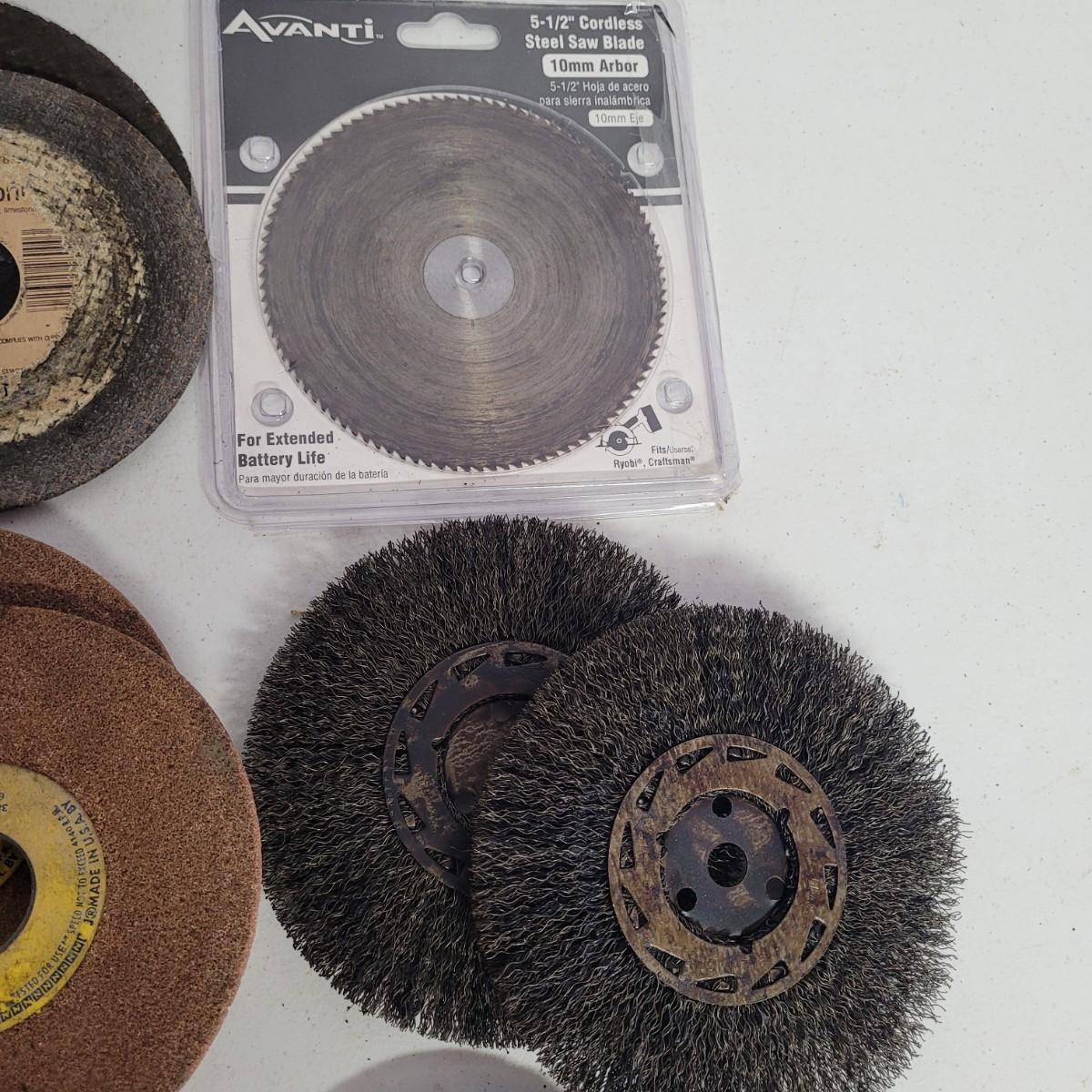 This lot includes a large variety of grinding wheel attachments. There are many different types of wheels or disks in varying conditions. Some are brand new, and some have been used lightly to moderately. The largest wheel measures 8" across and the smallest measures 2" across. See photos for more detail on individual items.