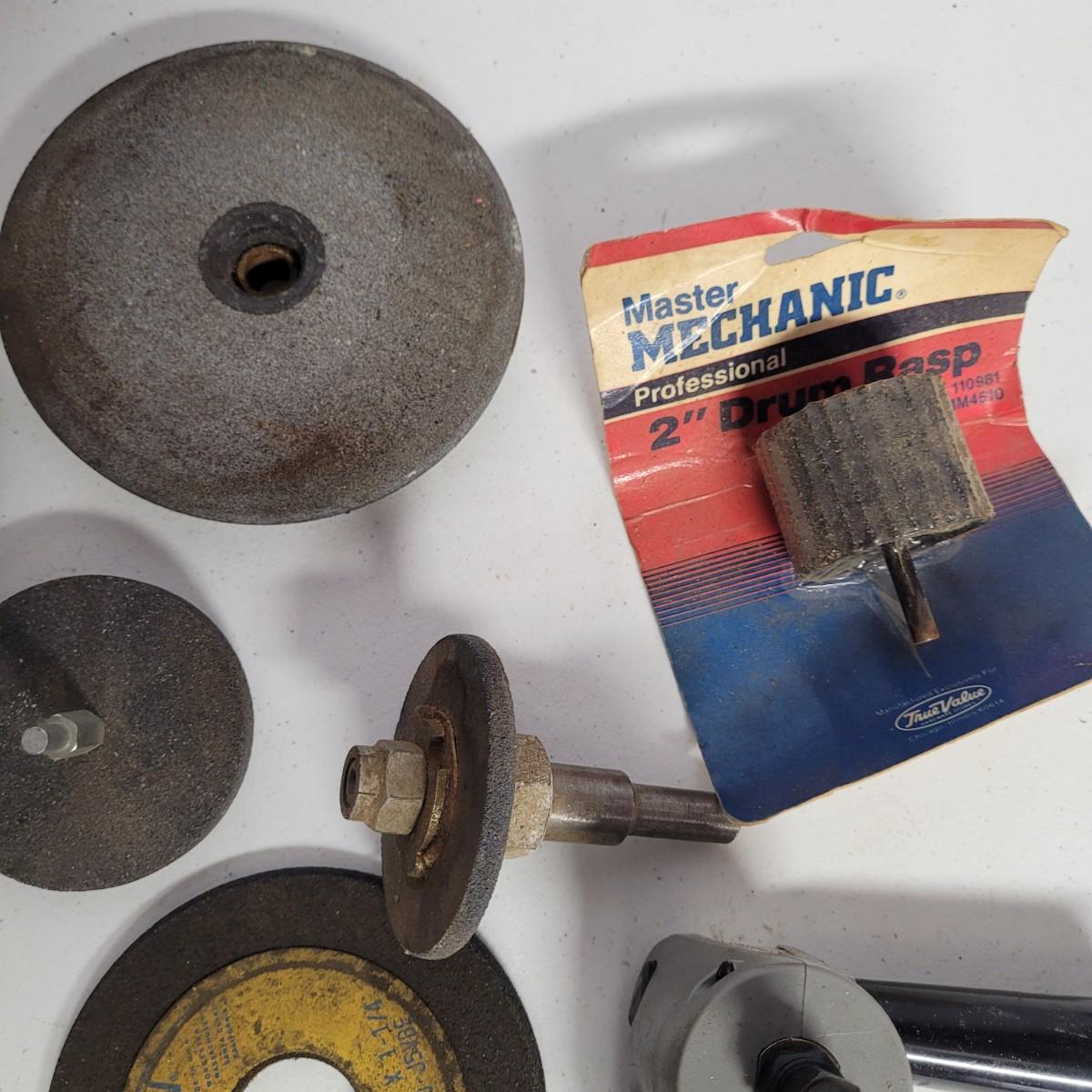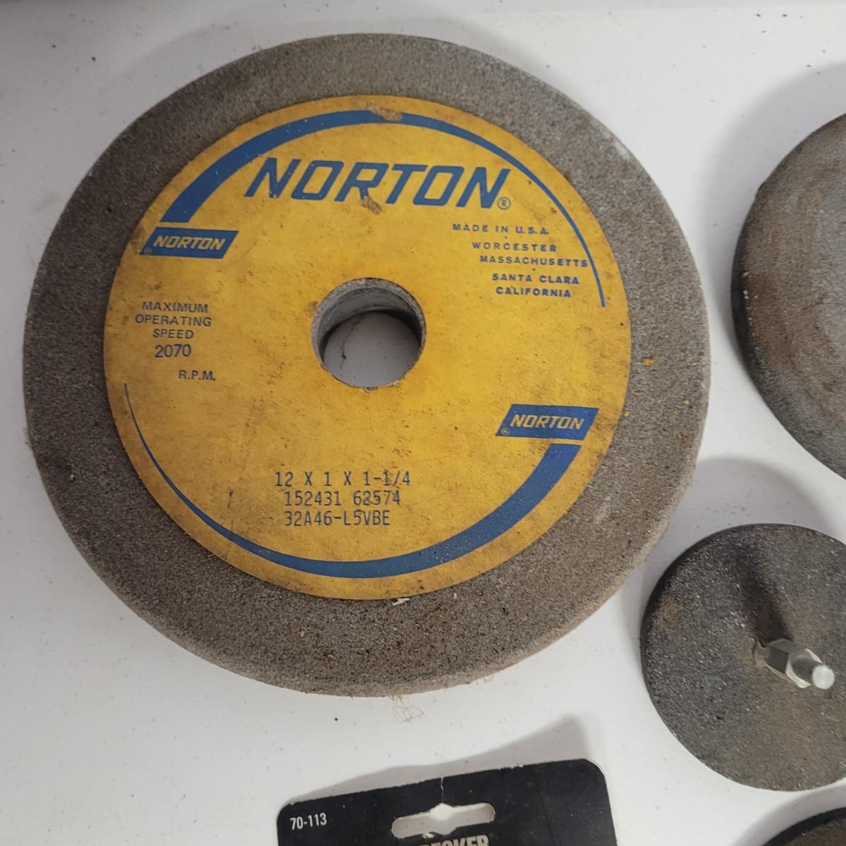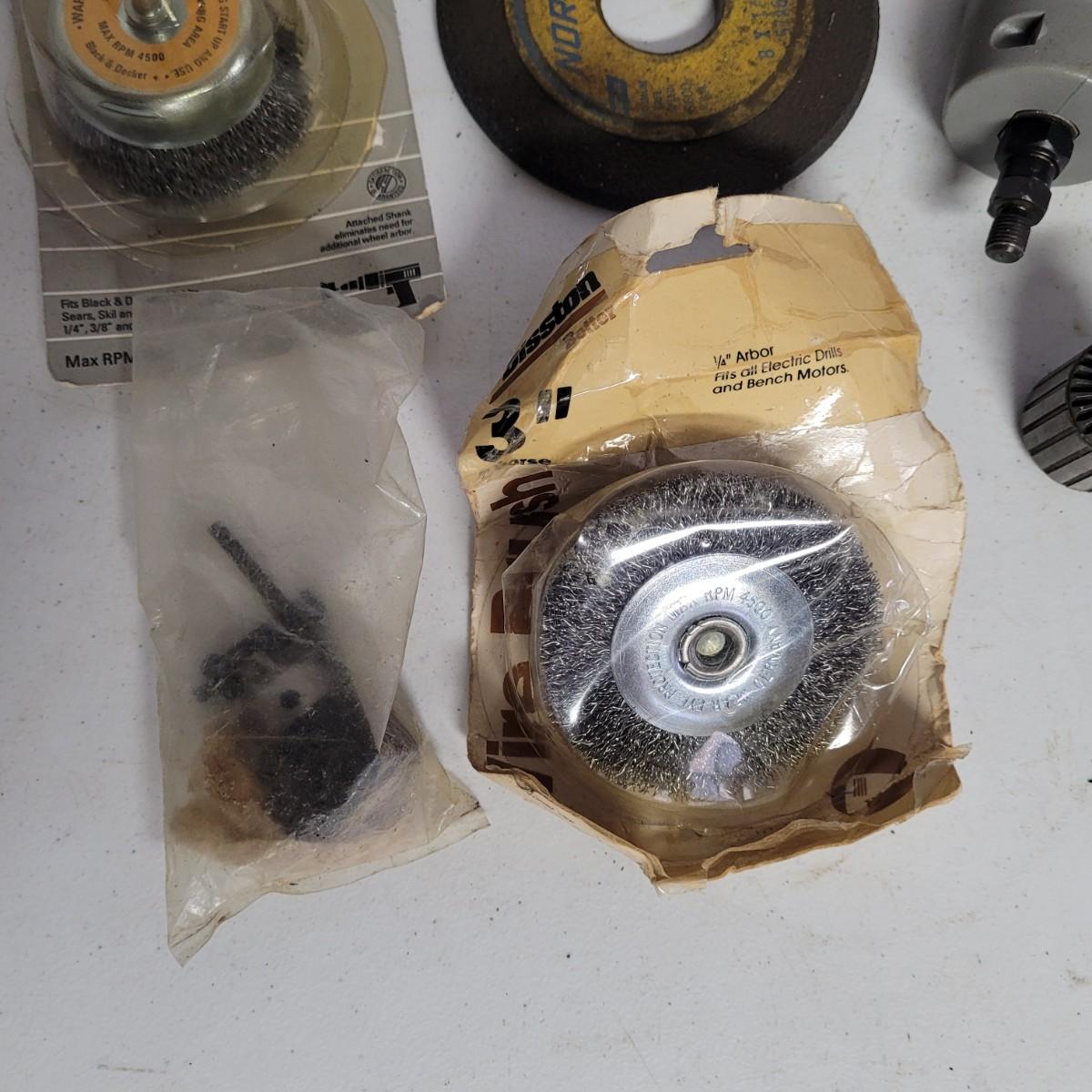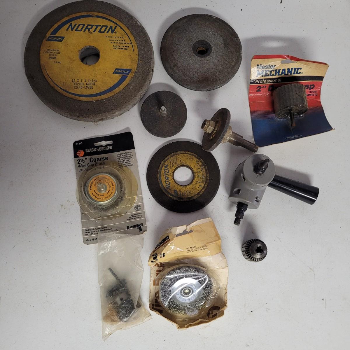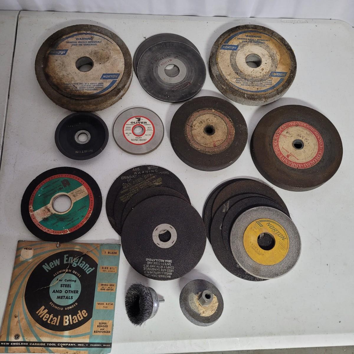 This lot includes a large variety of grinding wheel attachments. There are many different types of wheels or disks in varying conditions. Some are brand new, and some have been used lightly to moderately. The largest wheel measures 8" across and the smallest measures 2" across. See photos for more detail on individual items.