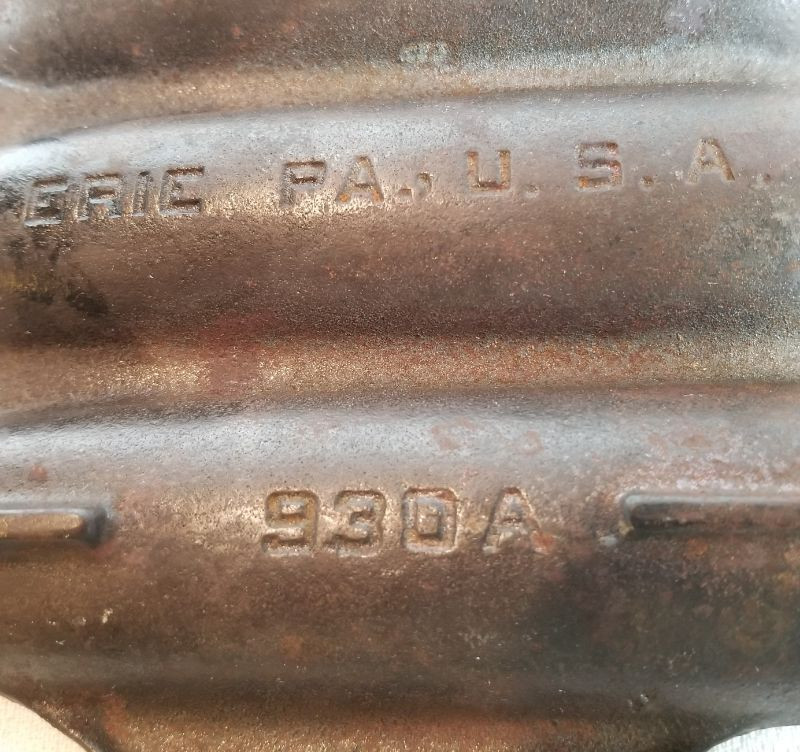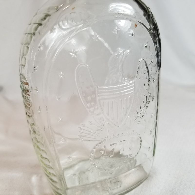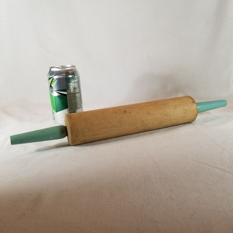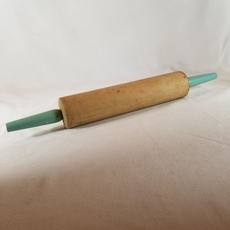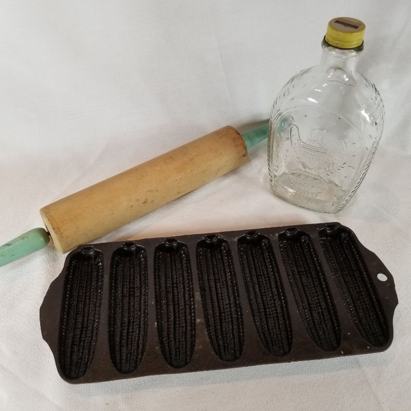 A three-piece kitchenware collection. A very nice Griswald "Crispy Corn Stick Pan" #273, also marked Erie, PA USA 930A. Condition is consistent with age and use. Some minor rust on bottom - overall in very good condition. There is a Log Cabin 1776 reproduction bottle from 1976 in very good condition, and lastly an Aqua-handled vintage wooden rolling pin in very good condition consistent with age and use.
