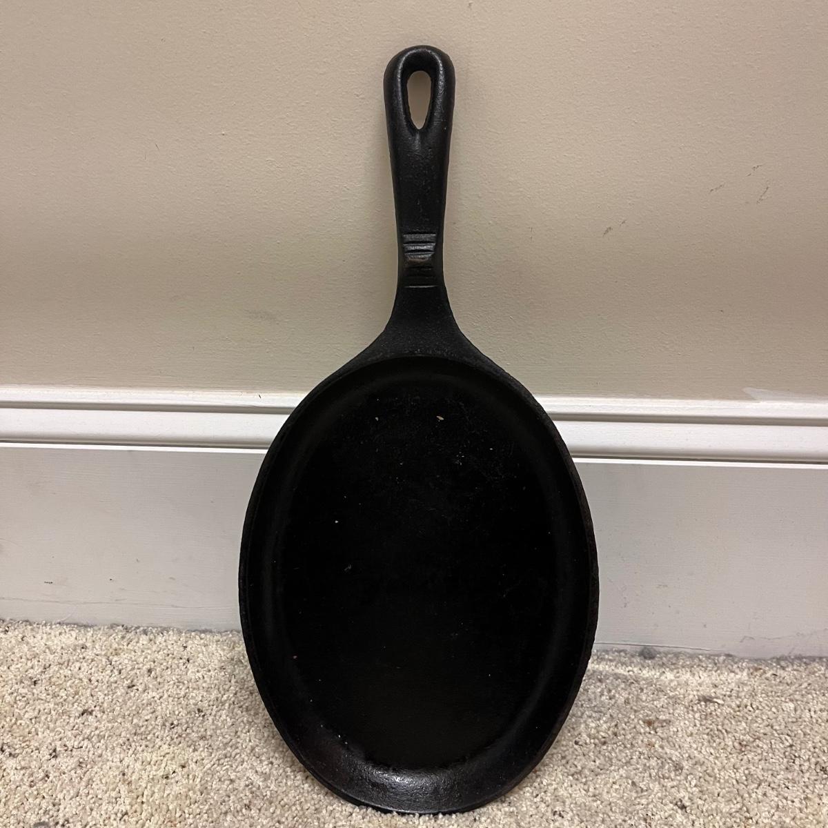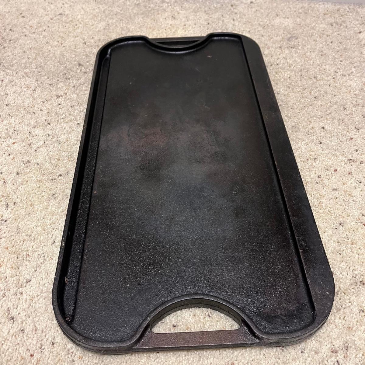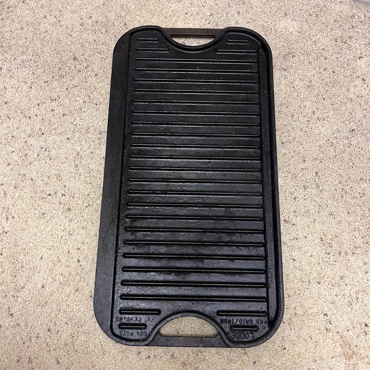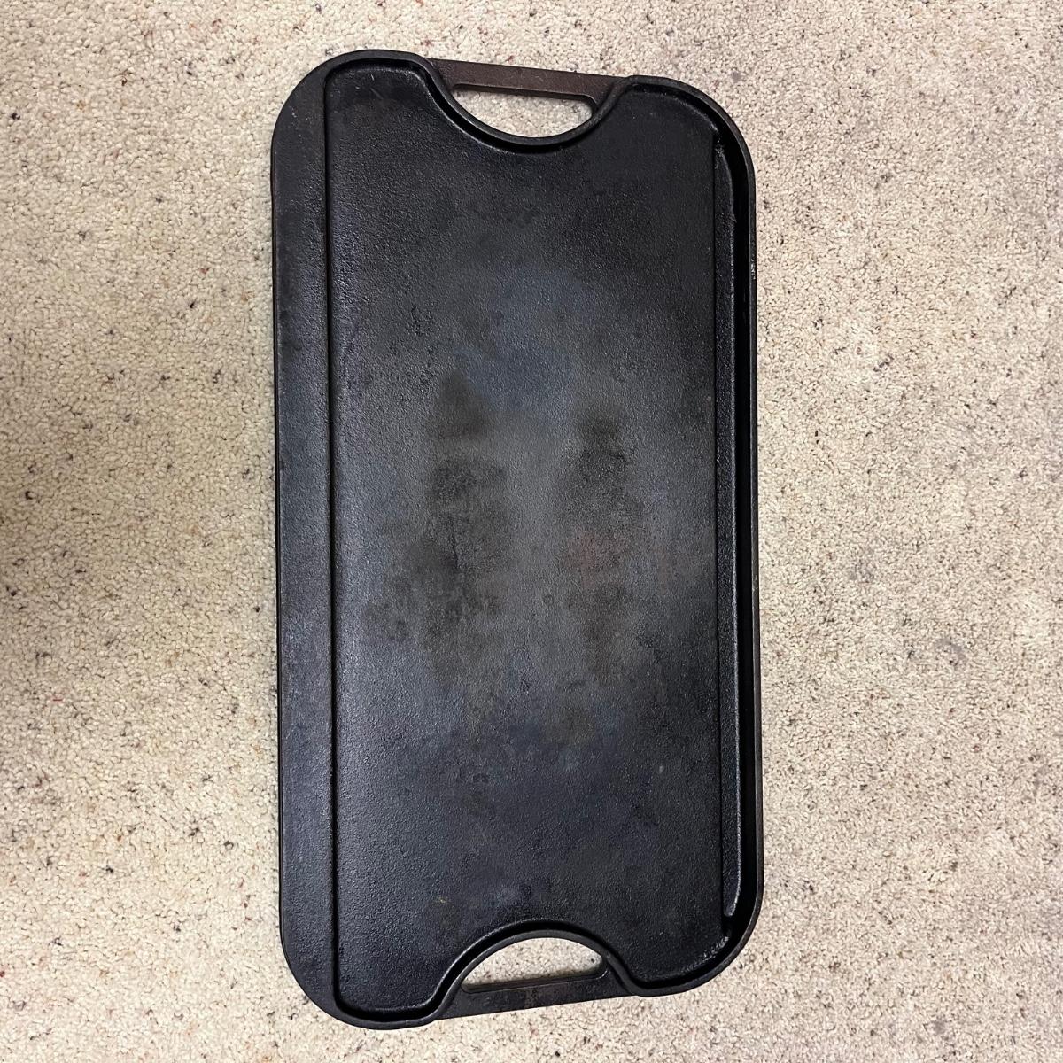 This lot includes five cast iron items. The largest is a two sided Lodge griddle that has drain trays on both sides and measures 20.25” x 10.5”. Also three cast iron pans with handles. The oblong is labeled Corona and the smallest round pan is labeled Griswold. And finally a bacon press labeled Old Mountain.