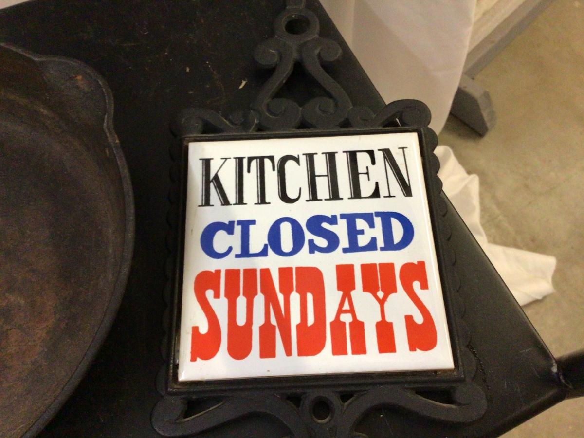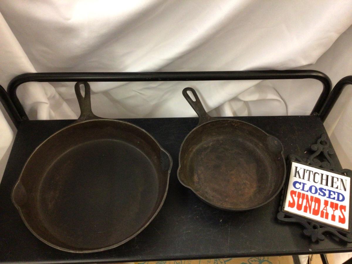 You get two nice Griswold cast iron frying pans size 8 and 5. You also get a cast iron and pottery trivet with Kitchen Closed Sundays.