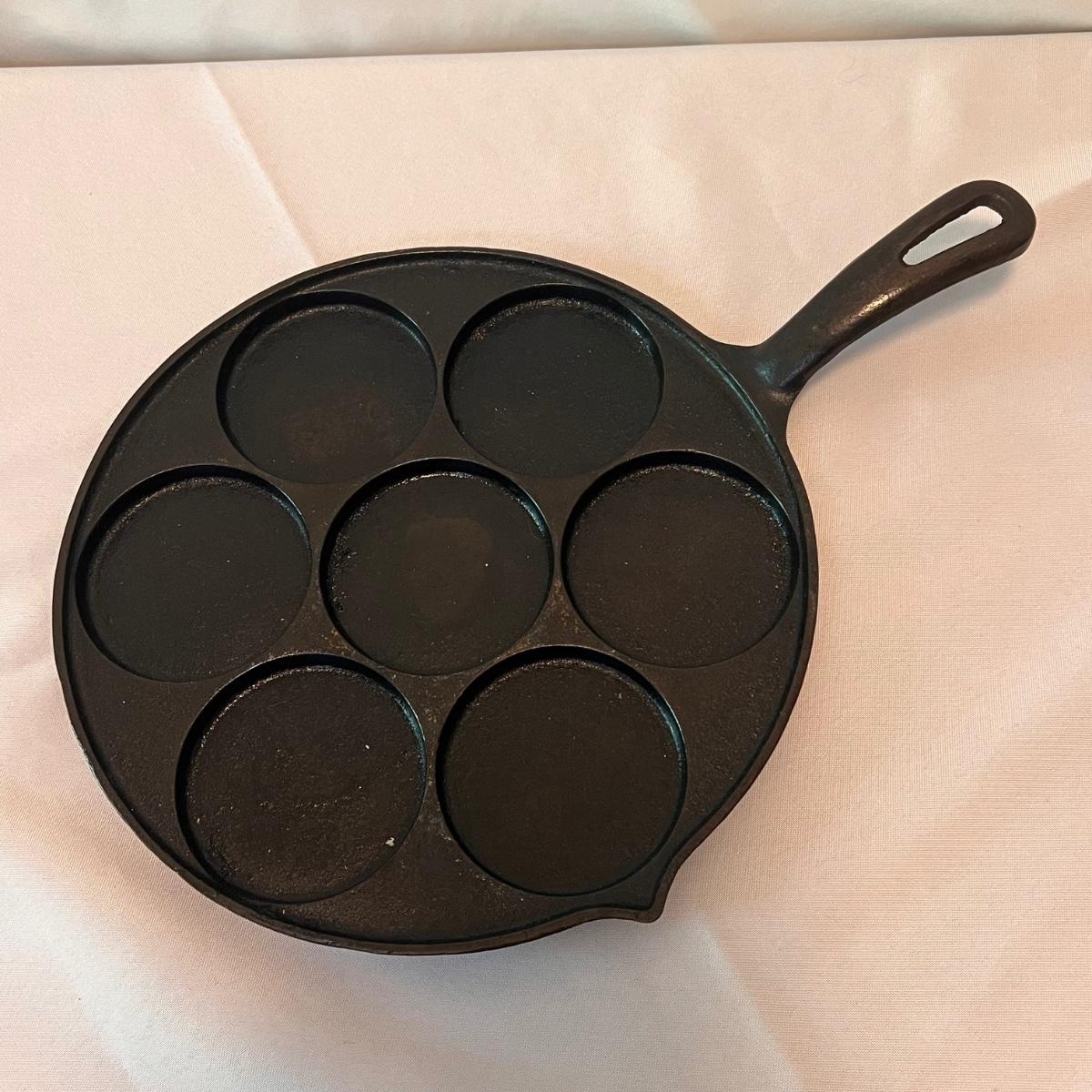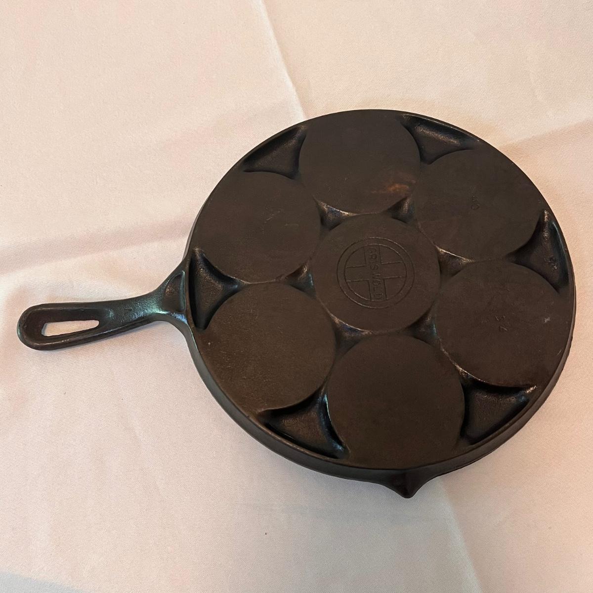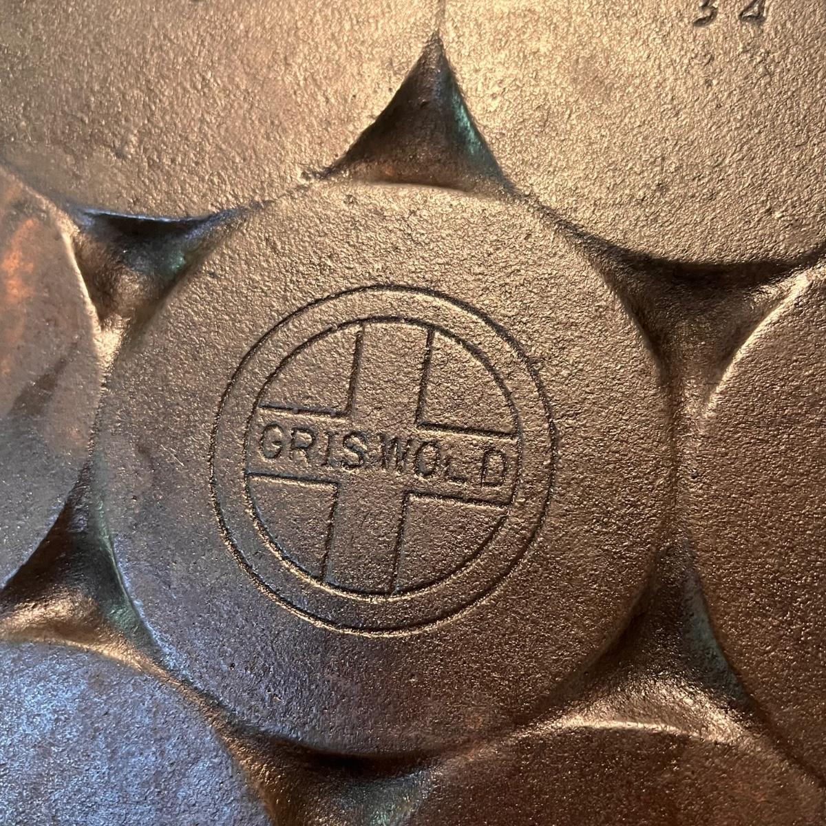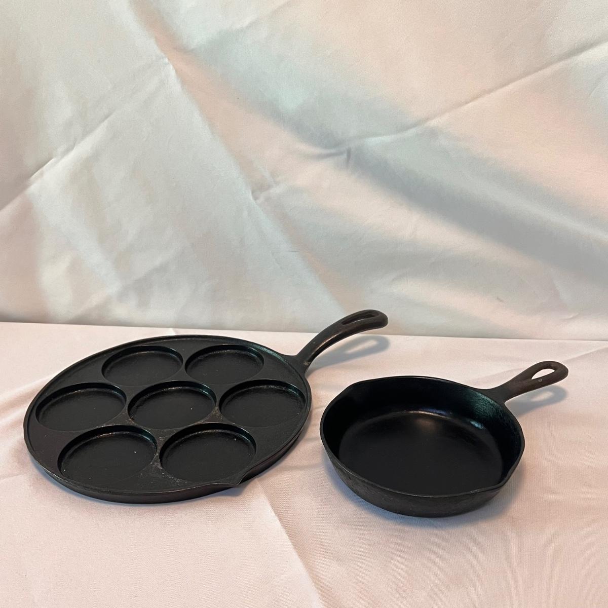 This lot includes one No. 34 mini pancake Griswold cast iron and one egg skillet - The pancake cast iron measures 13.75” x 10” and the Martin Stove & Range egg skillet measures 10” x 1”H. Both look great for their likely age. Shipping available.