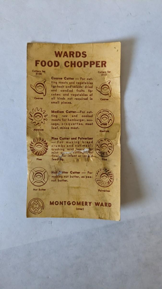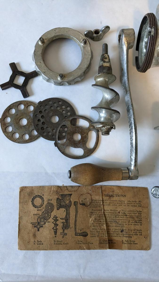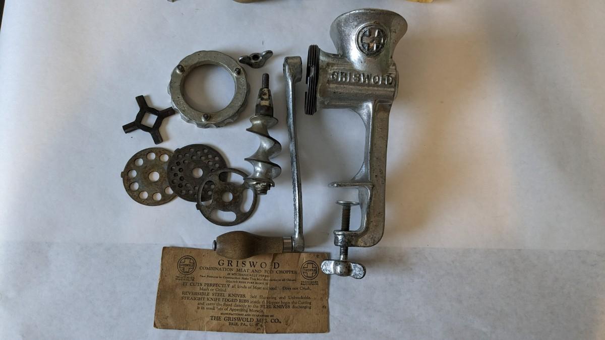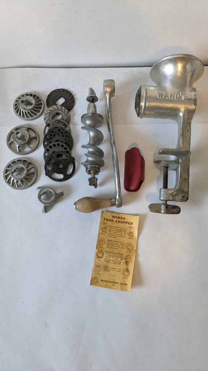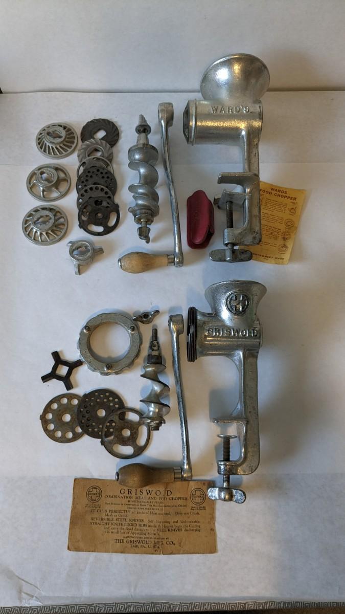 Two excellent antique grinders in fully functional condition including Griswold #1112 and Wards 10" with all attachments as well as original paperwork. Both pieces are in the best condition this cataloger has seen. The Wards food chopper is perfect for a lot of current homesteading uses.