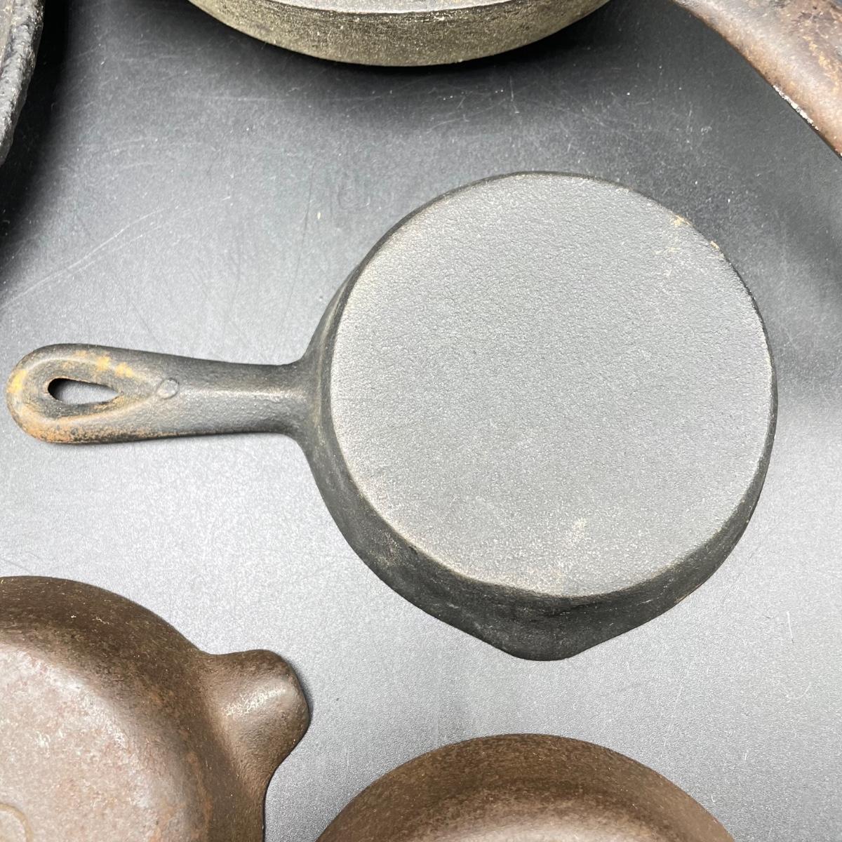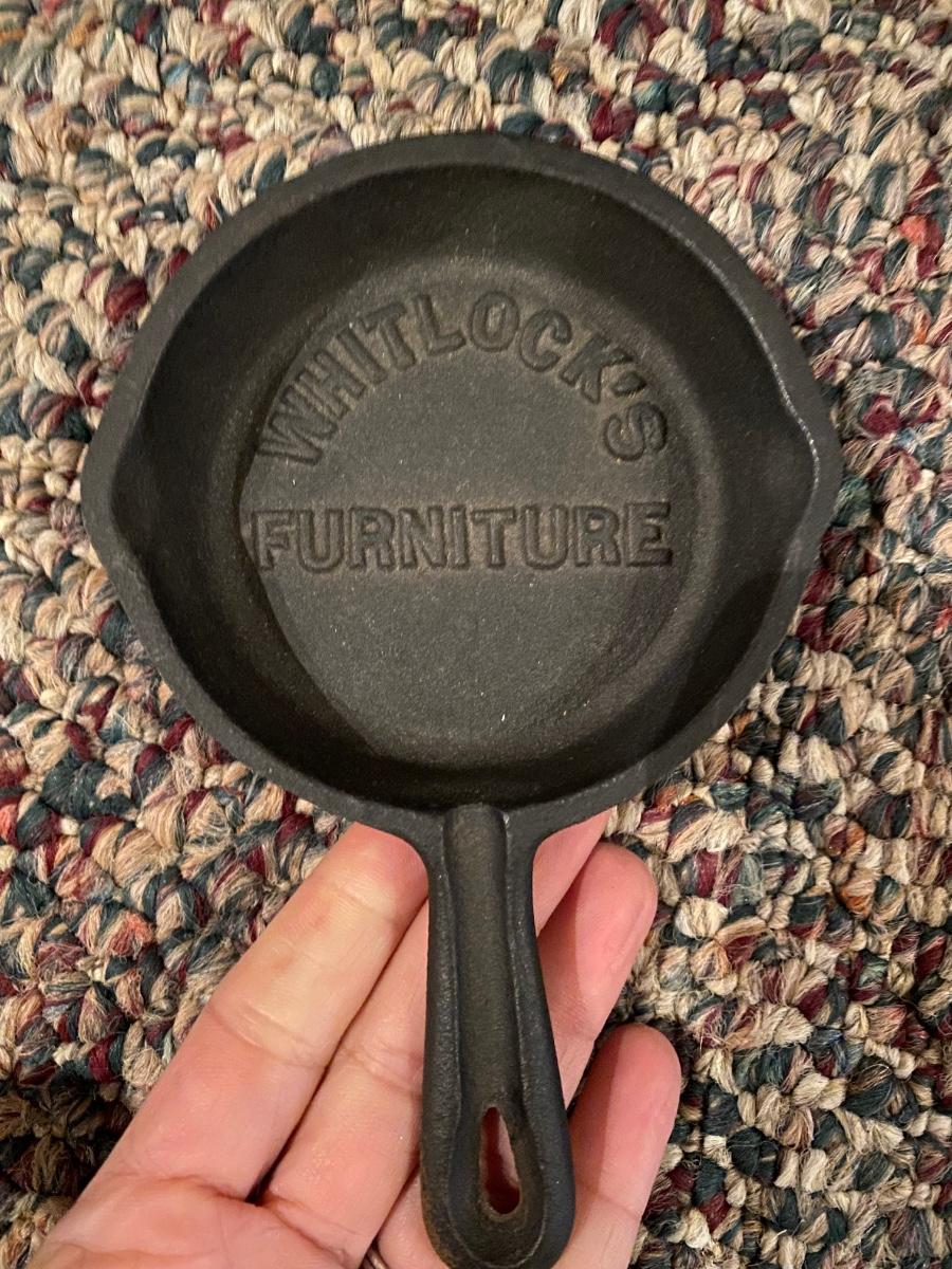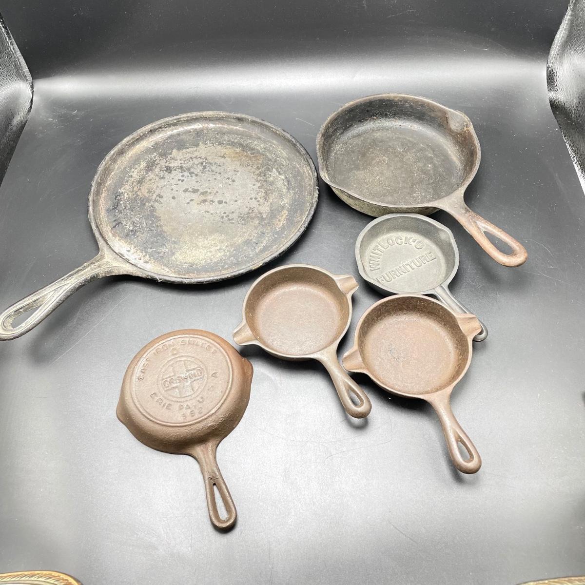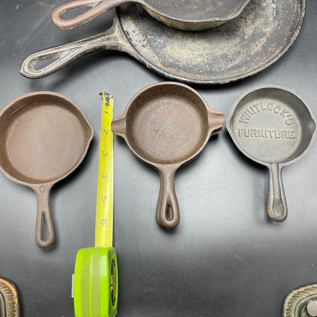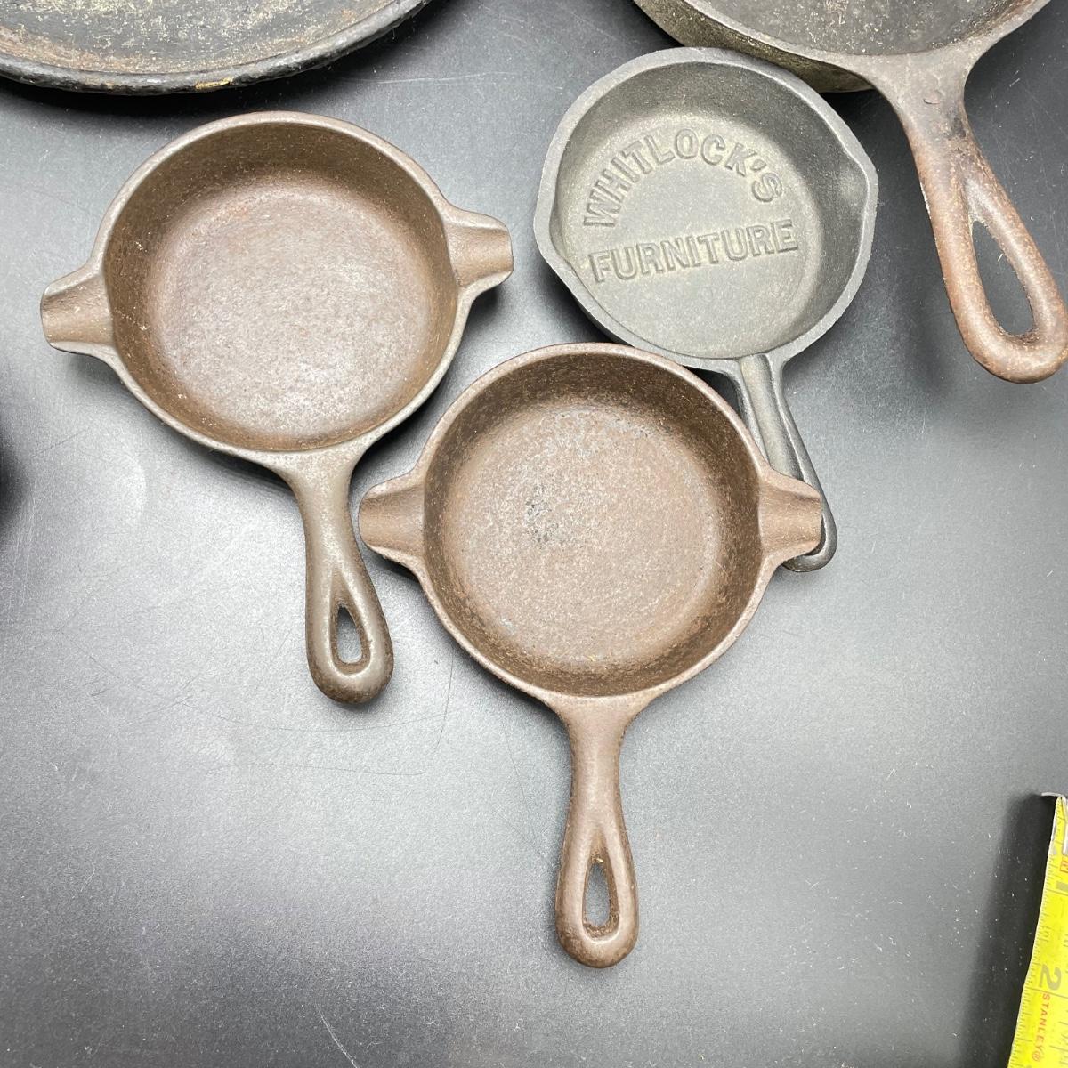 Rare Griswold Zero salesman sample that measures 4”. Also two small WagnerWare skillets that are also likely samples. A larger wagonware 7”skillet has its stamp mostly faded. Lot also includes an antique 9” skillet that looks like it has a 7 on the bottom and a mini Whitlock’s Furniture advertisement skillet. See images. Shipping available.