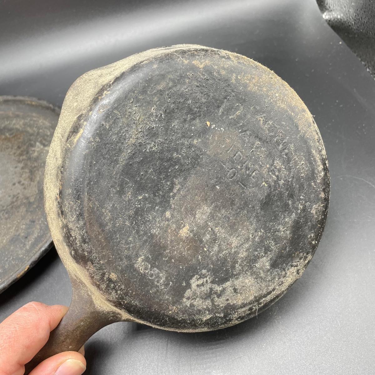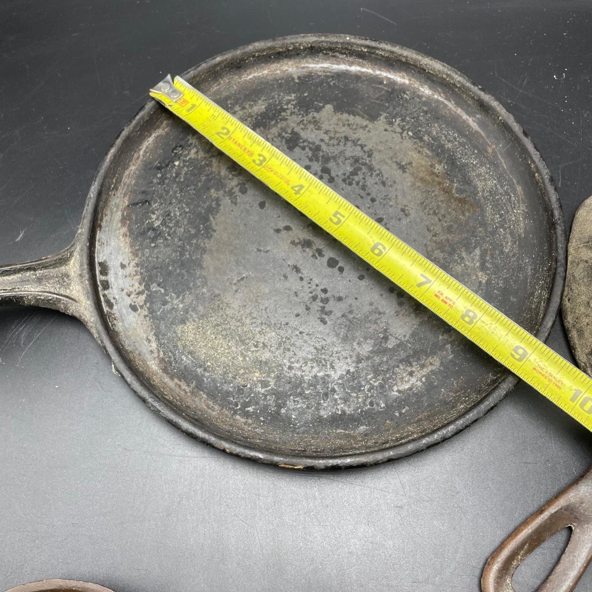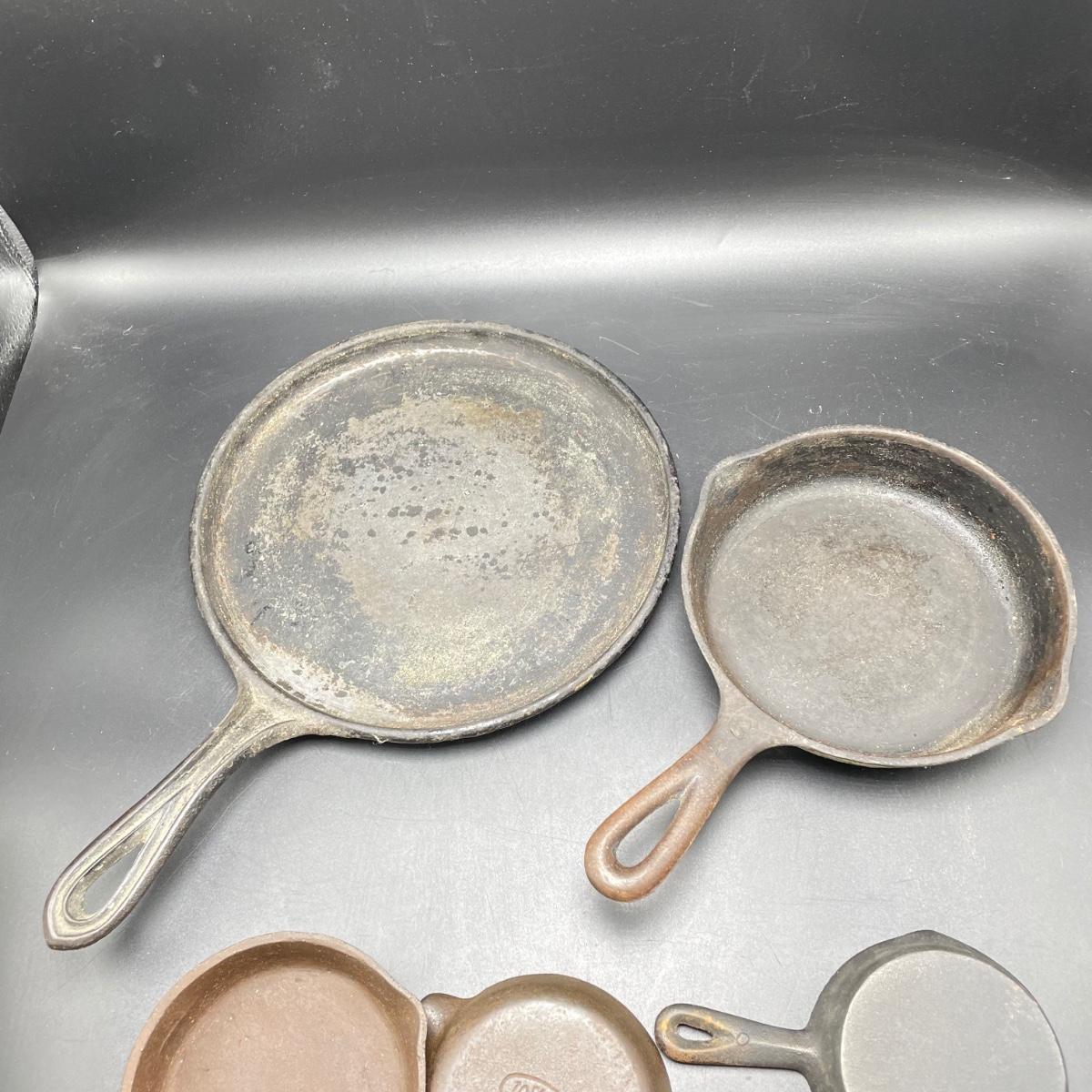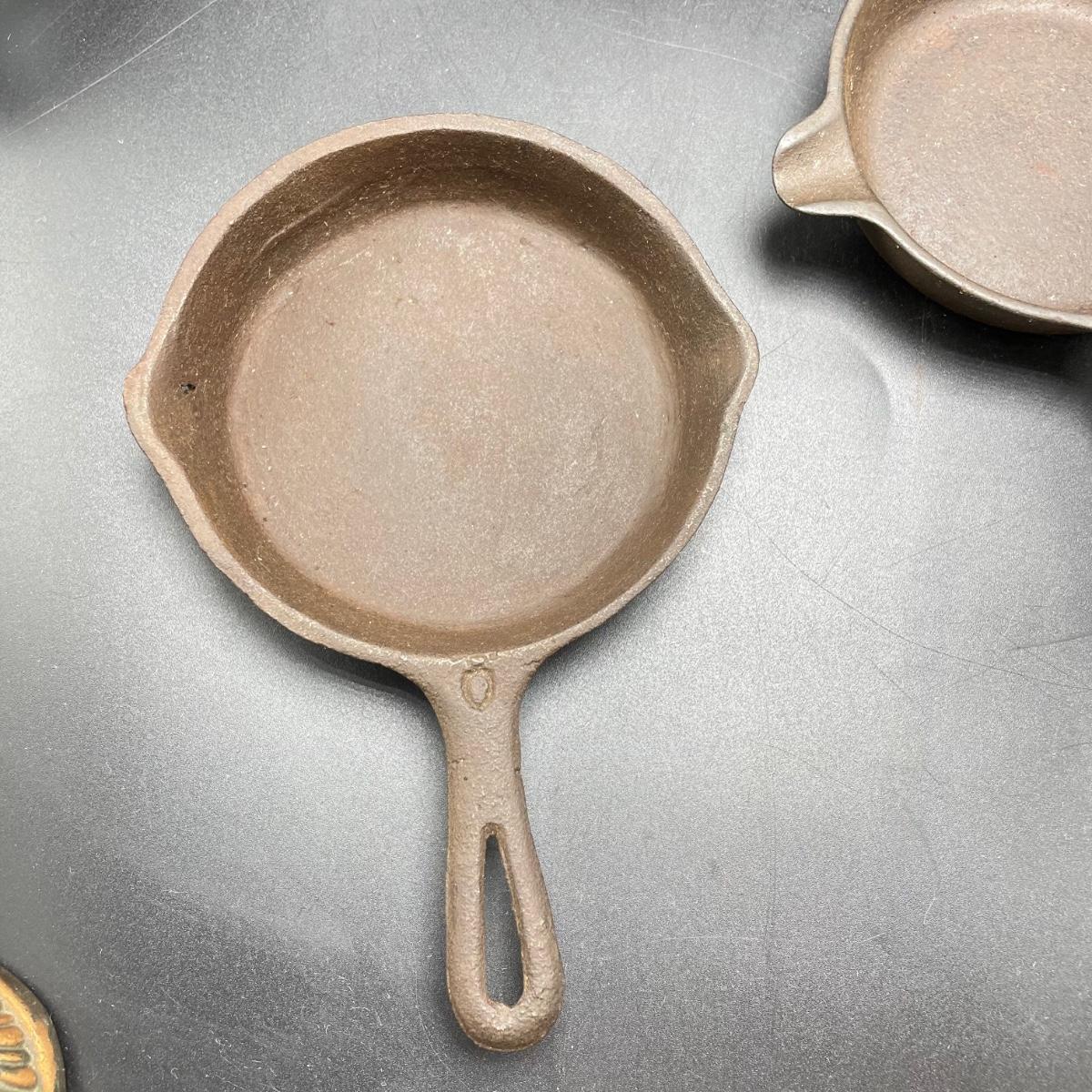 Rare Griswold Zero salesman sample that measures 4”. Also two small WagnerWare skillets that are also likely samples. A larger wagonware 7”skillet has its stamp mostly faded. Lot also includes an antique 9” skillet that looks like it has a 7 on the bottom and a mini Whitlock’s Furniture advertisement skillet. See images. Shipping available.