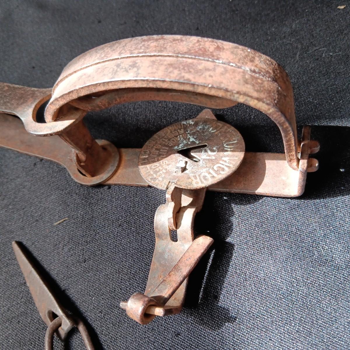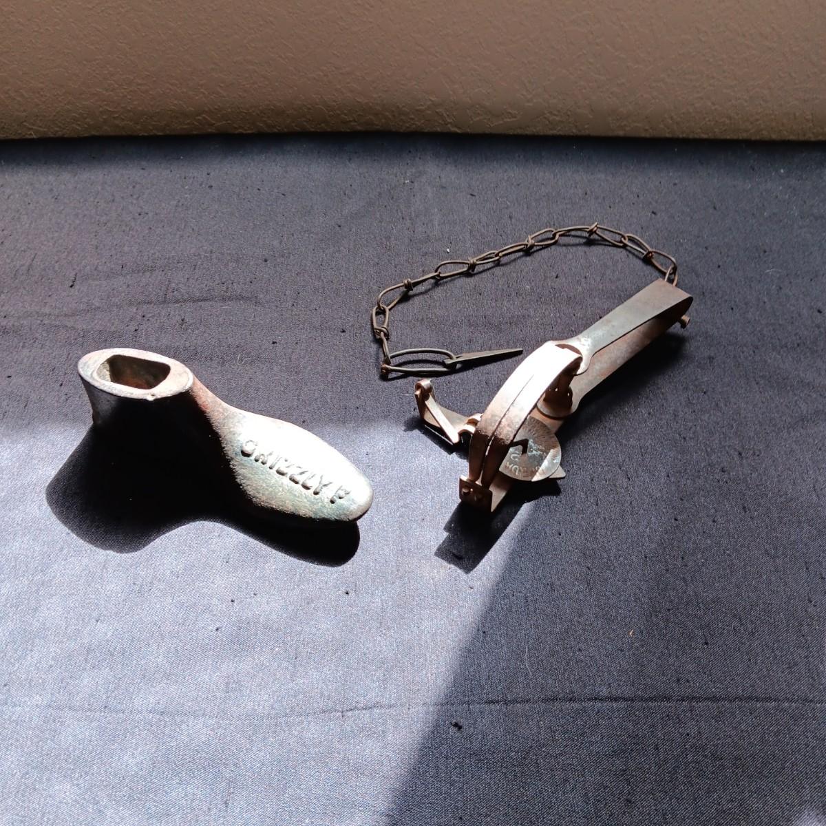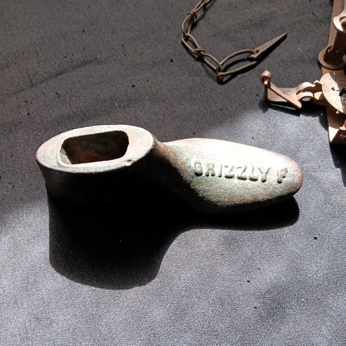 GRIZZLY CAST IRON SHOE FORM AND AN OLD ANIMAL TRAP