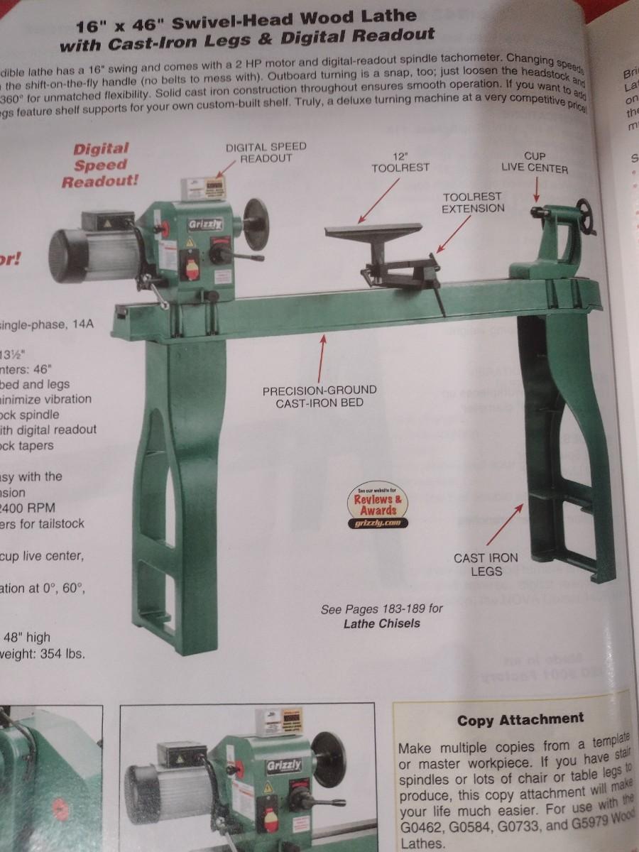 Grizzly Industrial, Inc. Swivel Head Wood Lathe with Digital Readout and Copy Attachment New in Box 16"x 46" Single Phase 110V. Item was never opened once delivered. Bring assistance to remove from shop.