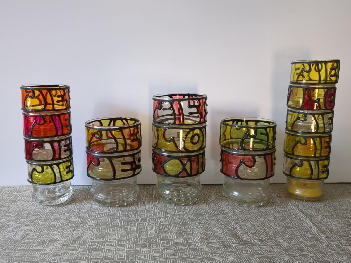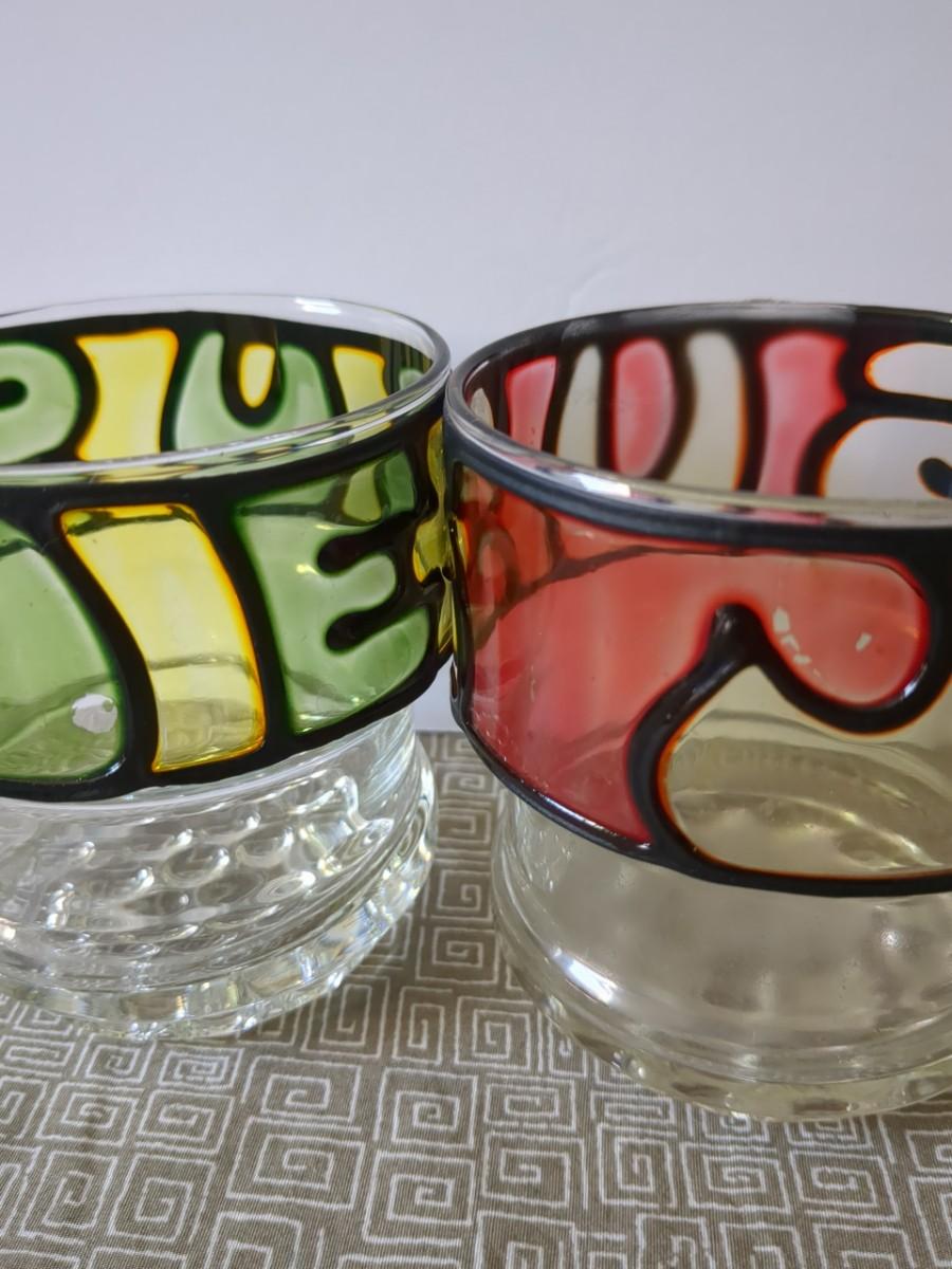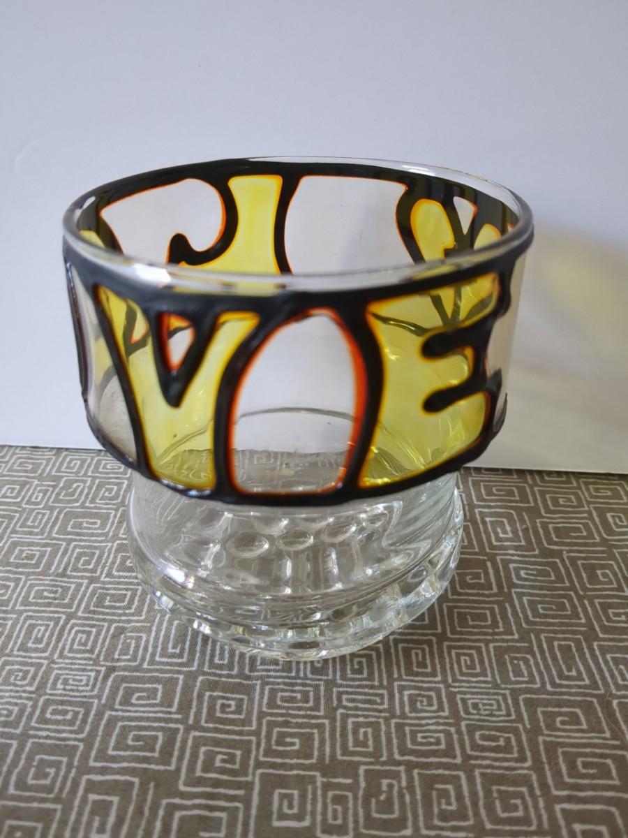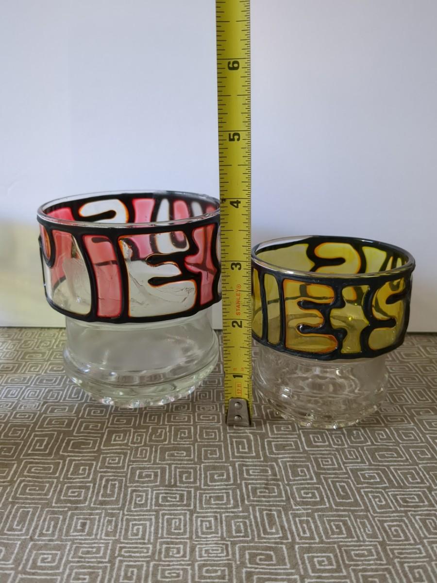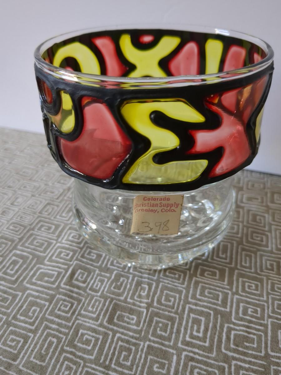 (9) 6oz glasses (7) 9oz glasses. All feature a fun faux stained glass top, some say Jesus and some say Love with a heart. There is also one outlier with letters I can't make out. One has a candle in the bottom, others have original tags still on them from store purchased from. No cracks, chips or other flaws to glass. One piece is noted to have chipped "stain"
