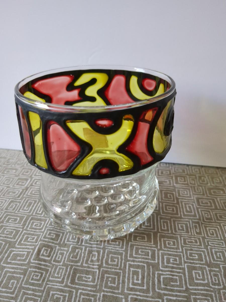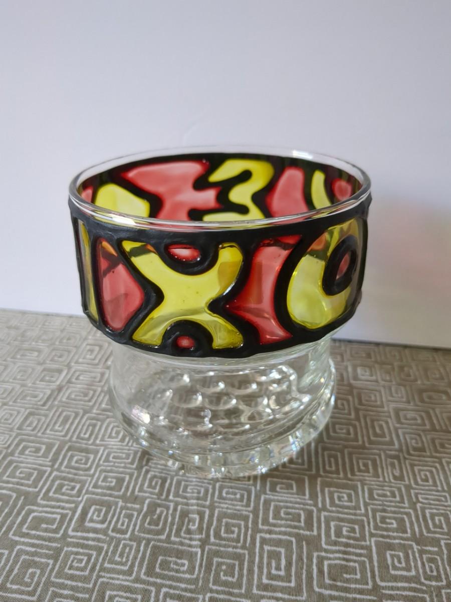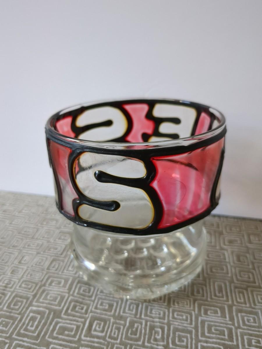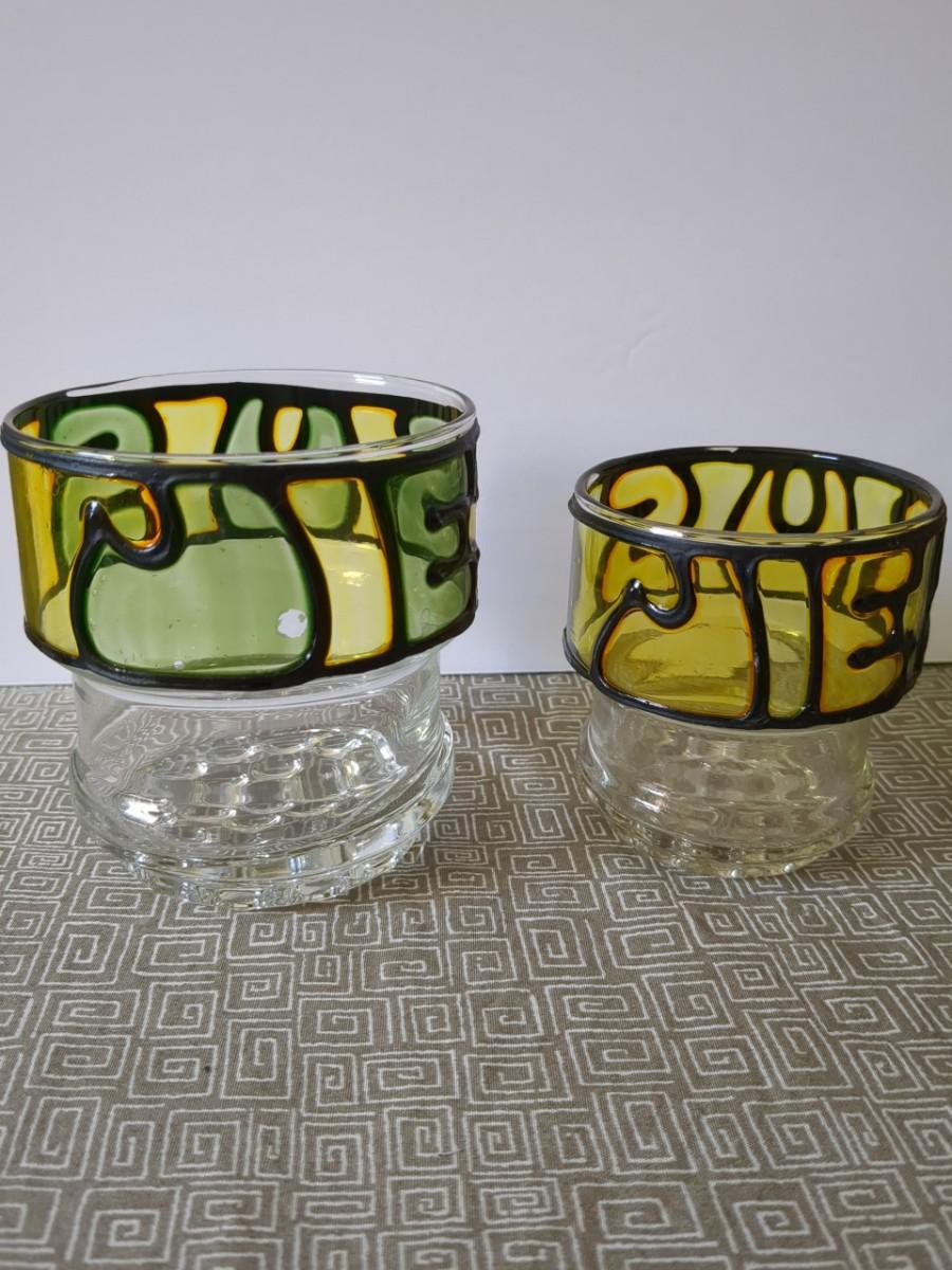 (9) 6oz glasses (7) 9oz glasses. All feature a fun faux stained glass top, some say Jesus and some say Love with a heart. There is also one outlier with letters I can't make out. One has a candle in the bottom, others have original tags still on them from store purchased from. No cracks, chips or other flaws to glass. One piece is noted to have chipped "stain"