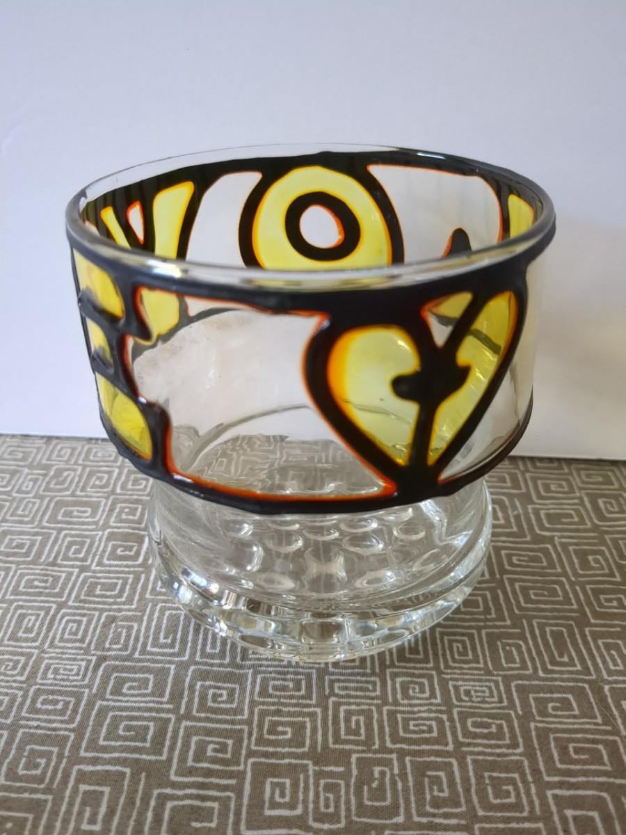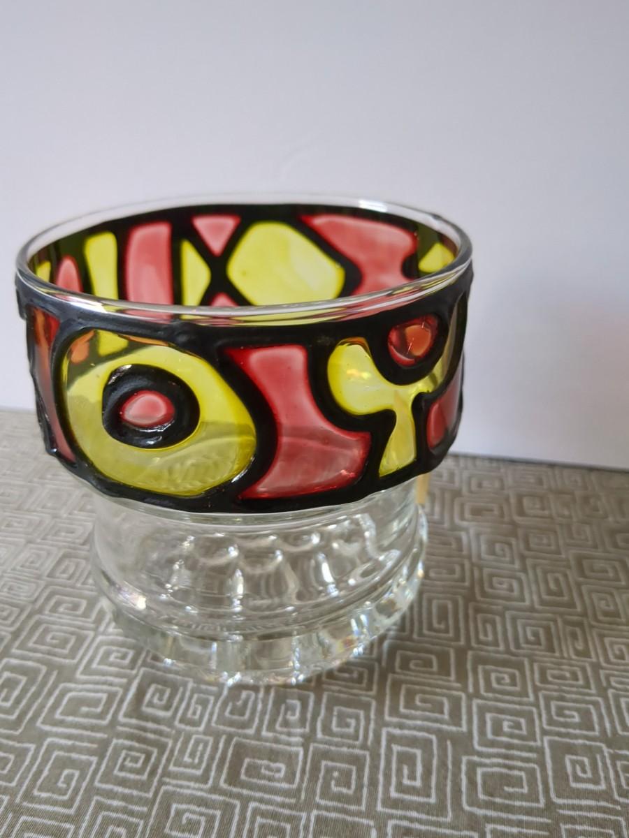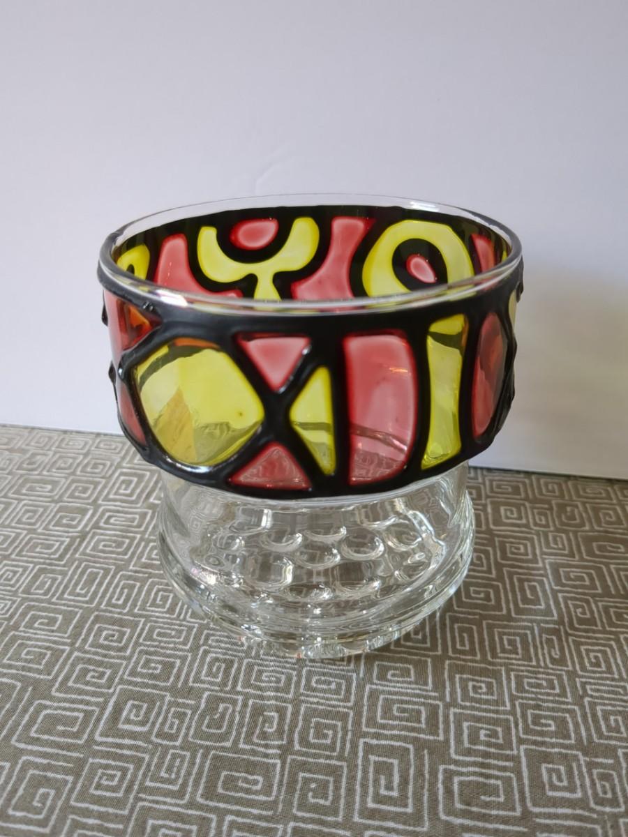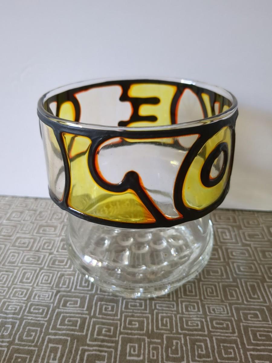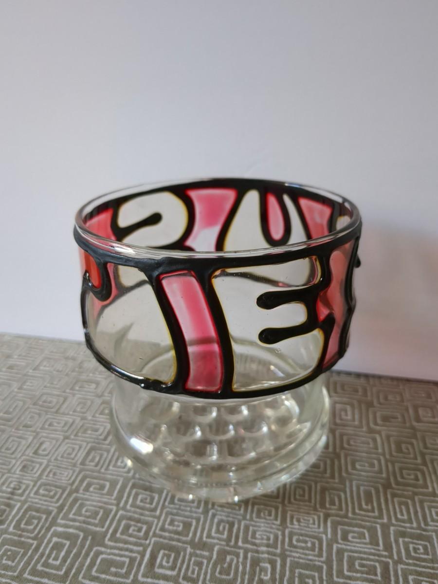 (9) 6oz glasses (7) 9oz glasses. All feature a fun faux stained glass top, some say Jesus and some say Love with a heart. There is also one outlier with letters I can't make out. One has a candle in the bottom, others have original tags still on them from store purchased from. No cracks, chips or other flaws to glass. One piece is noted to have chipped "stain"