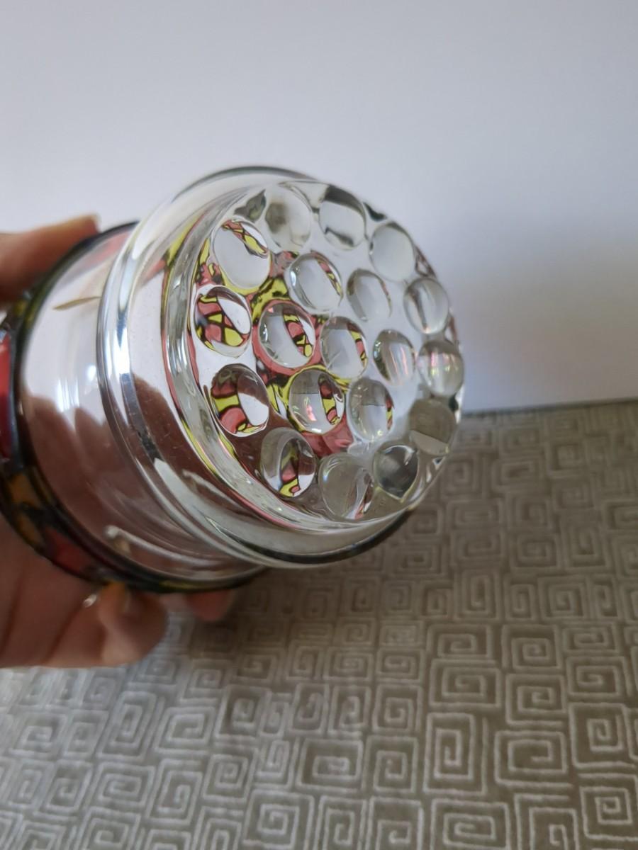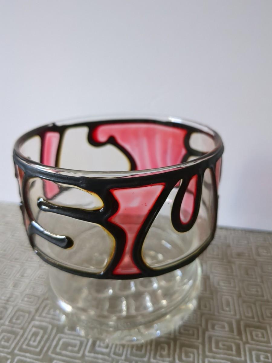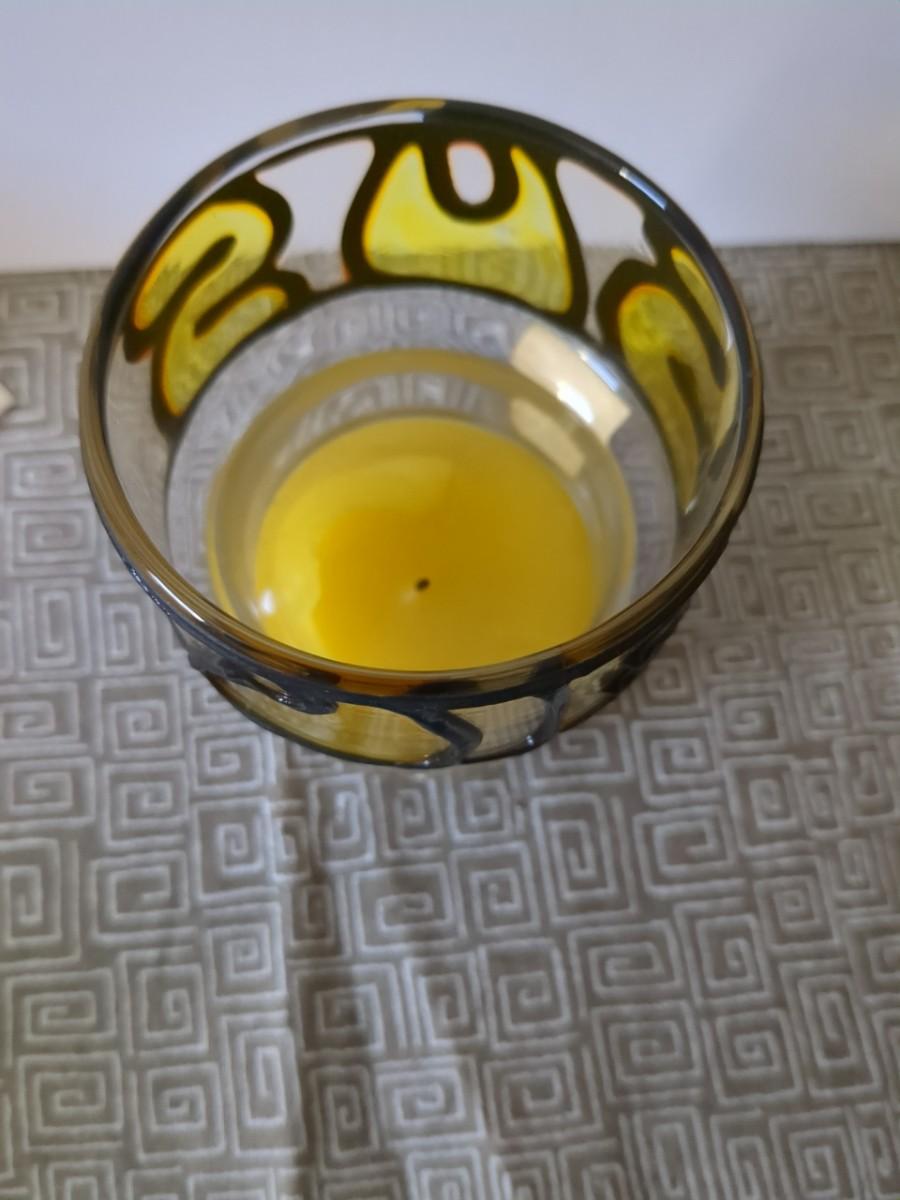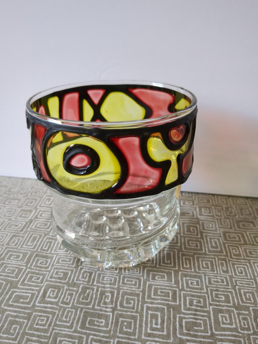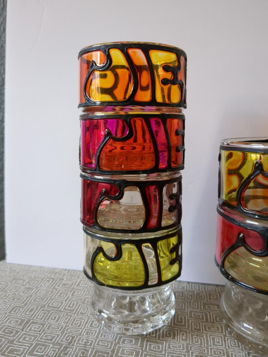 (9) 6oz glasses (7) 9oz glasses. All feature a fun faux stained glass top, some say Jesus and some say Love with a heart. There is also one outlier with letters I can't make out. One has a candle in the bottom, others have original tags still on them from store purchased from. No cracks, chips or other flaws to glass. One piece is noted to have chipped "stain"