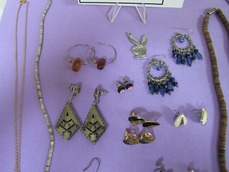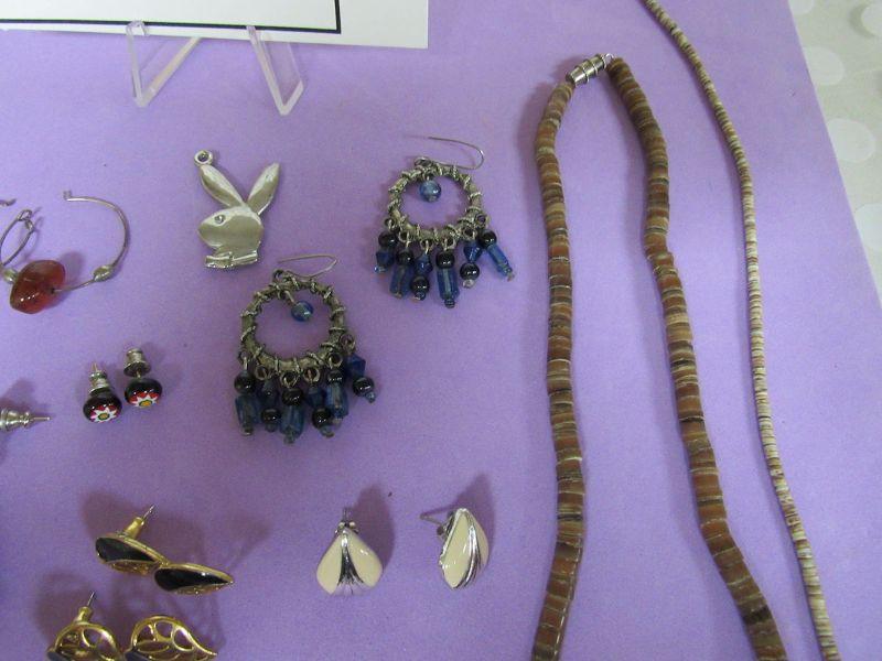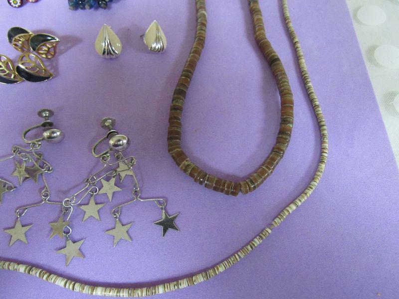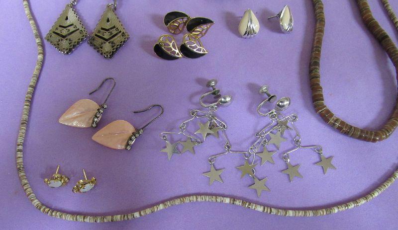 1970s Heishi shell necklace, string of Heishi shell beads, hoop earrings with amber embelishments, dangle earrings, tiny opal earrings with no backs, parrot necklace, groovy Coro dangle stars earrings. A really retro lot. Shipping is available on this lot at actual shipping cost plus a $5.00 handling fee.