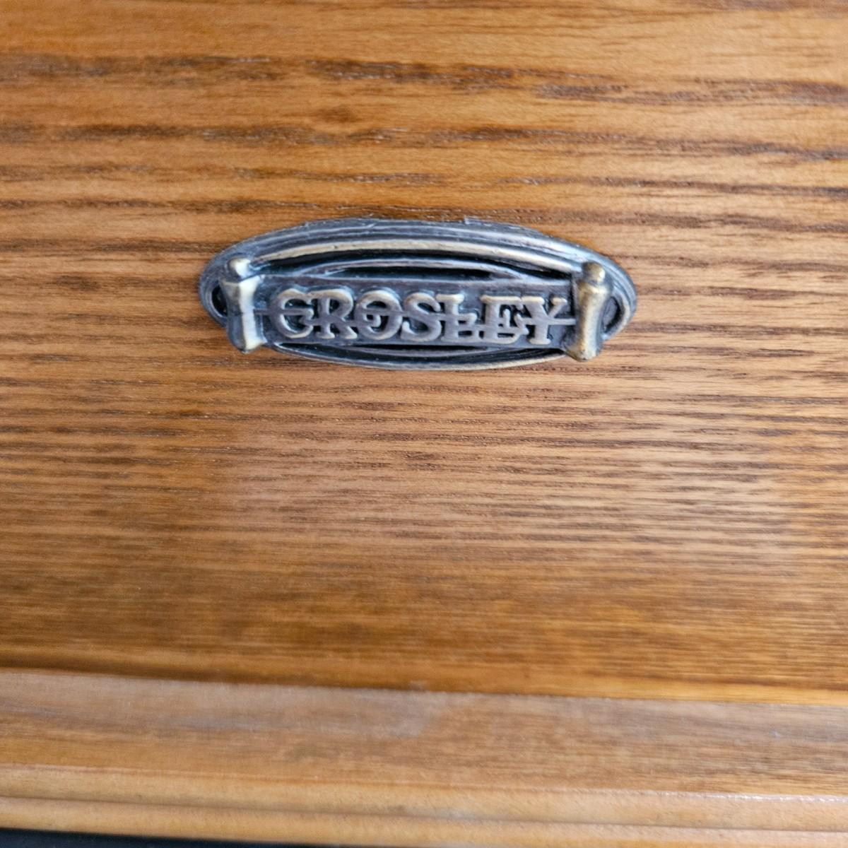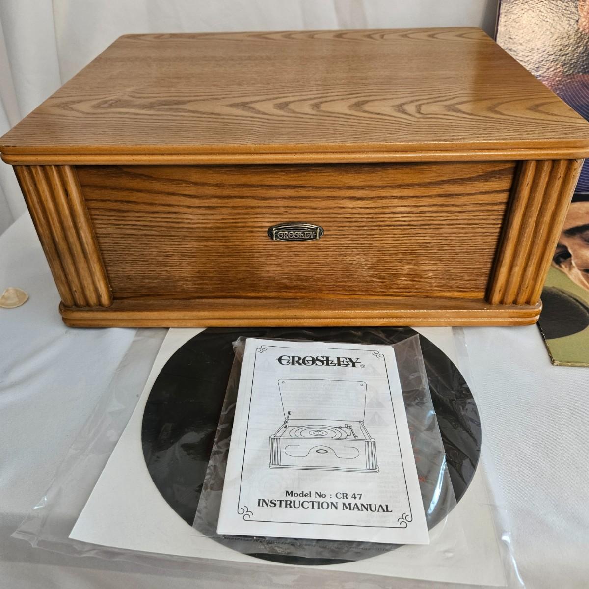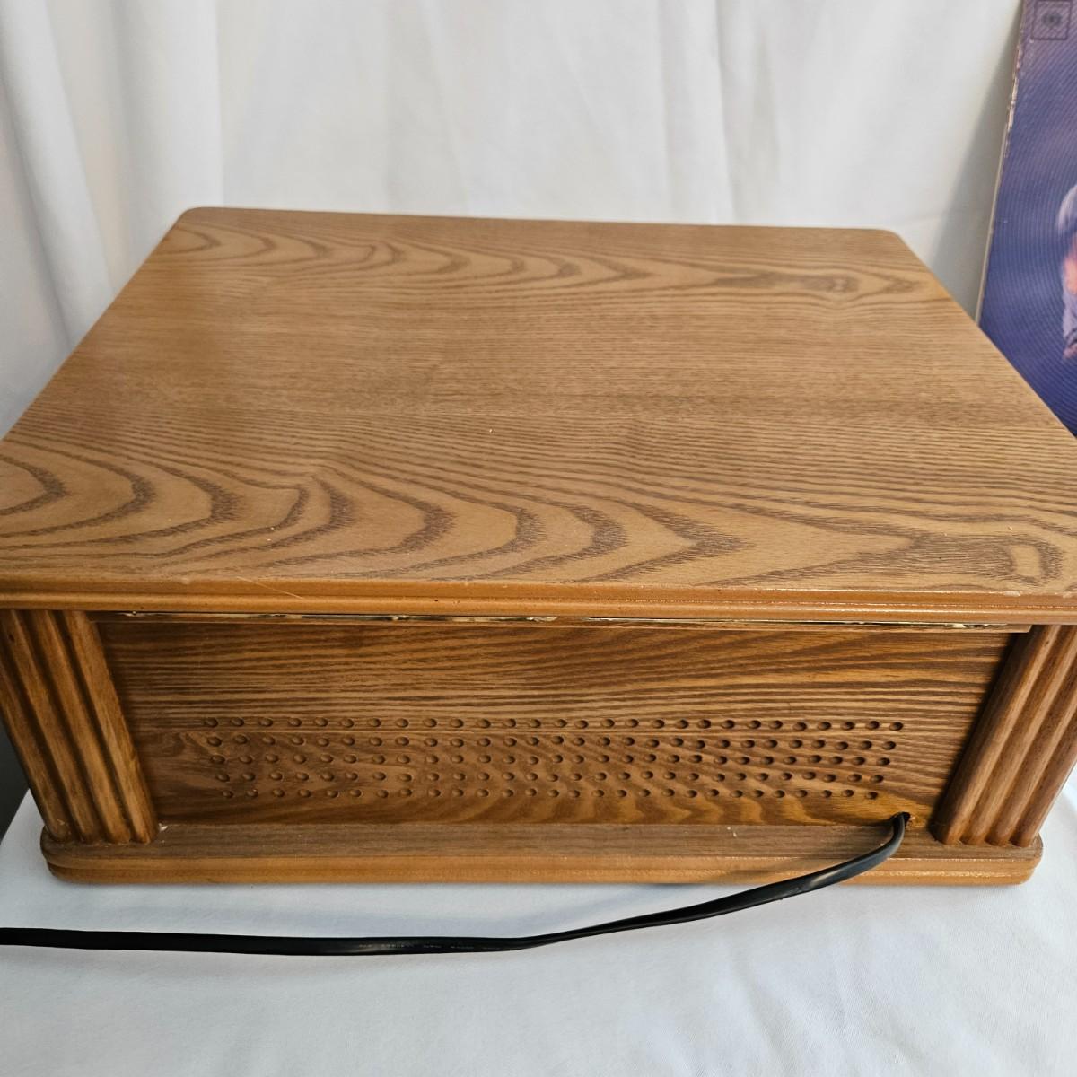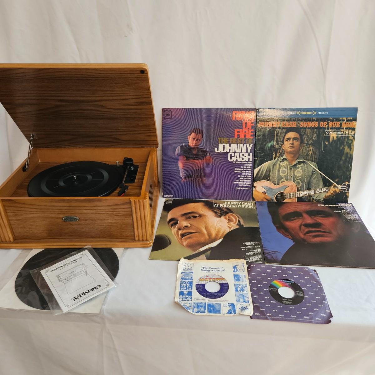 A Crosley turntable that powered on when plugged in. It is made of engineered wood with a faux wood veneer and measures approximately 17 5" x 14.5" x 7.5"H. Also includes over 25 LP records by artists like Johnny Cash. Tanya Tucker, John Denver and more. A can of Le-Bo record cleaner is also included. All sales are final. No returns or refunds. Please bid accordingly. Shipping available