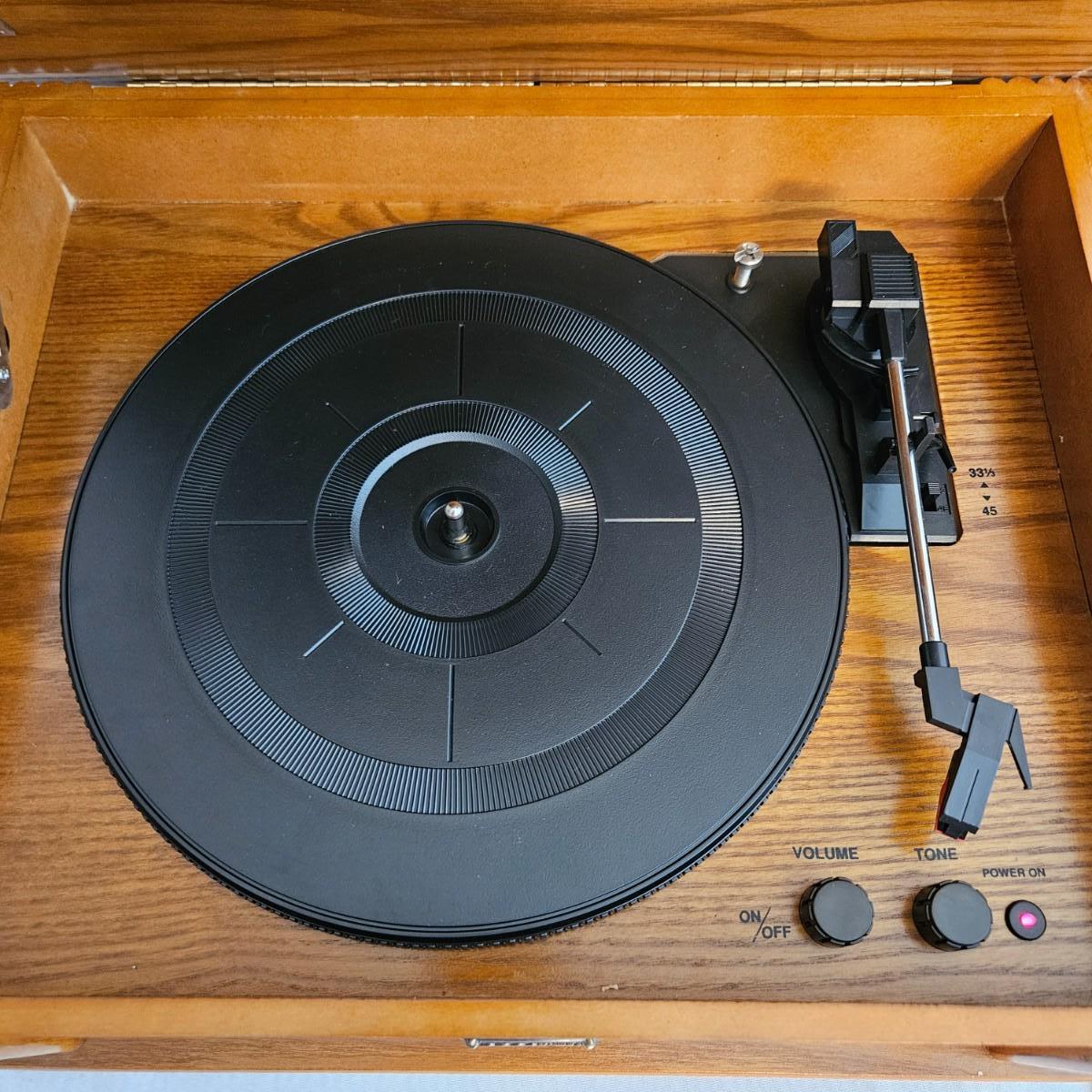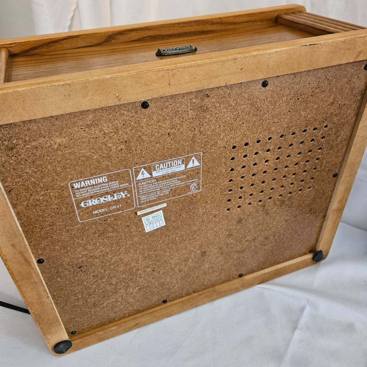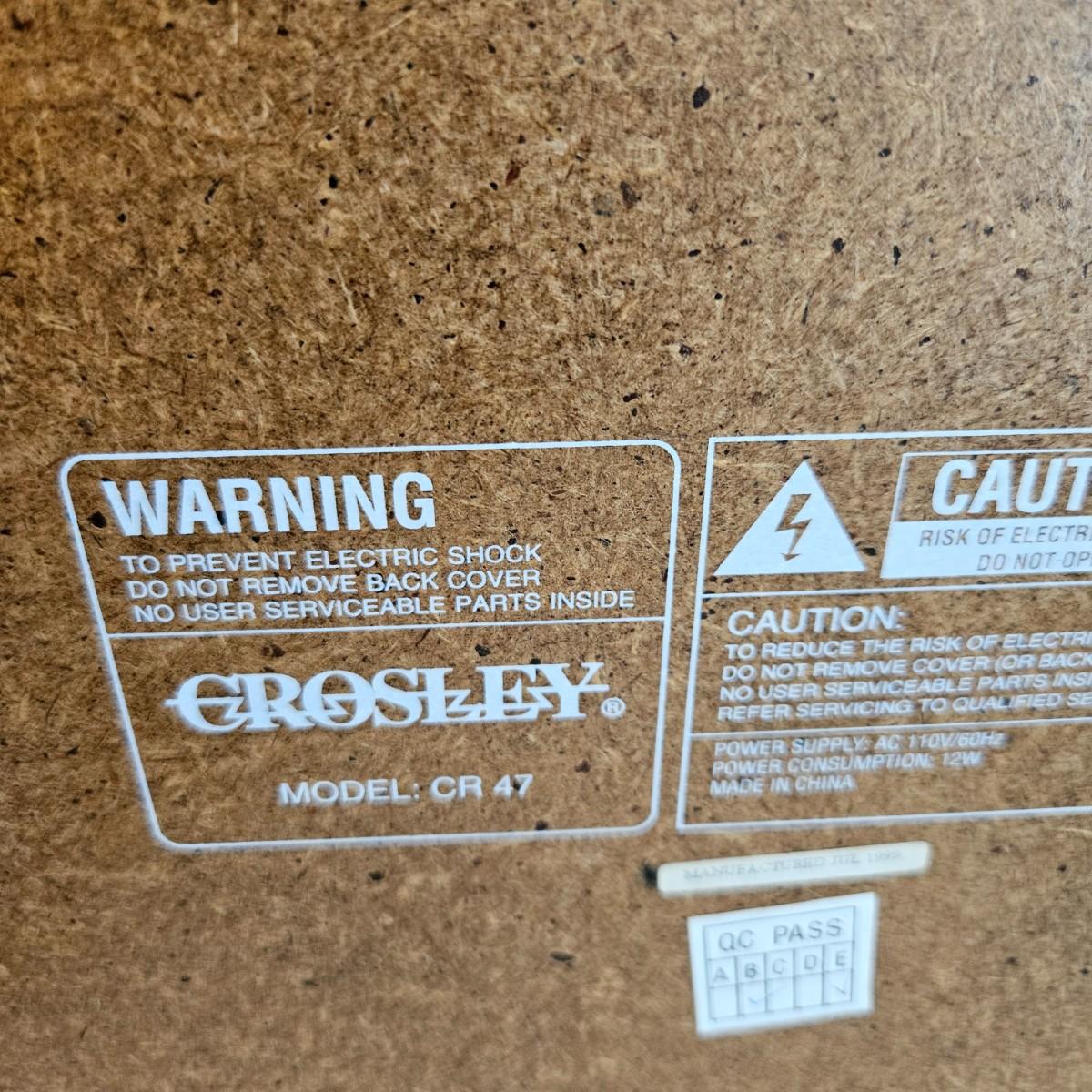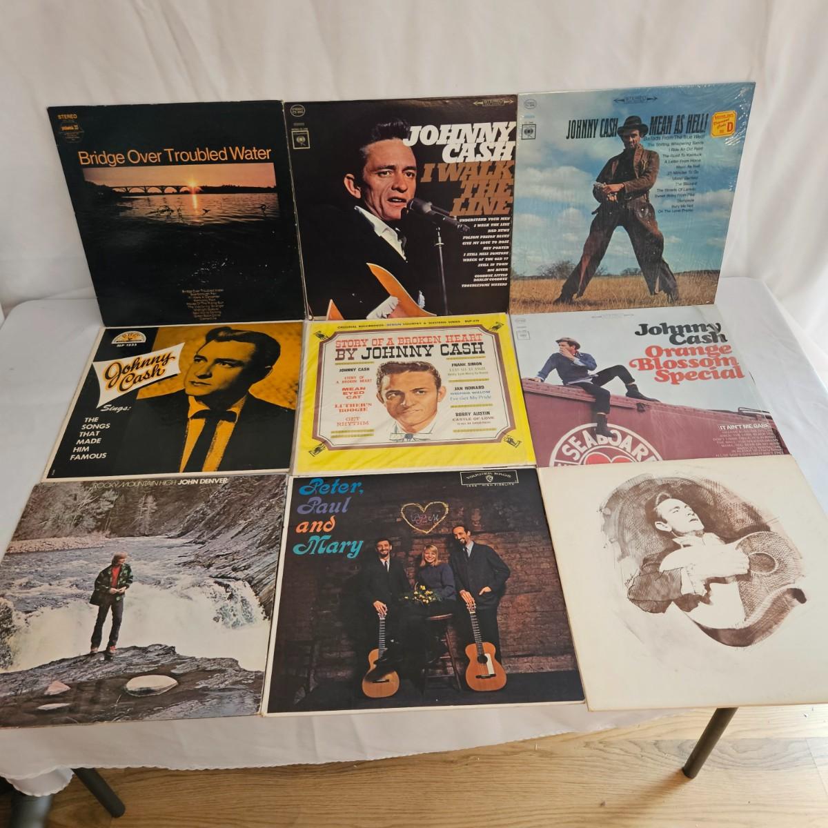 A Crosley turntable that powered on when plugged in. It is made of engineered wood with a faux wood veneer and measures approximately 17 5" x 14.5" x 7.5"H. Also includes over 25 LP records by artists like Johnny Cash. Tanya Tucker, John Denver and more. A can of Le-Bo record cleaner is also included. All sales are final. No returns or refunds. Please bid accordingly. Shipping available