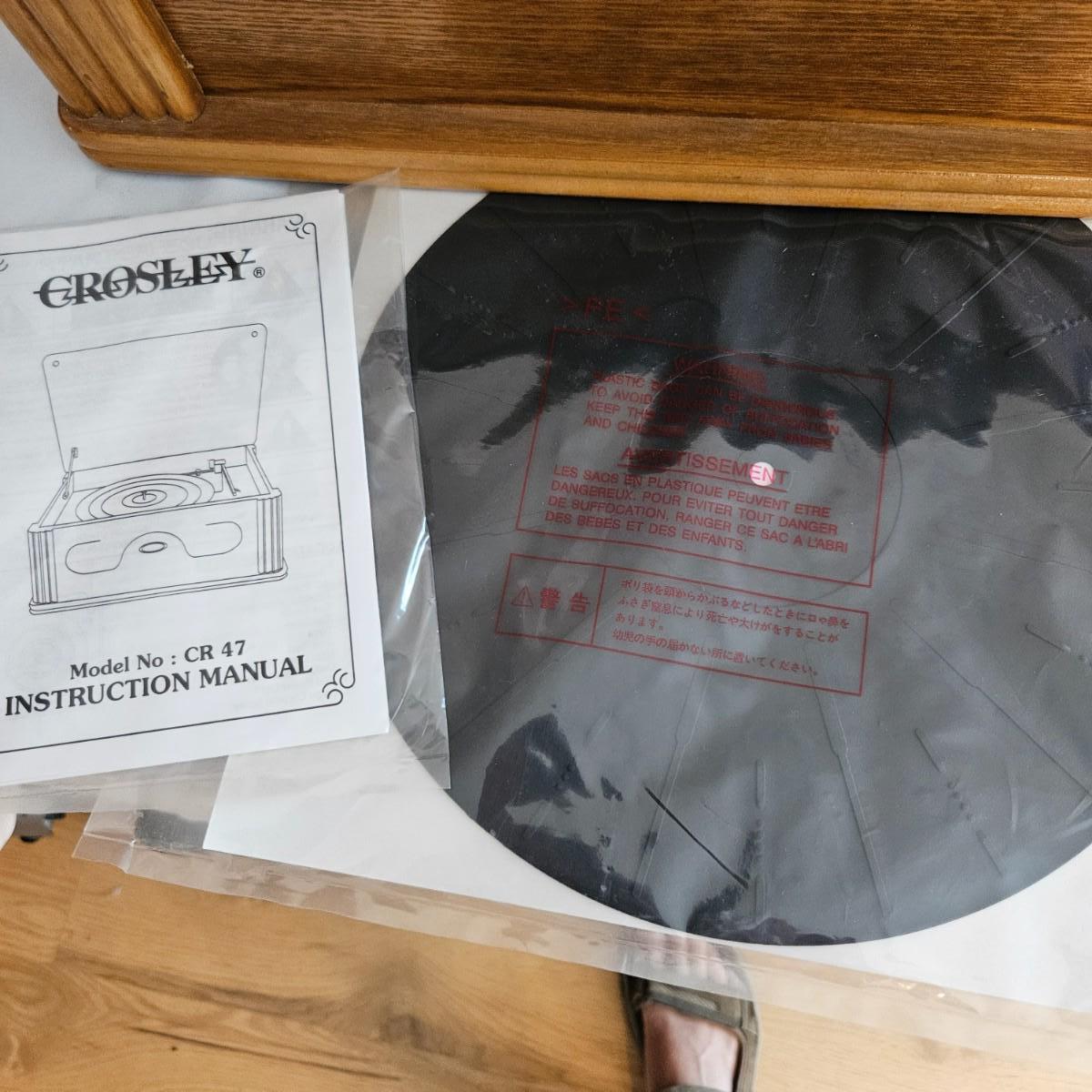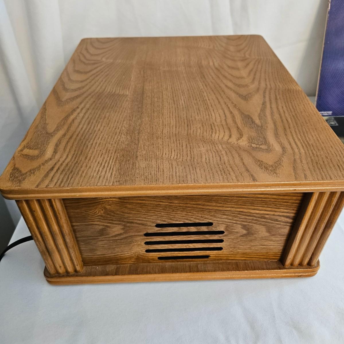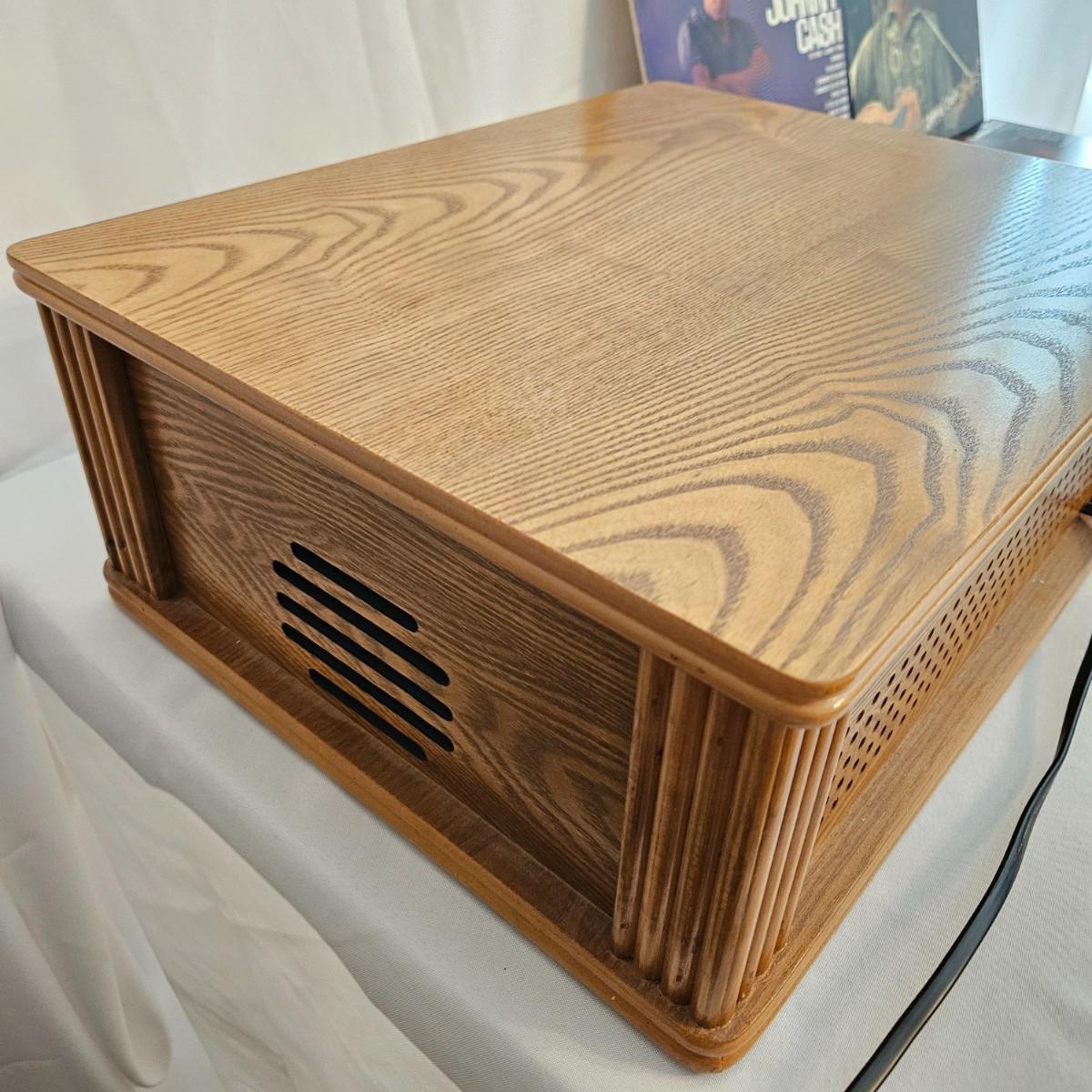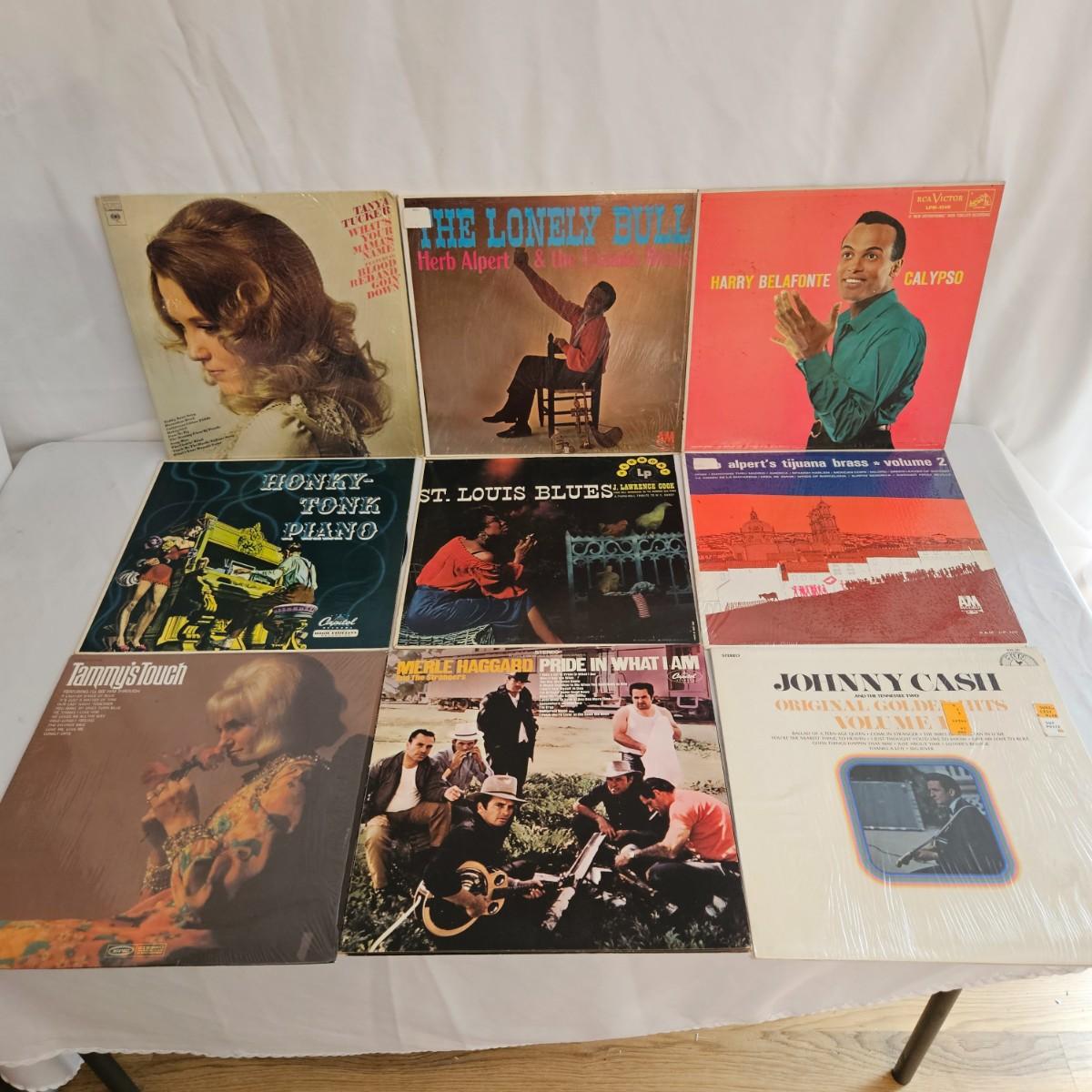 A Crosley turntable that powered on when plugged in. It is made of engineered wood with a faux wood veneer and measures approximately 17 5" x 14.5" x 7.5"H. Also includes over 25 LP records by artists like Johnny Cash. Tanya Tucker, John Denver and more. A can of Le-Bo record cleaner is also included. All sales are final. No returns or refunds. Please bid accordingly. Shipping available