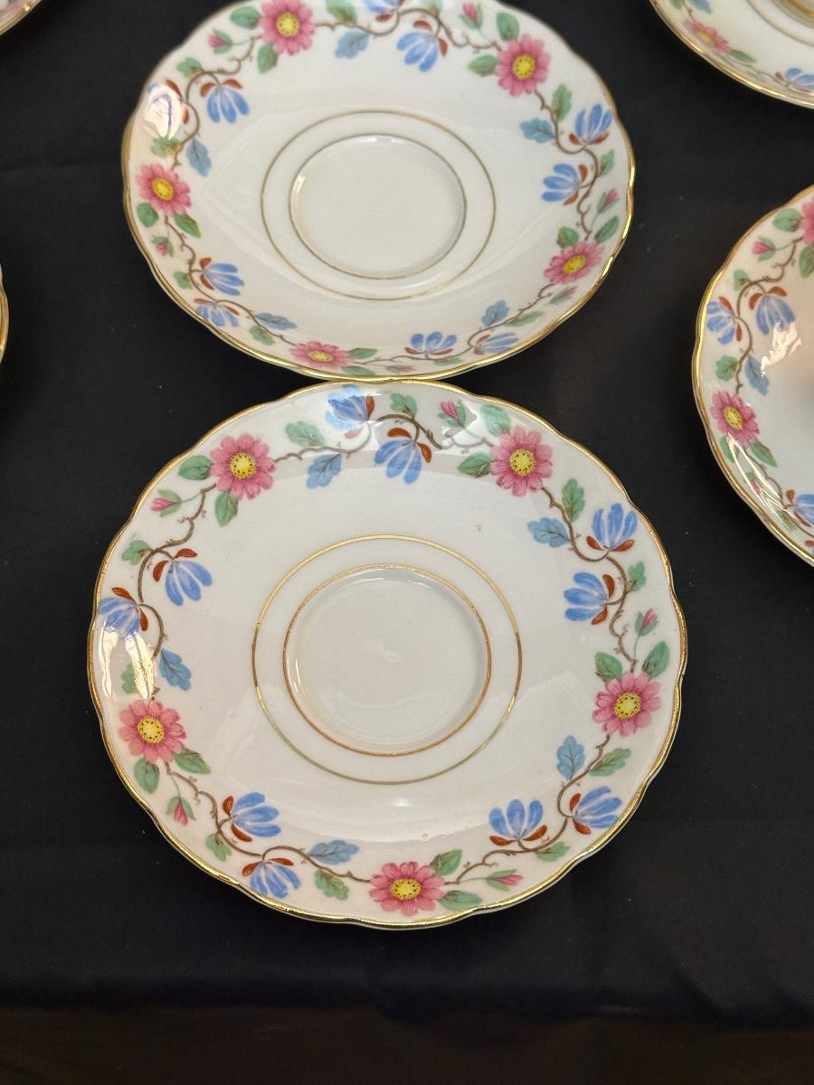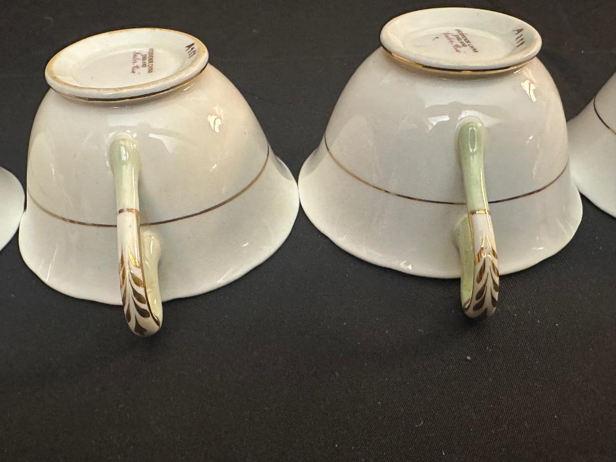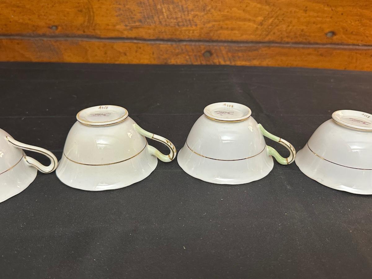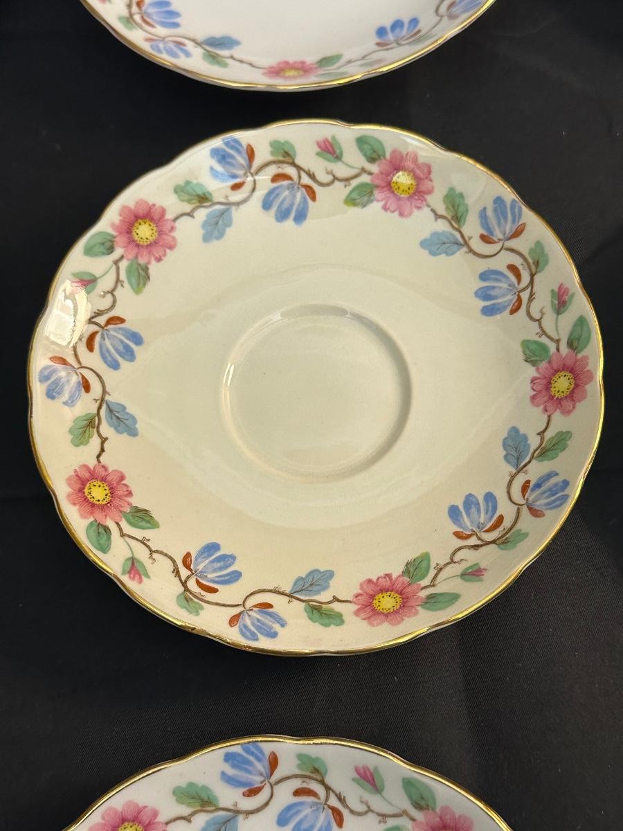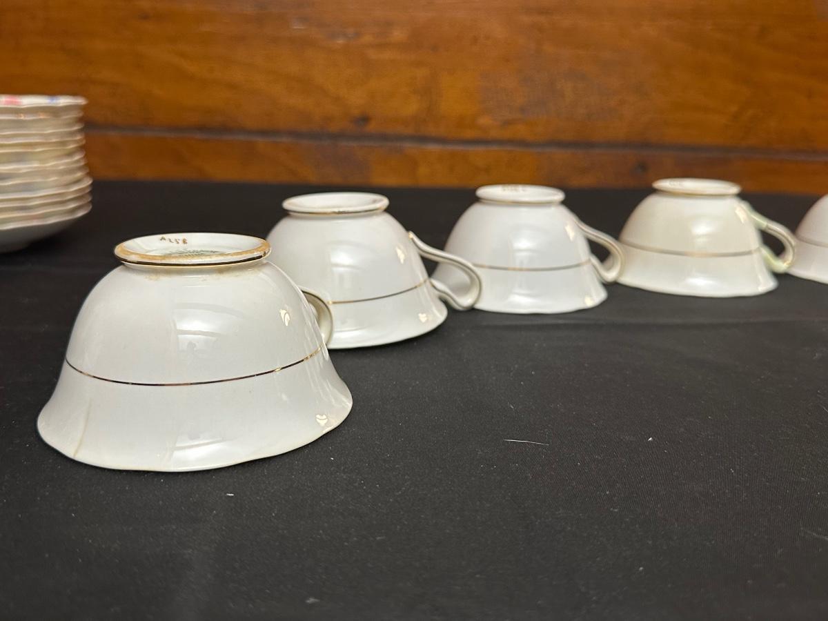 Beautiful china with some Patina. Three of the teacups have light green on the handle / Two of the plates do not have a double band (circle) in the middle.