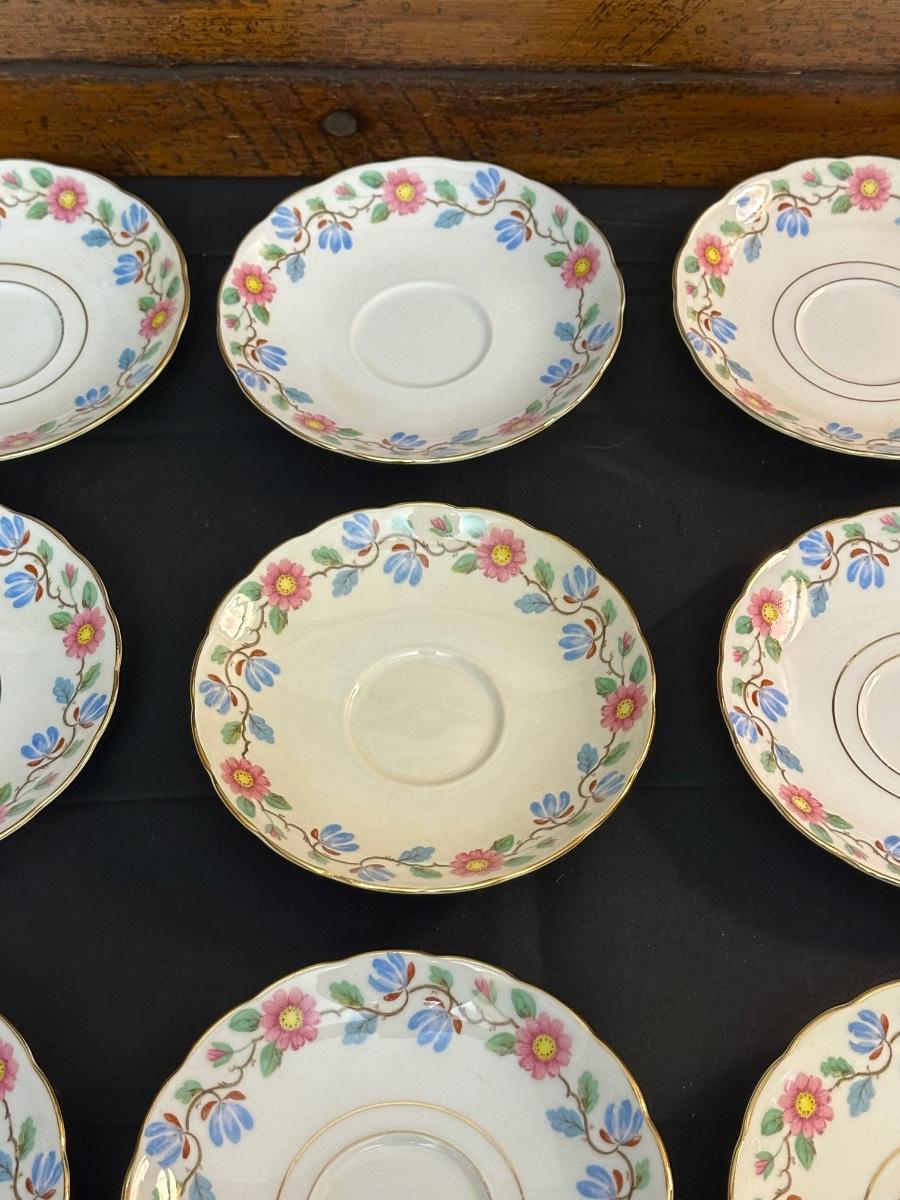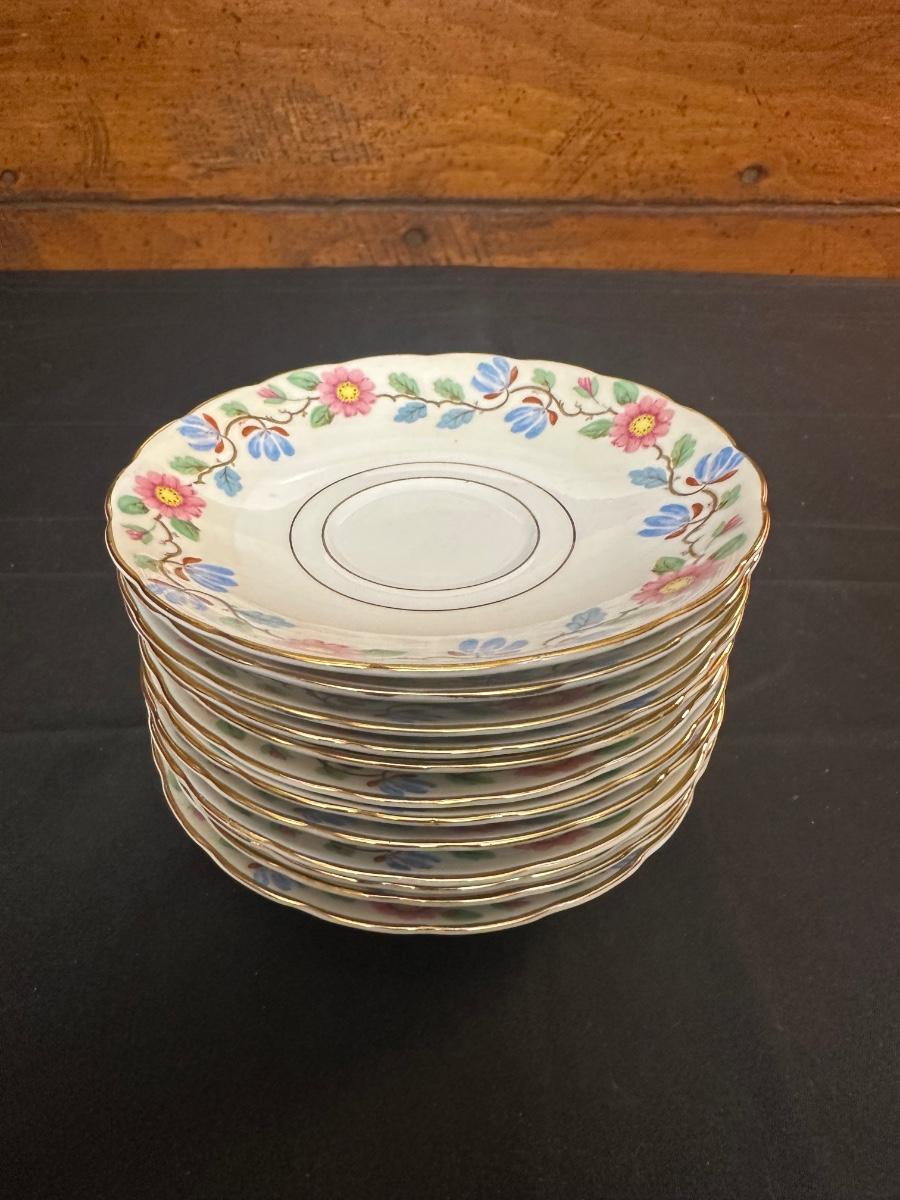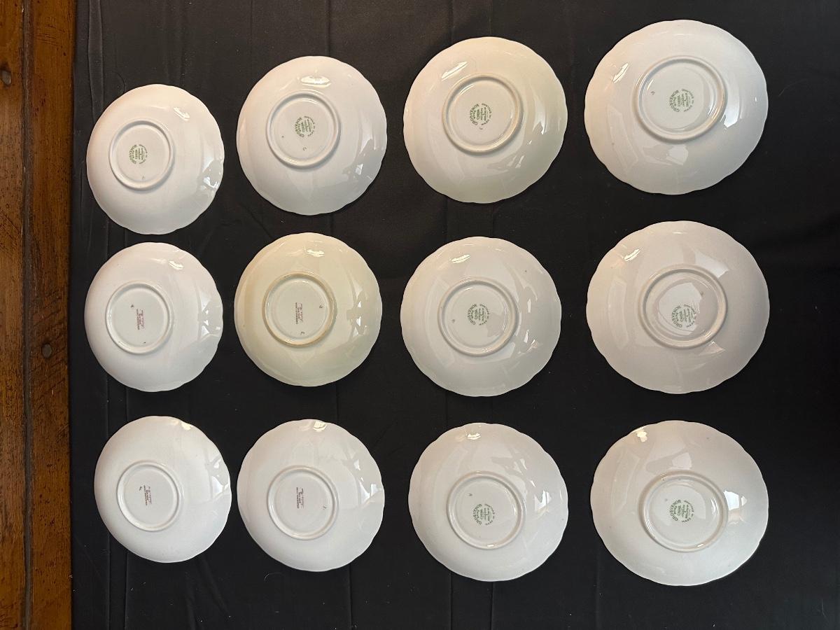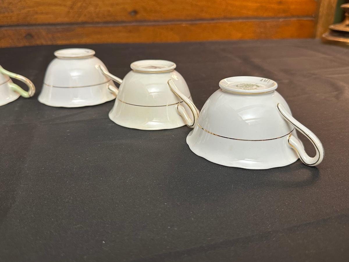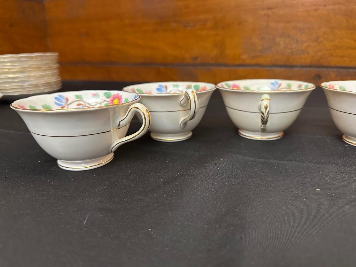 Beautiful china with some Patina. Three of the teacups have light green on the handle / Two of the plates do not have a double band (circle) in the middle.