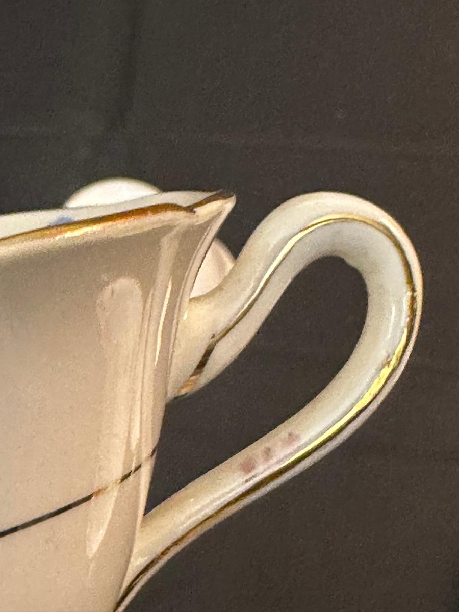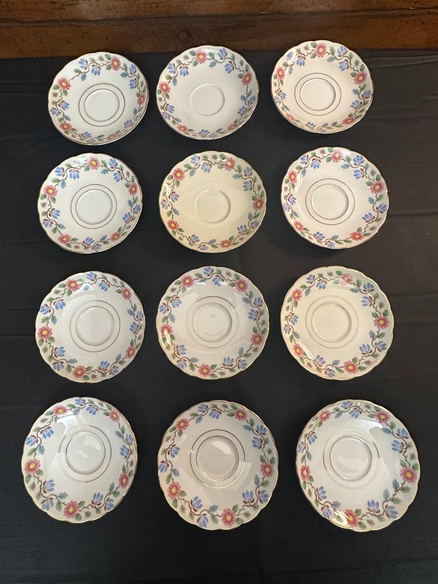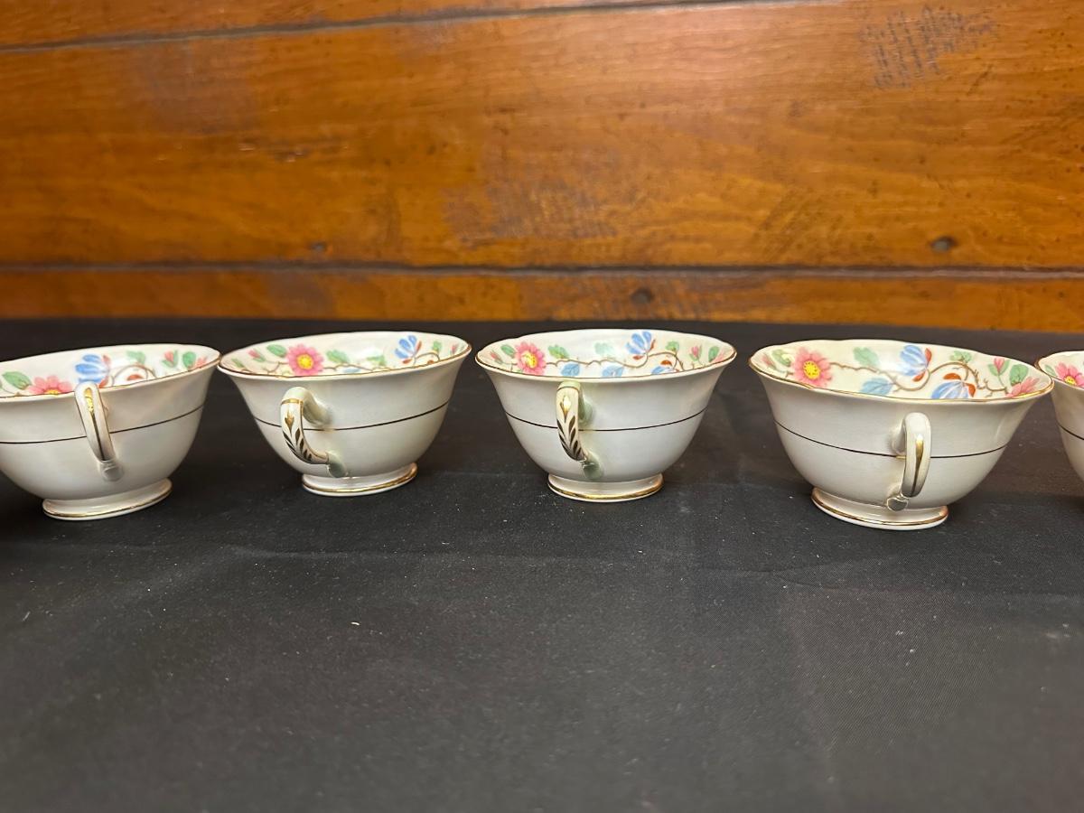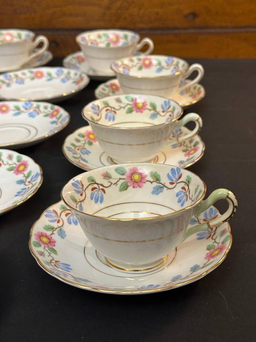 Beautiful china with some Patina. Three of the teacups have light green on the handle / Two of the plates do not have a double band (circle) in the middle.