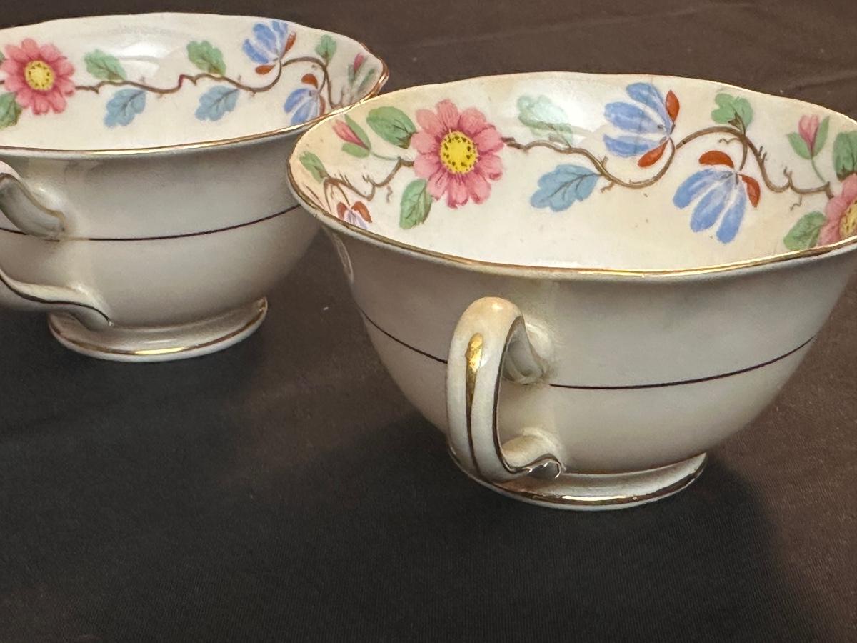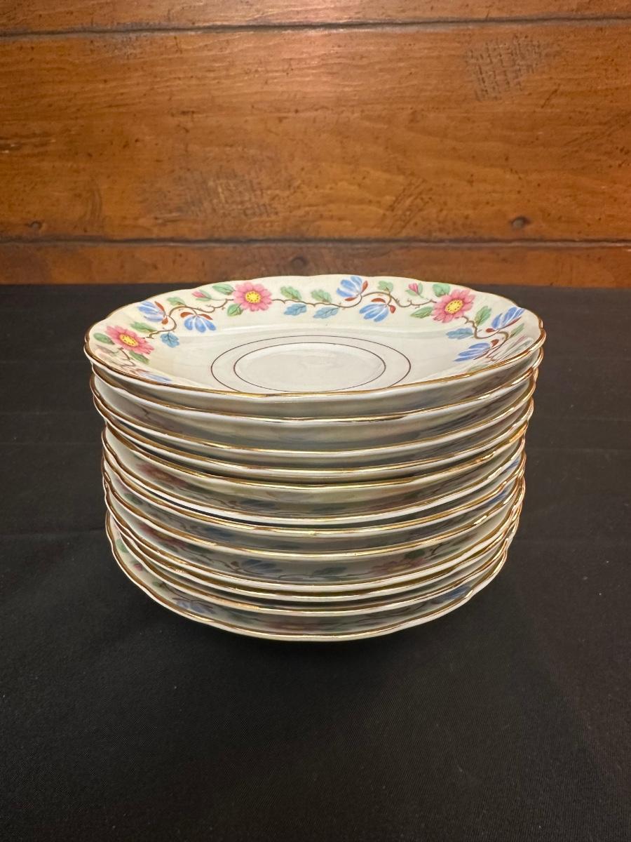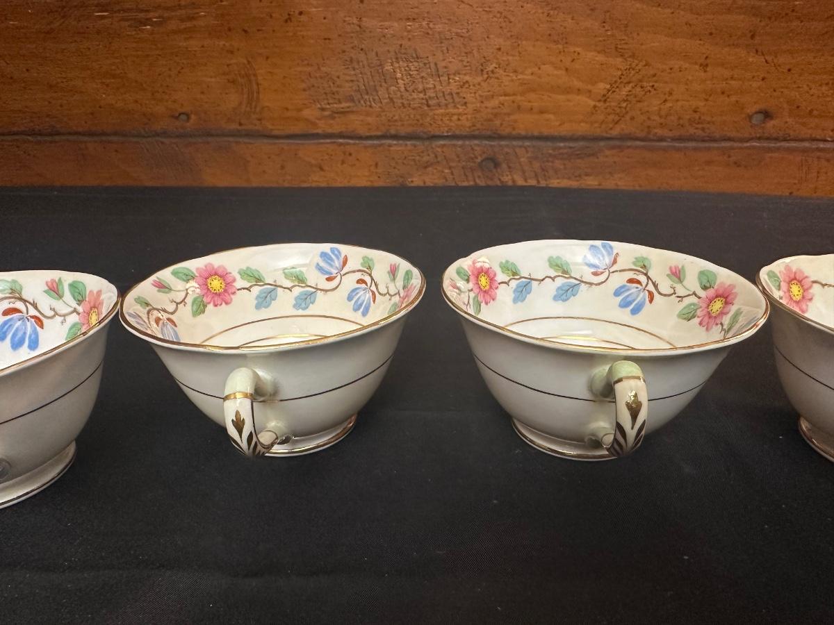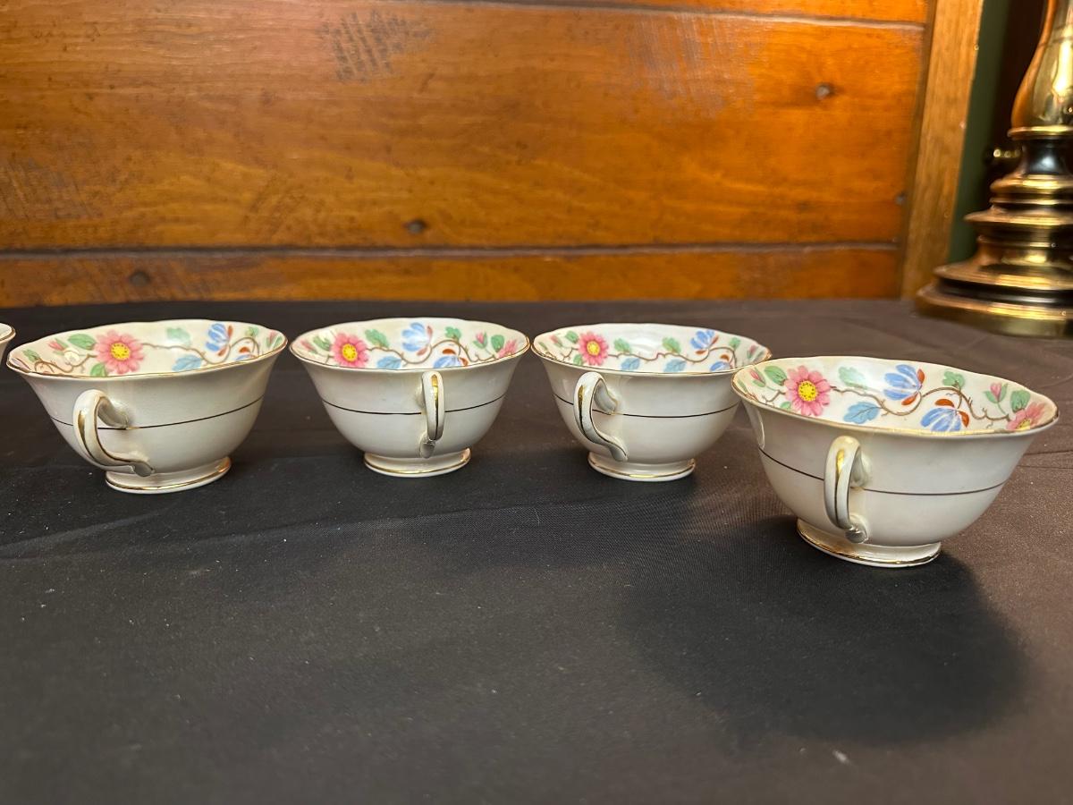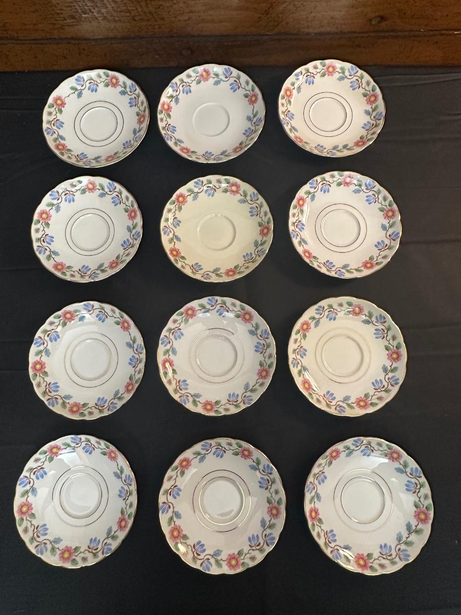 Beautiful china with some Patina. Three of the teacups have light green on the handle / Two of the plates do not have a double band (circle) in the middle.
